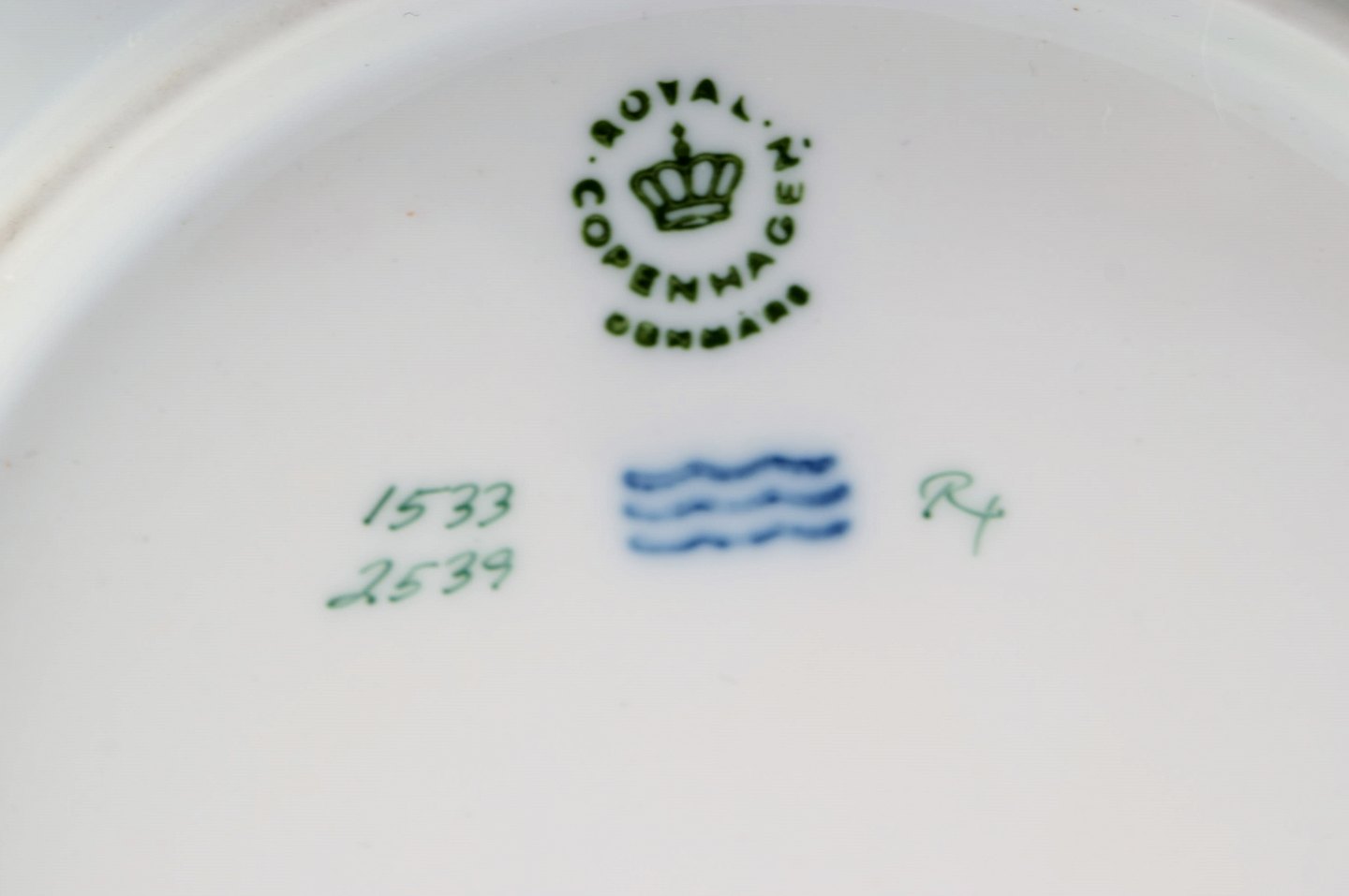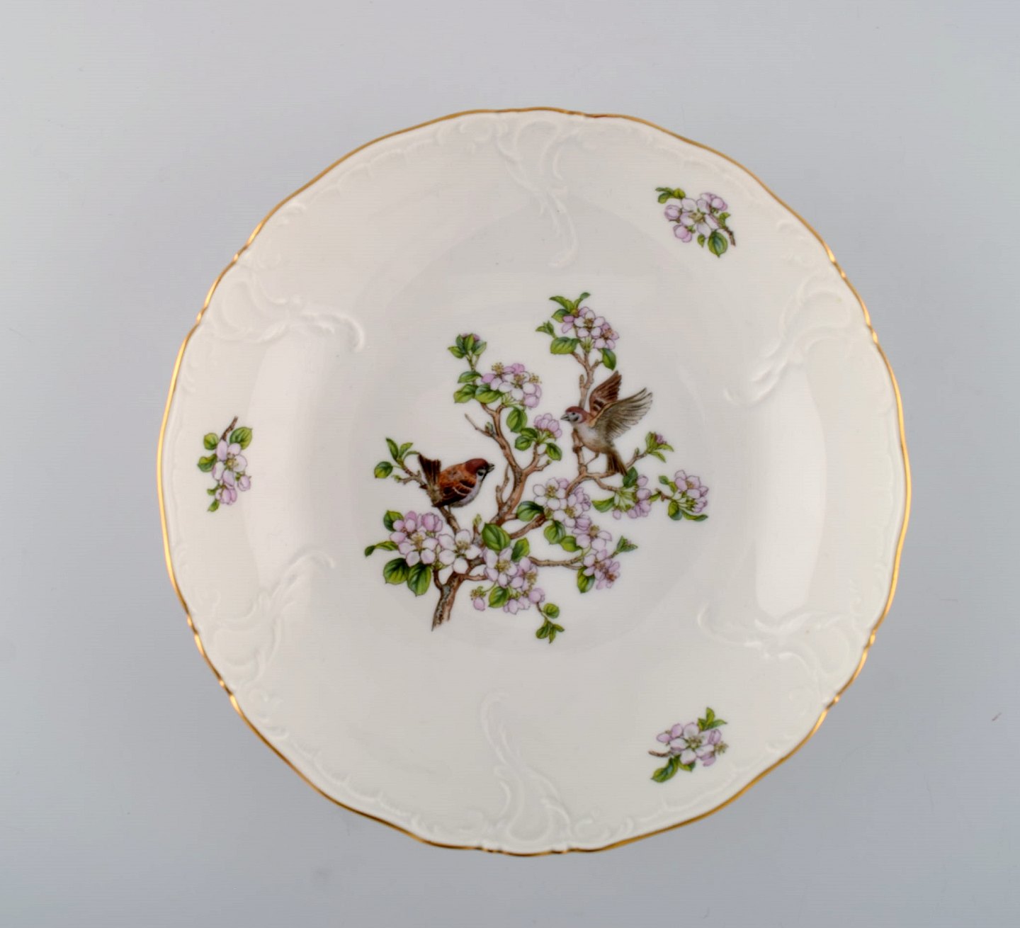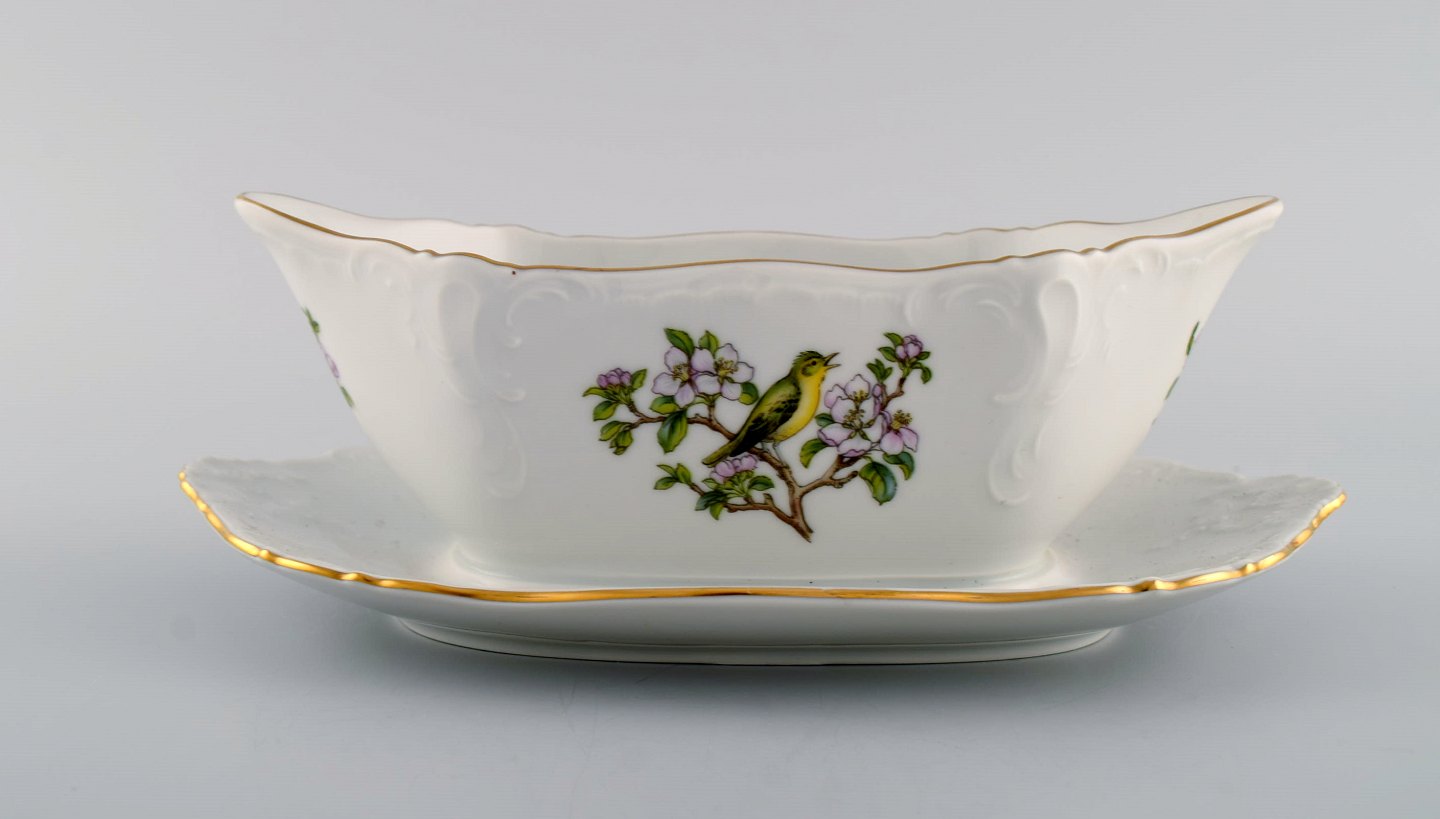 Royal Copenhagen "Forår" sovseskål og skål i porcelæn med motiver af fugle og bladværk. 1980'erne. Sovseskålen måler: 24 x 8,5 cm. Skålen måler: 21,5 x 5,5 cm. I flot stand. Stemplet.
