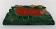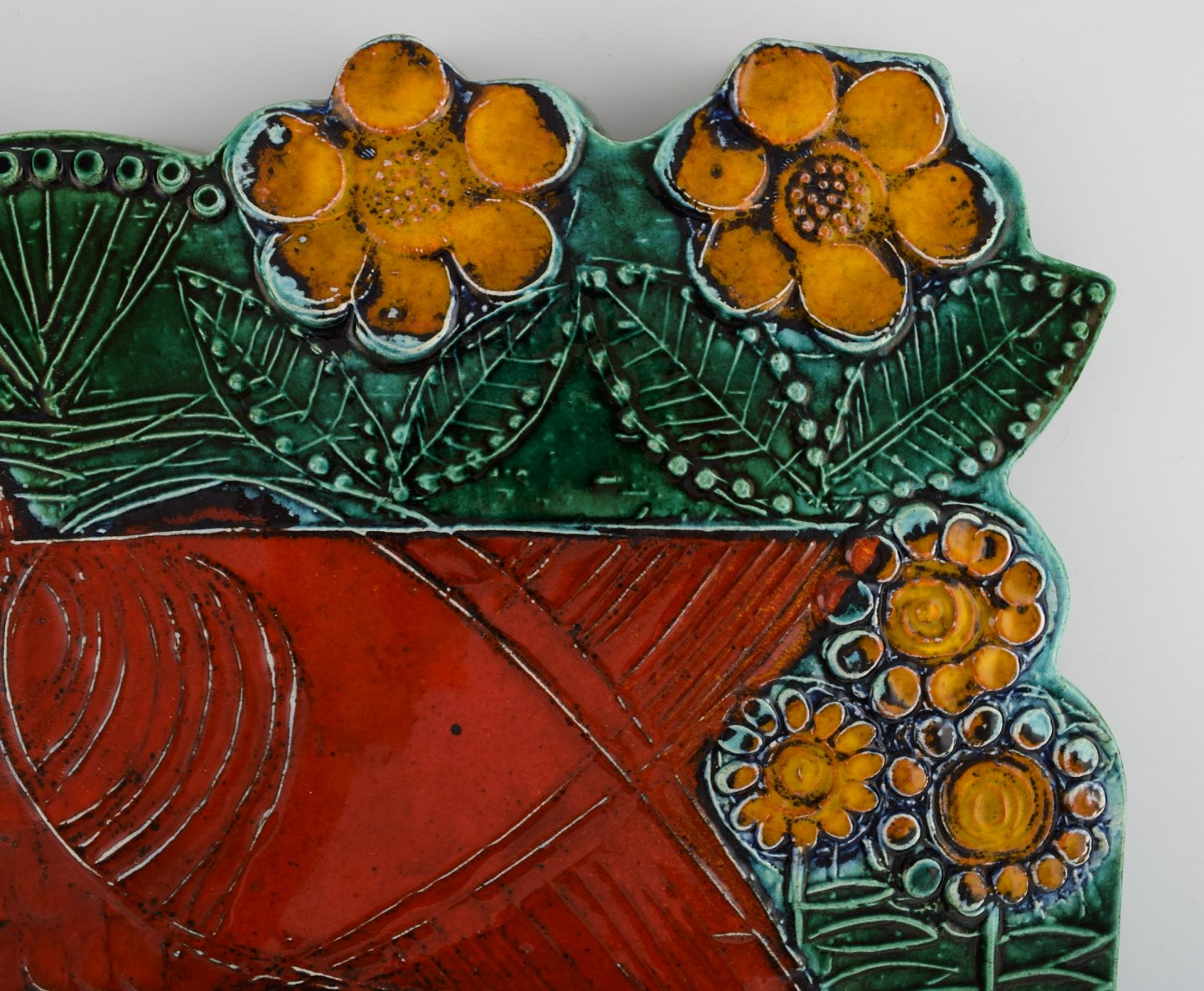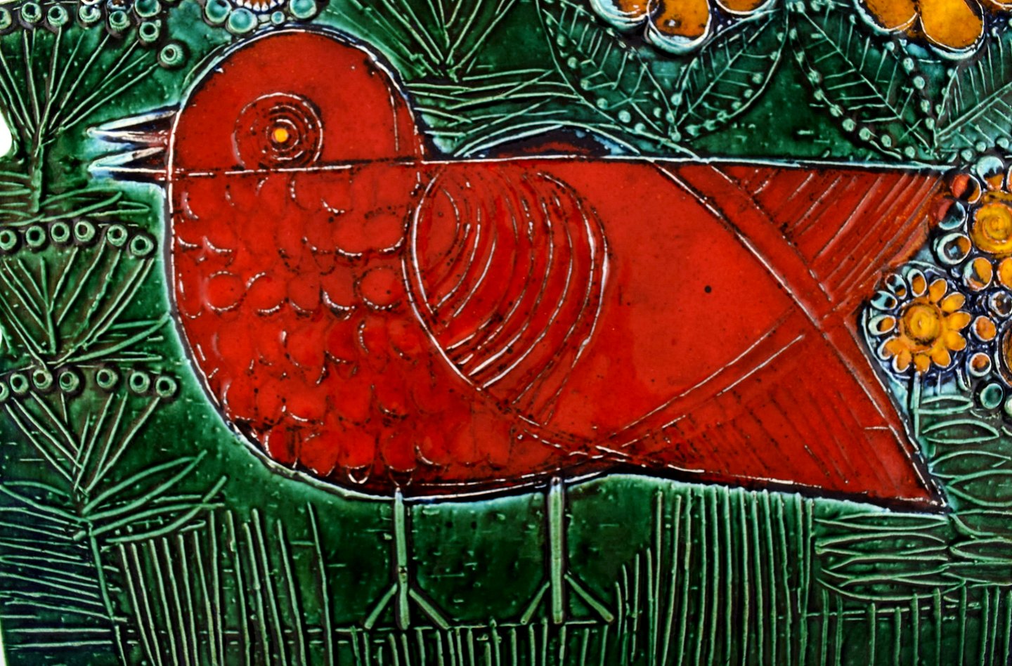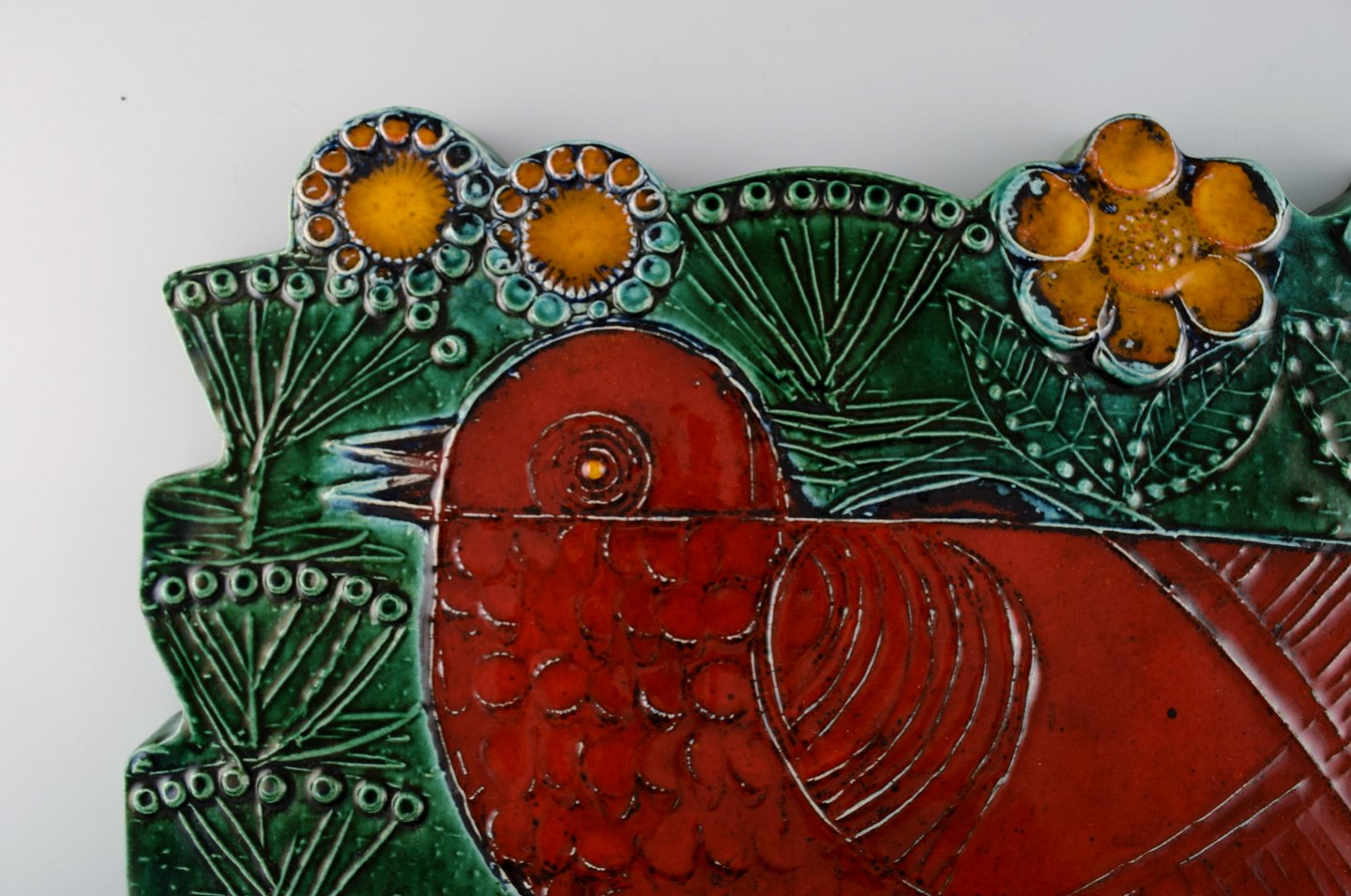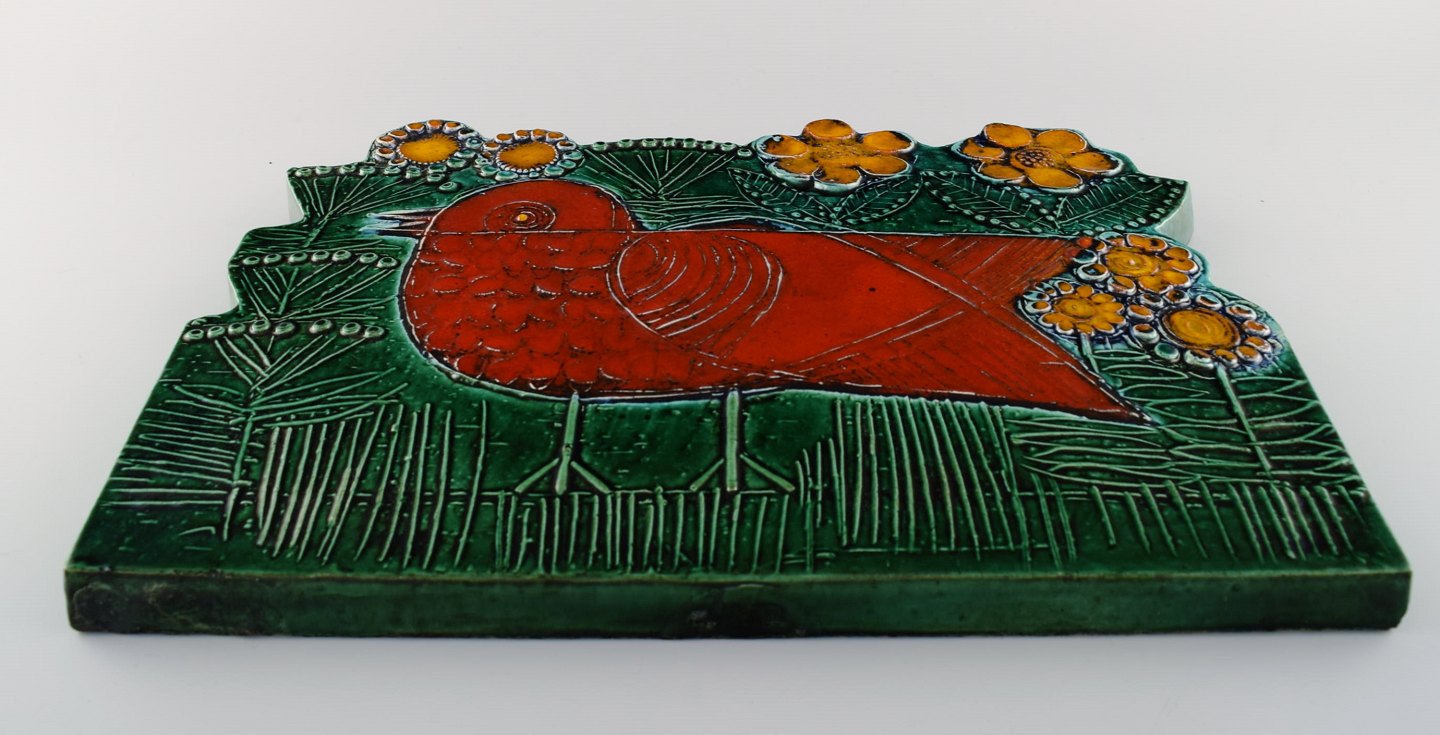 Lisa Larson for Gustavsberg. Stor og sjælden vægdekoration. Rød fugl på grøn baggrund. 1960'erne.
