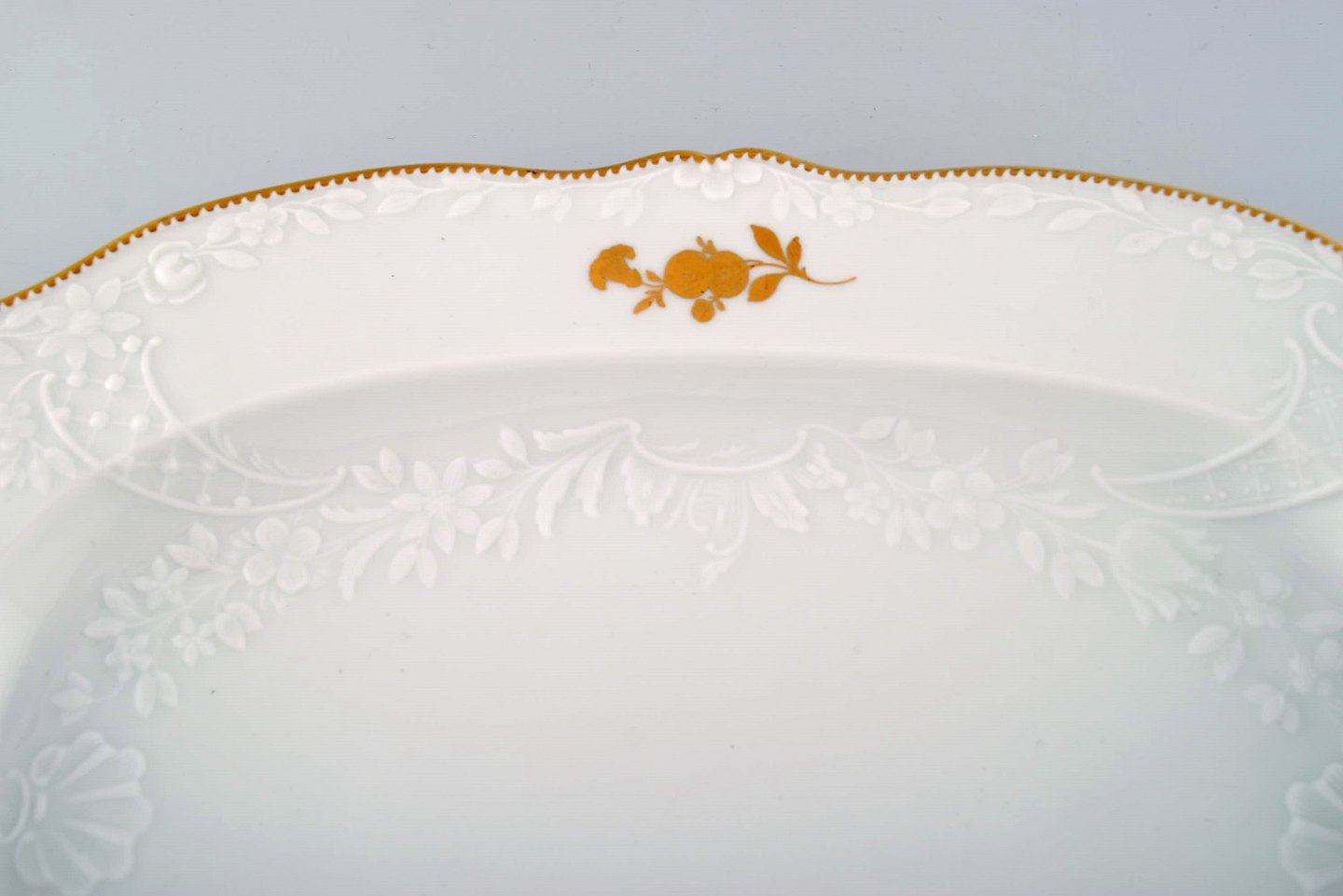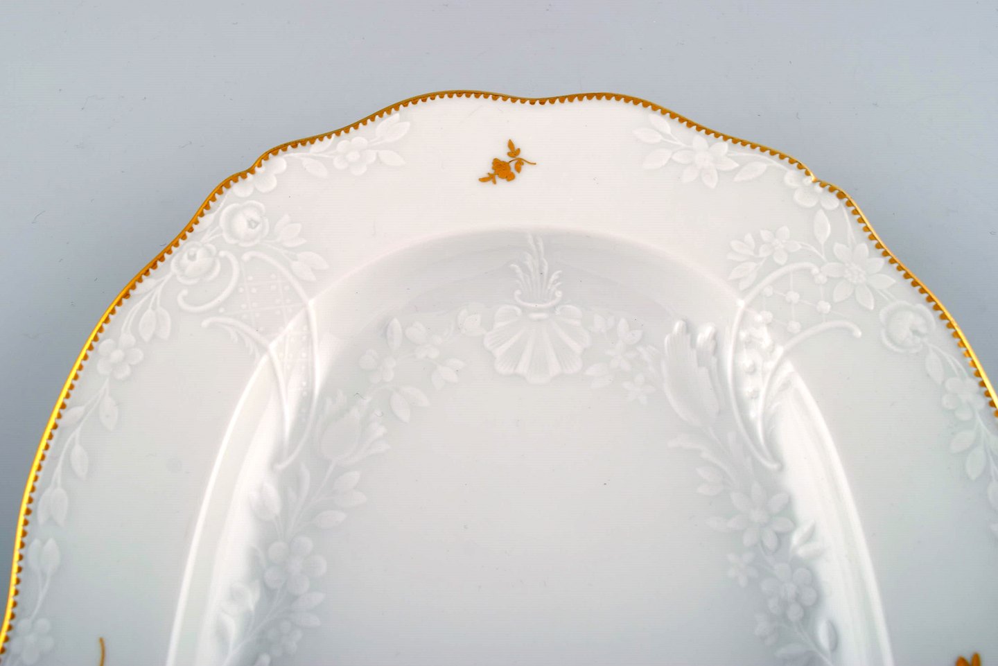 Stort Meissen serveringsfad i porcelæn med blomster og bladværk i relief og gulddekoration. 1900-tallet. To stk på lager. Måler: 37 x 26 x 4 cm. I flot stand. Stemplet.