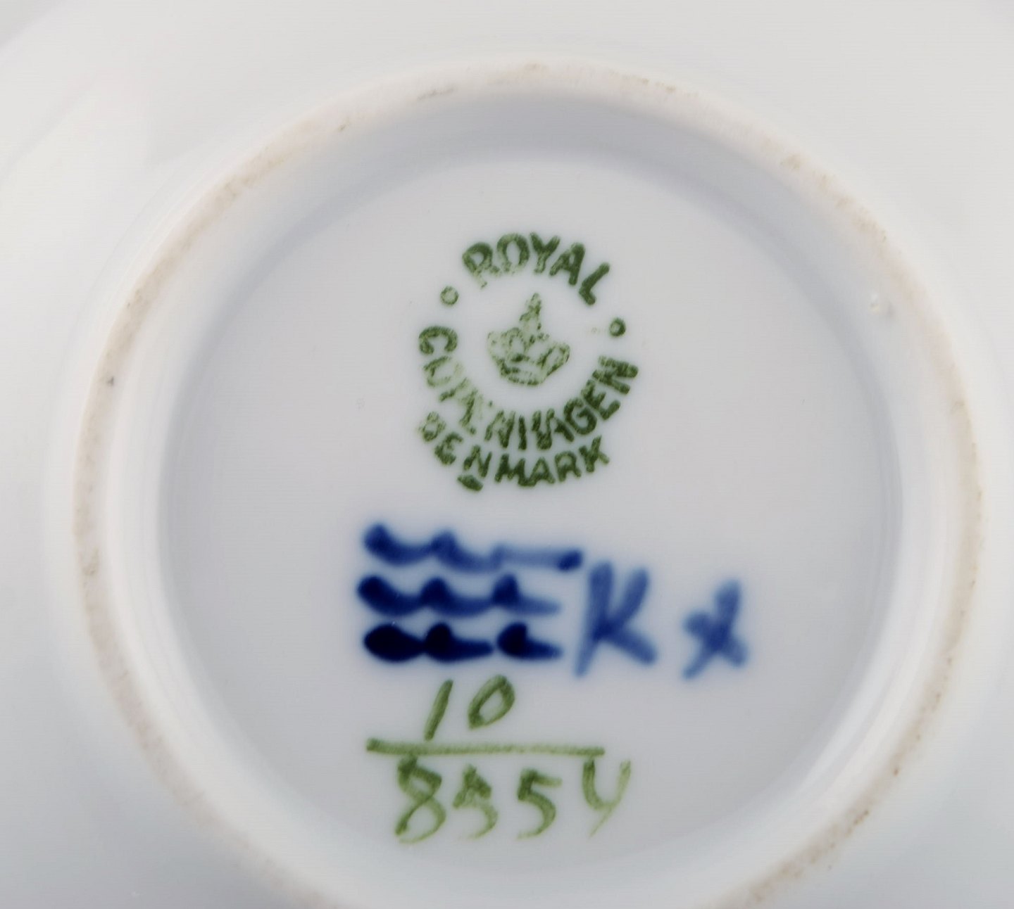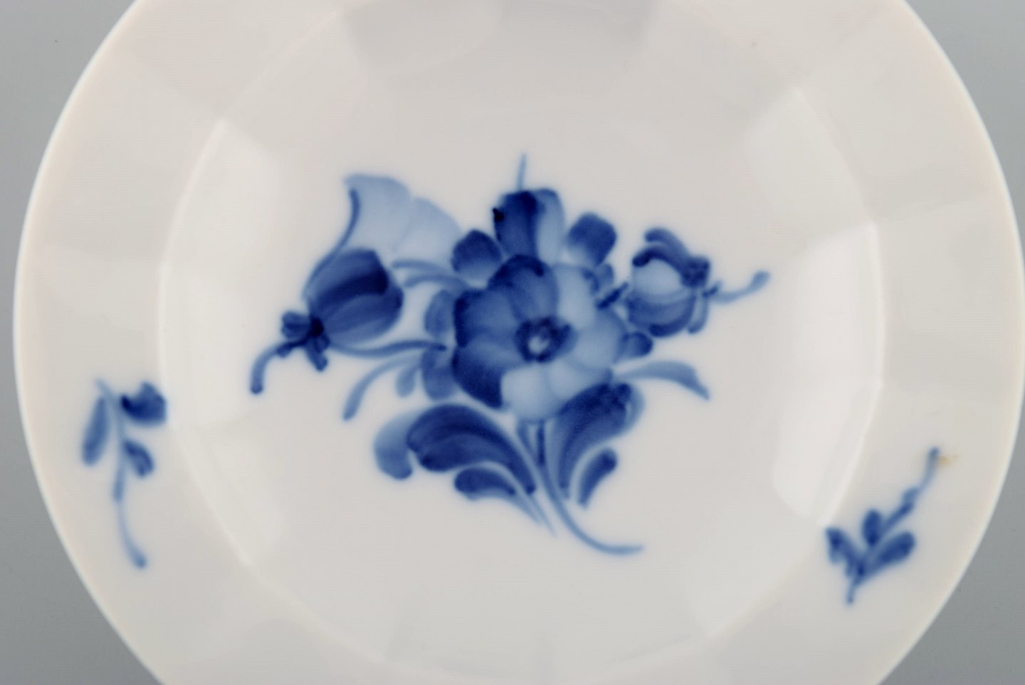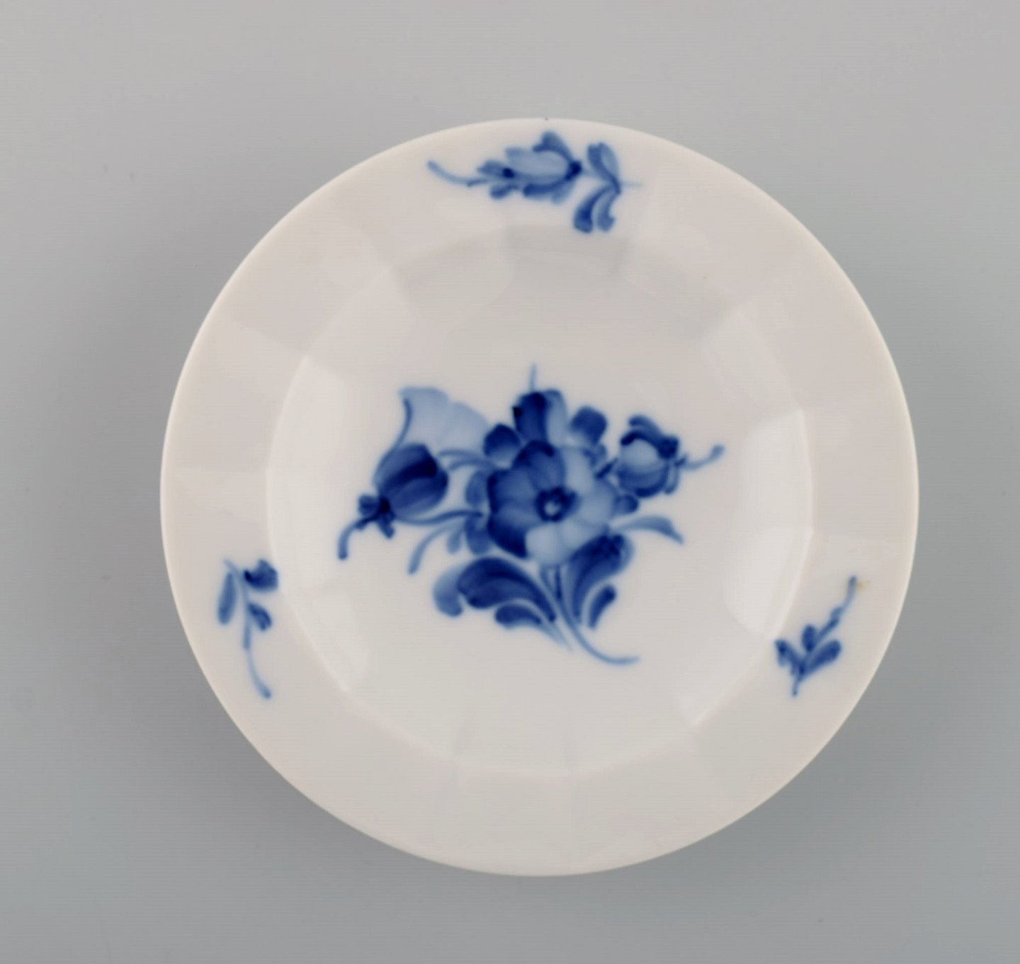 Fem Royal Copenhagen Blå Blomst kantet kuvertsmør. Nummer 10/8554. Diameter 9 cm. 1. Sortering. Stemplet.