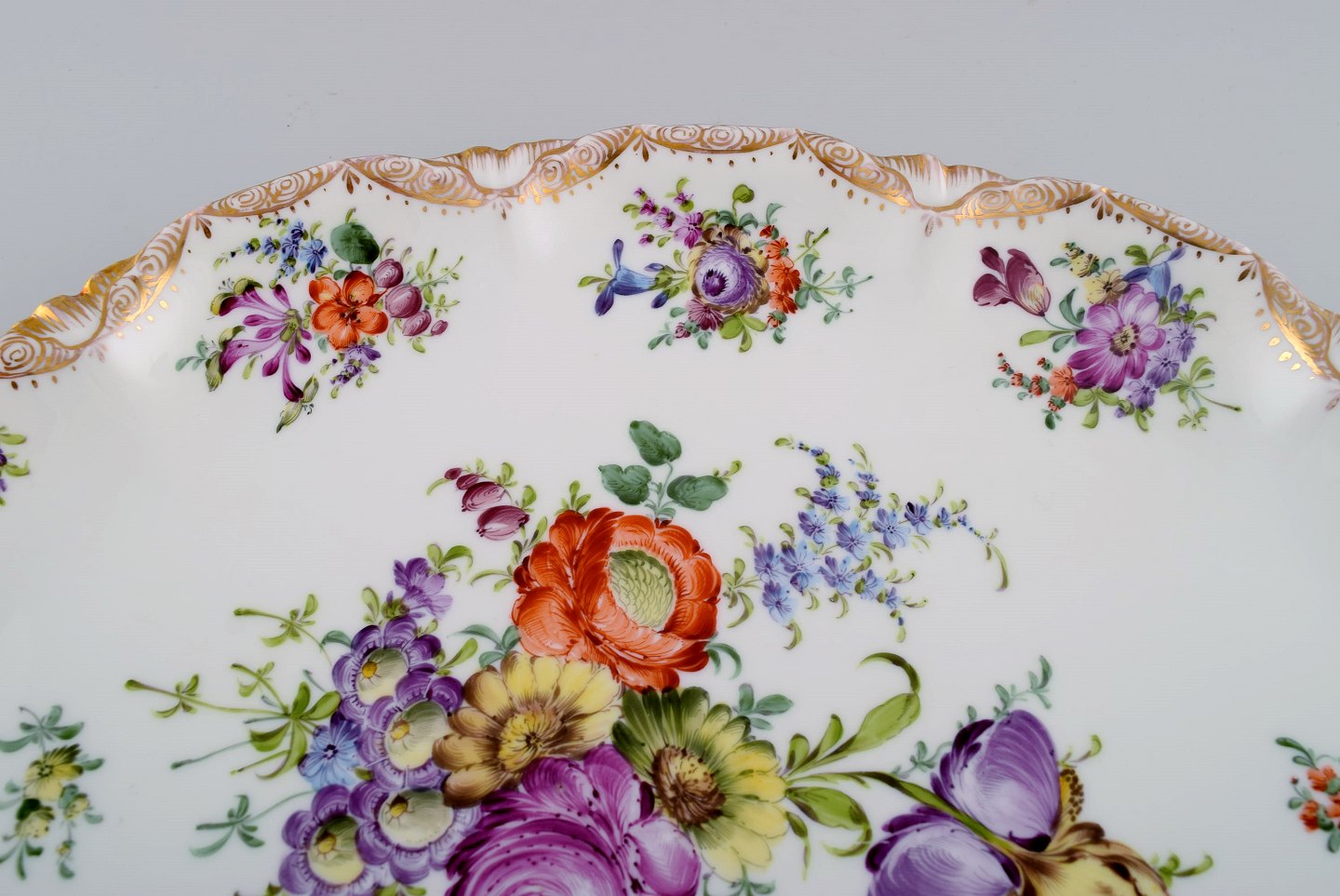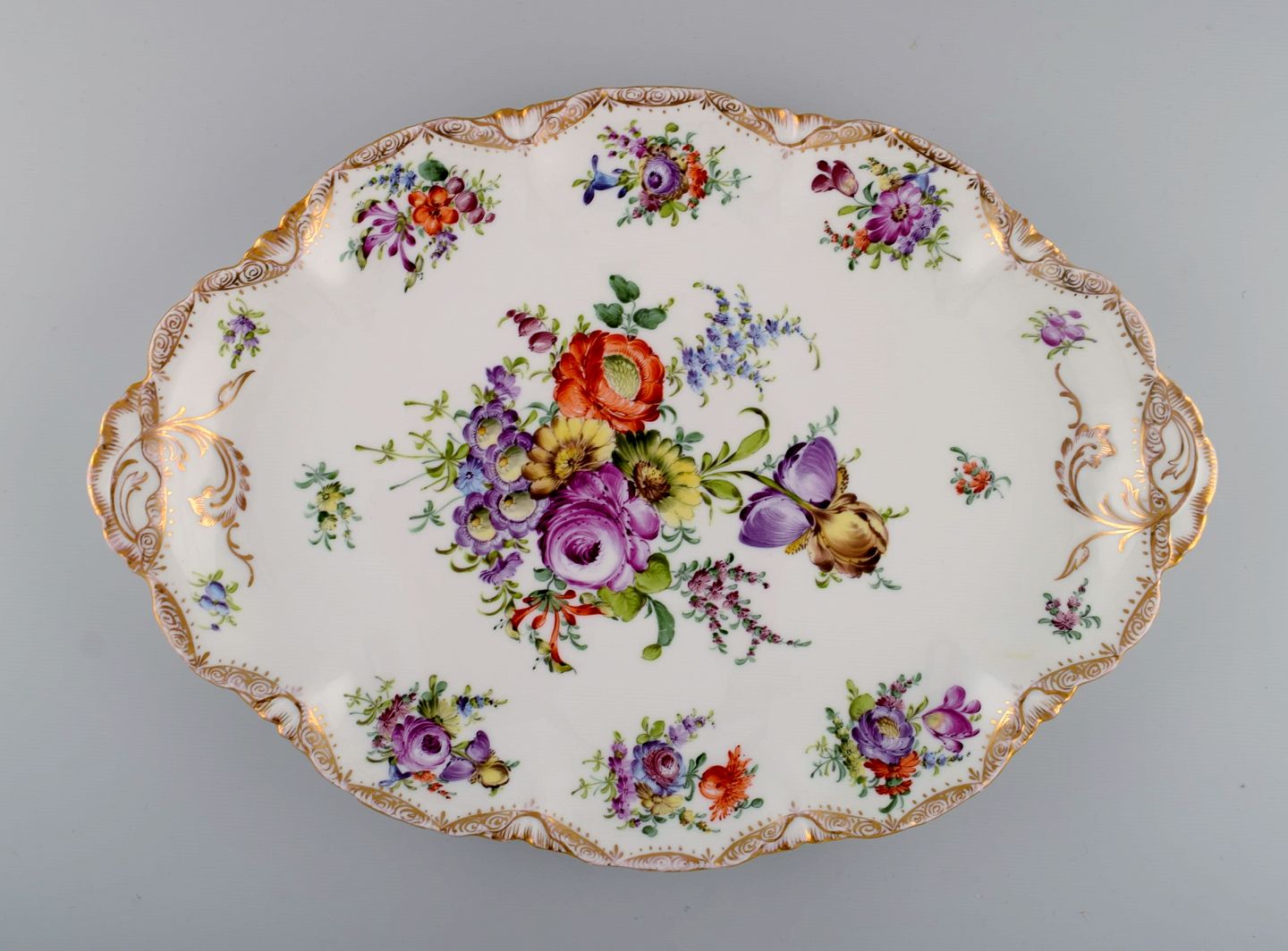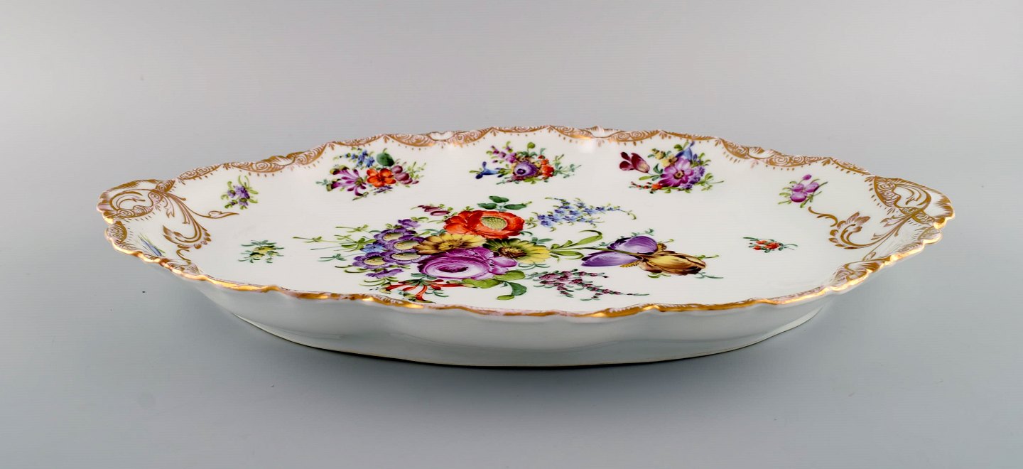 Stort Dresden serveringsfad i håndmalet porcelæn med blomstermotiver og gulddekoration. Tidligt 1900-tallet. Måler: 43 x 30 cm. I flot stand. Stemplet.