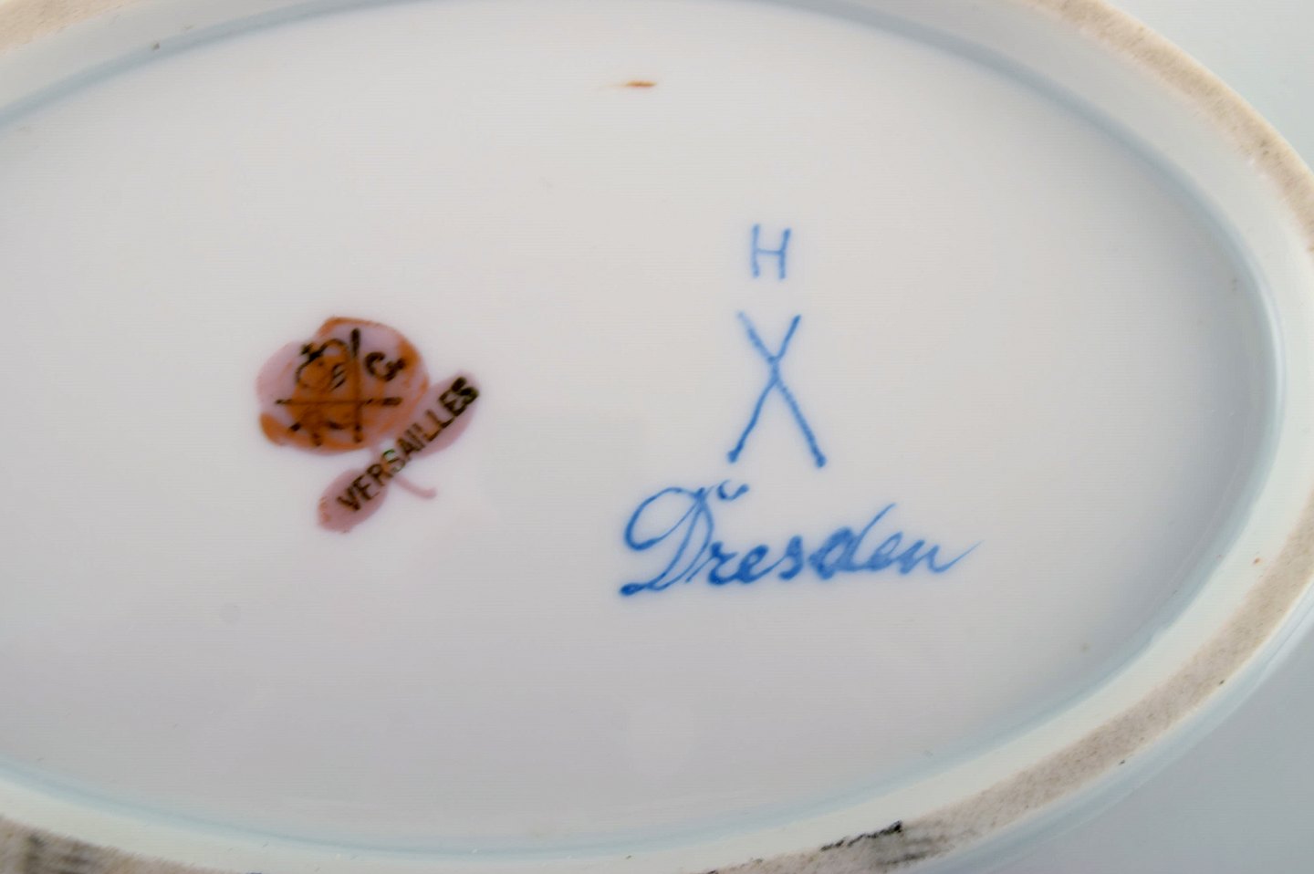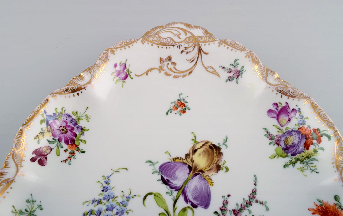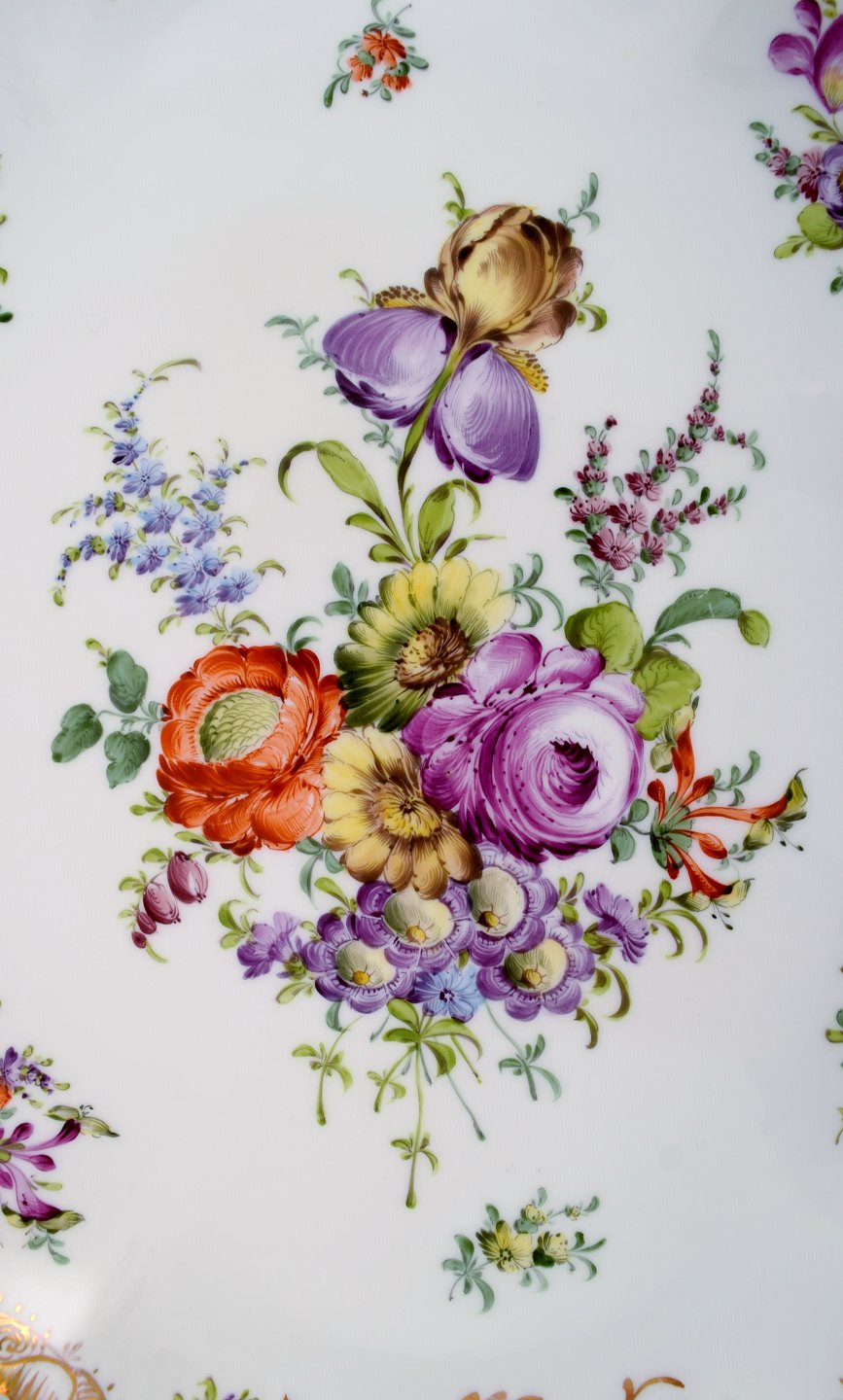 Stort Dresden serveringsfad i håndmalet porcelæn med blomstermotiver og gulddekoration. Tidligt 1900-tallet. Måler: 43 x 30 cm. I flot stand. Stemplet.