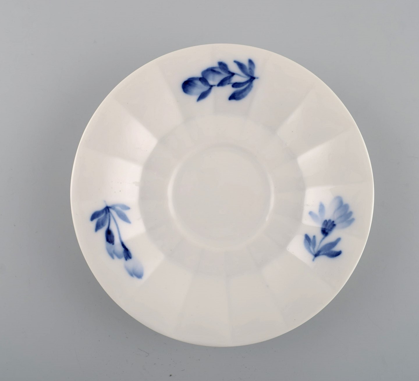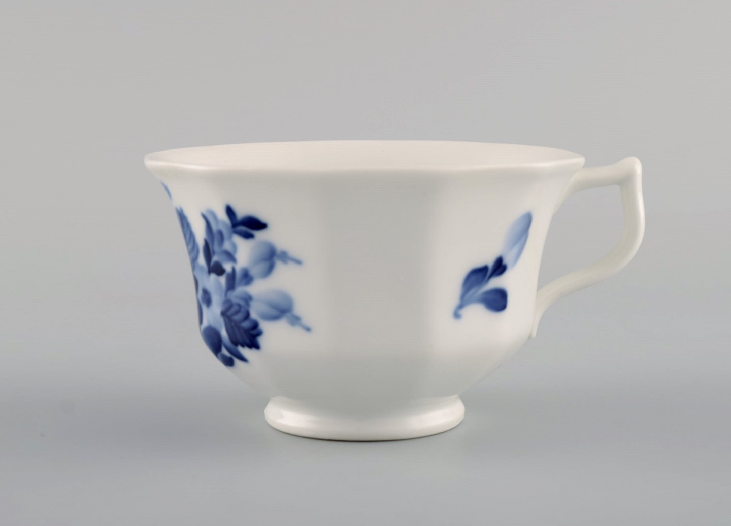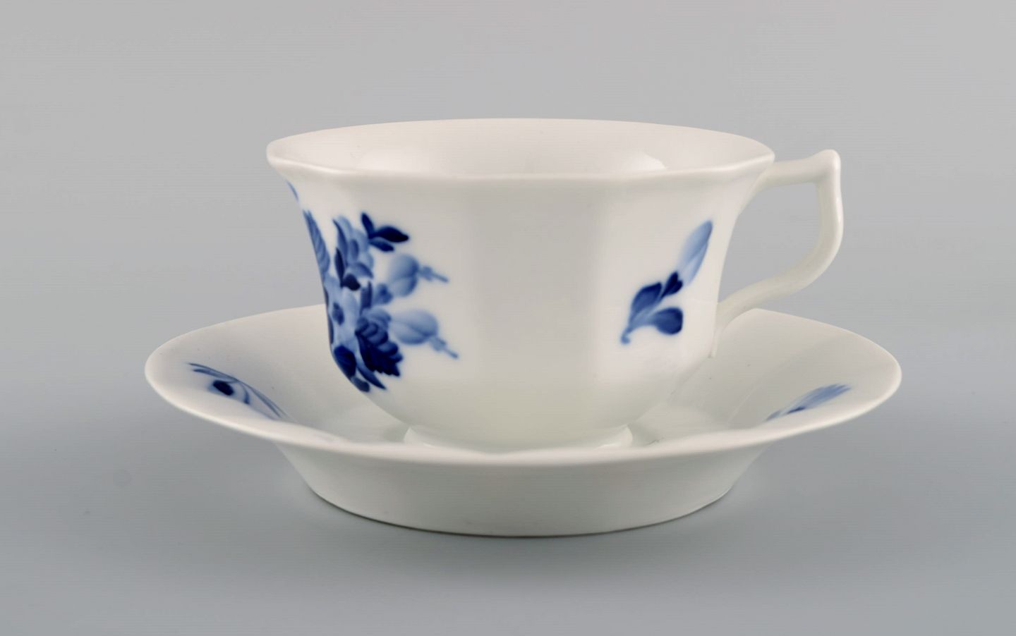 Royal Copenhagen Blå Blomst kantet tekop med underkop i porcelæn. Modelnummer 10/8500. Koppen måler: 9,5 x 7 cm. Underkoppen måler: 15 cm. I flot stand. Stemplet.