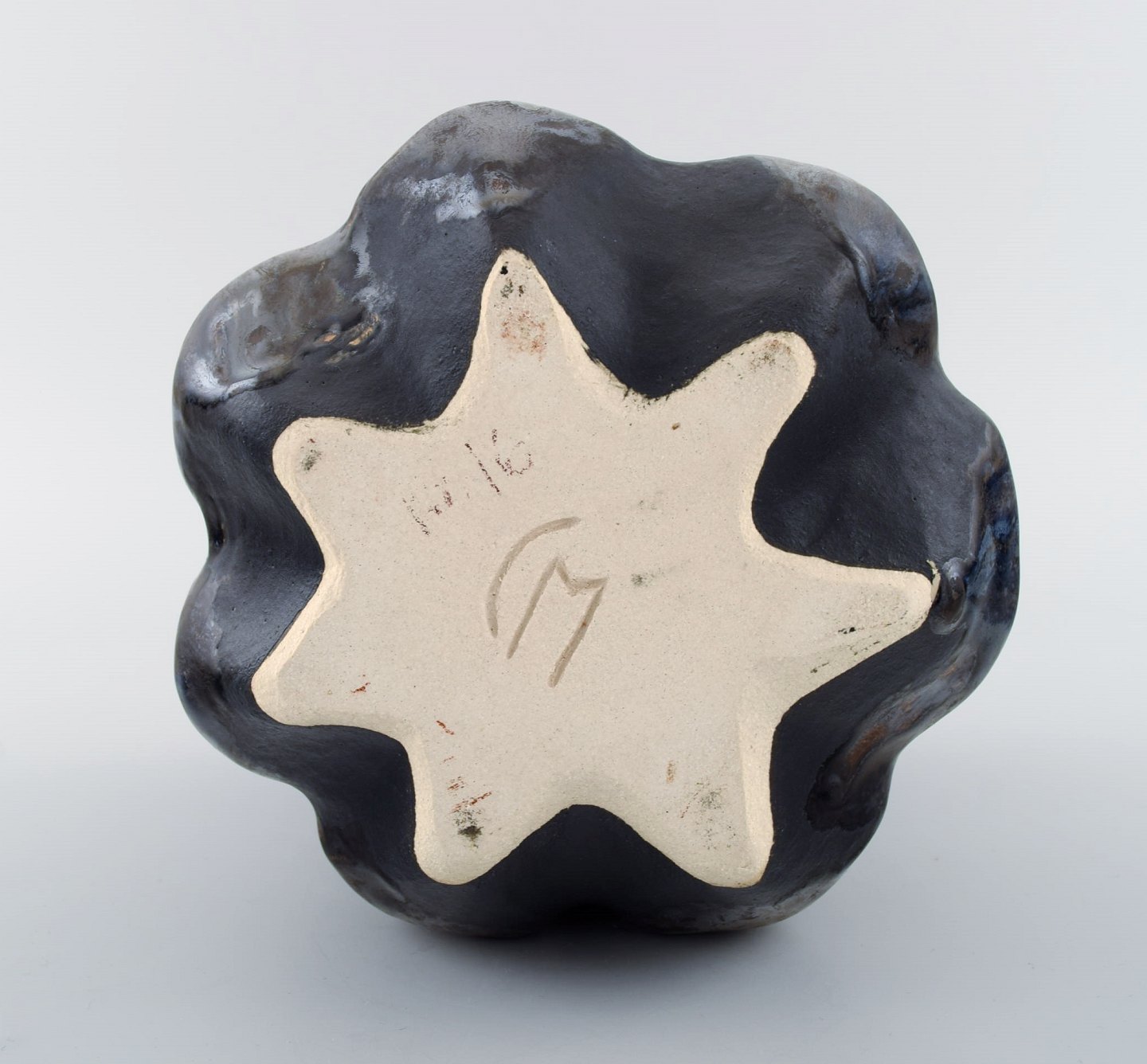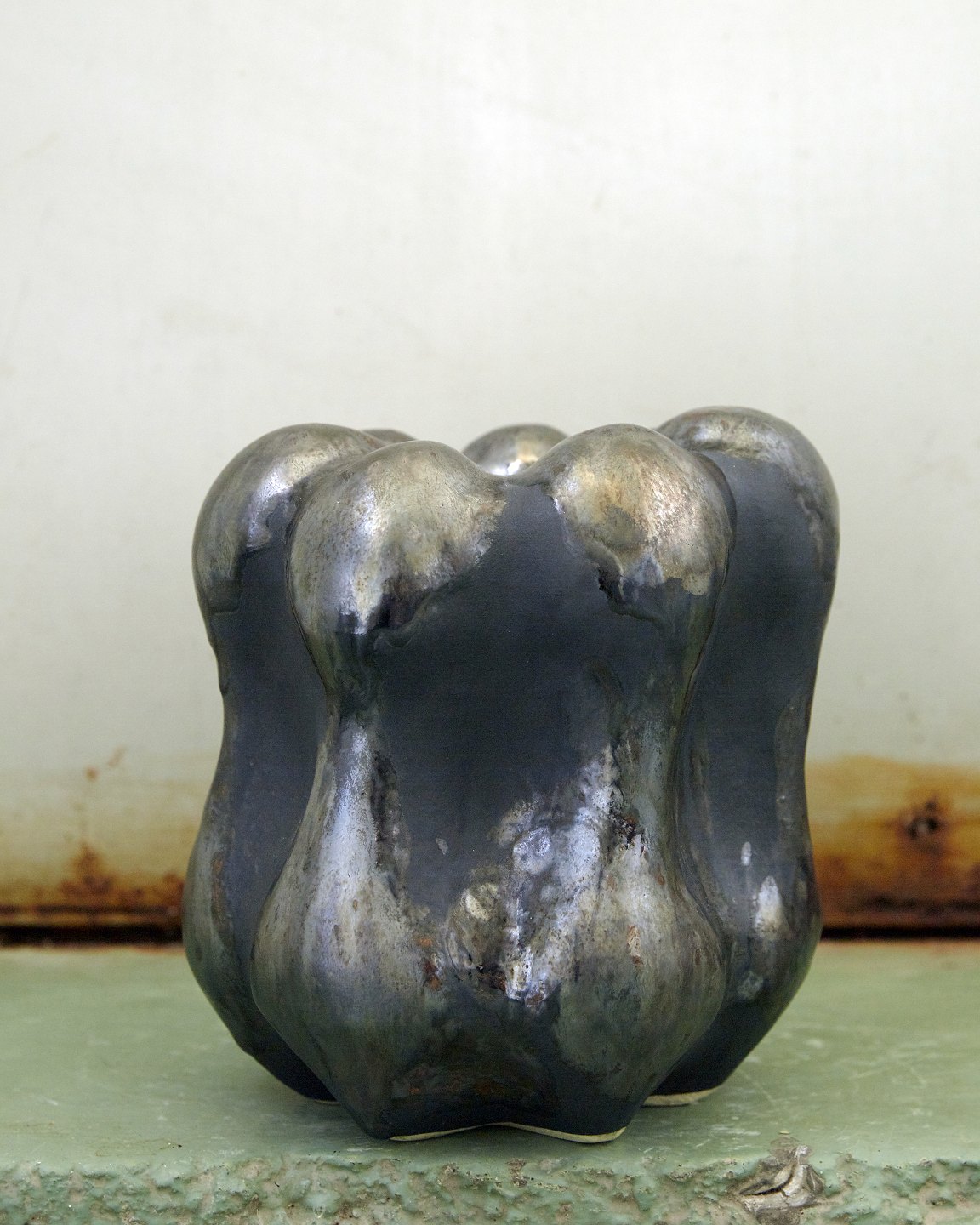 dekoreret med både mat og blank glasur. Som base er der en sortgrå mat glasur og på alle toppe en rustik, skinnende sølvglasur med rustrøde strejf. En del af ‘Seed’ serien. Unika.