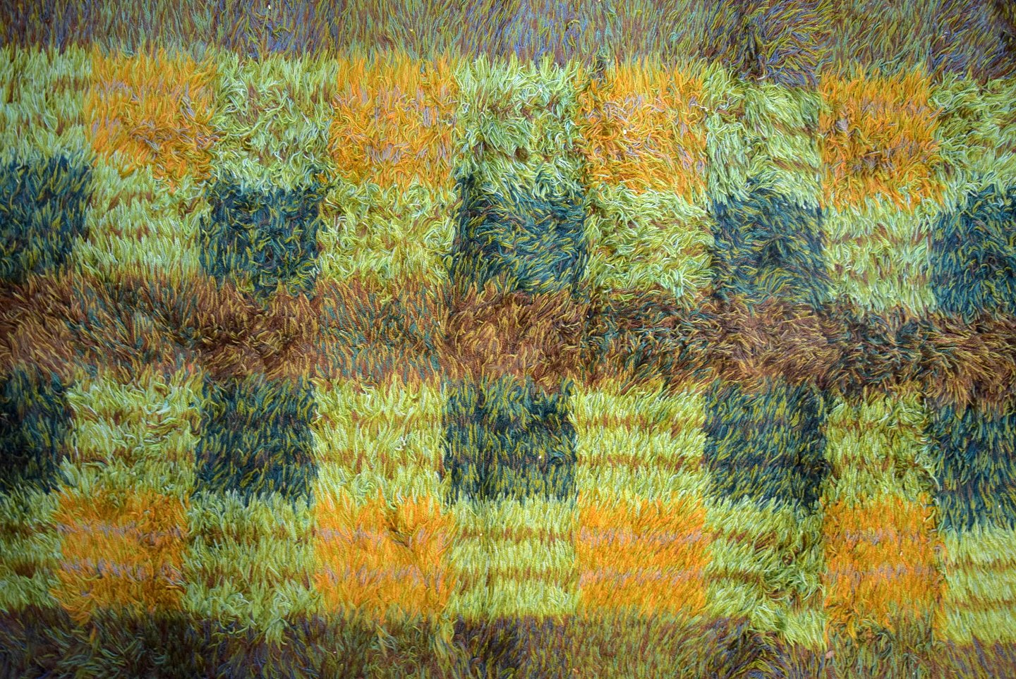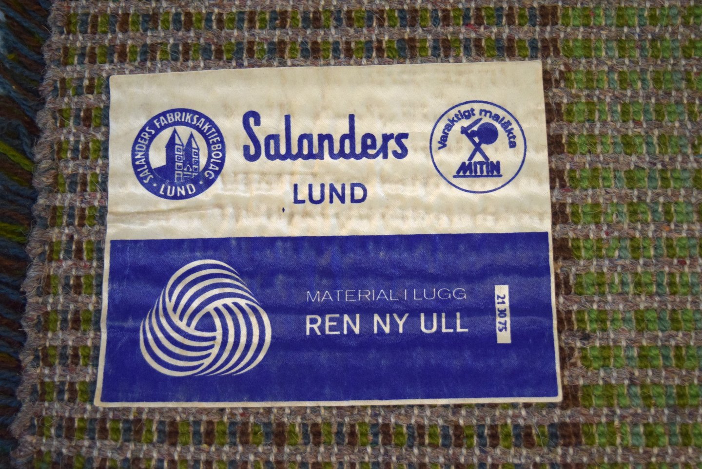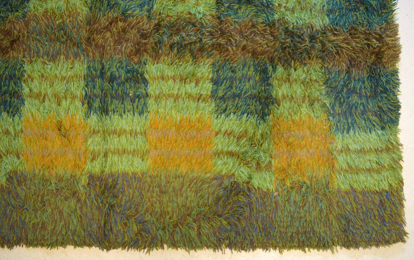 Salanders, Lund. Ryatæppe i ren uld. Geometriske felter i grønne, gule og blå nuancer. 1960/70'erne. Måler: 185 x 130 cm. I flot stand. Mærkat.