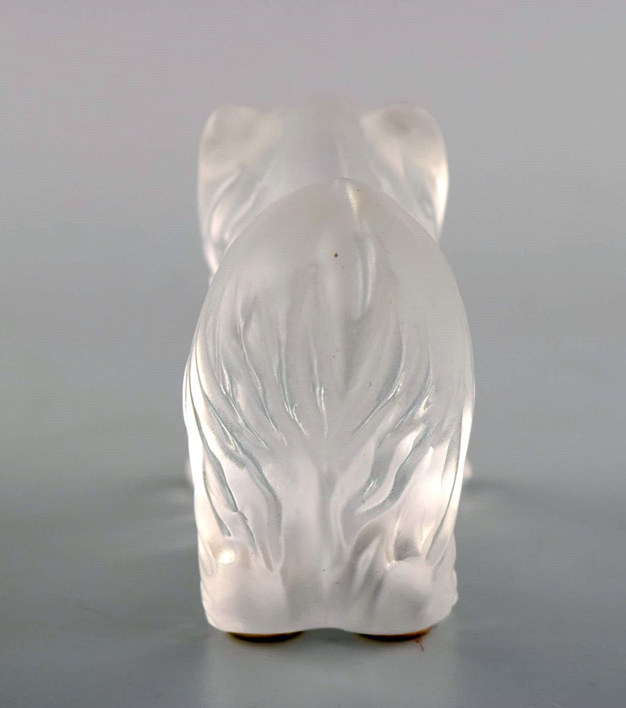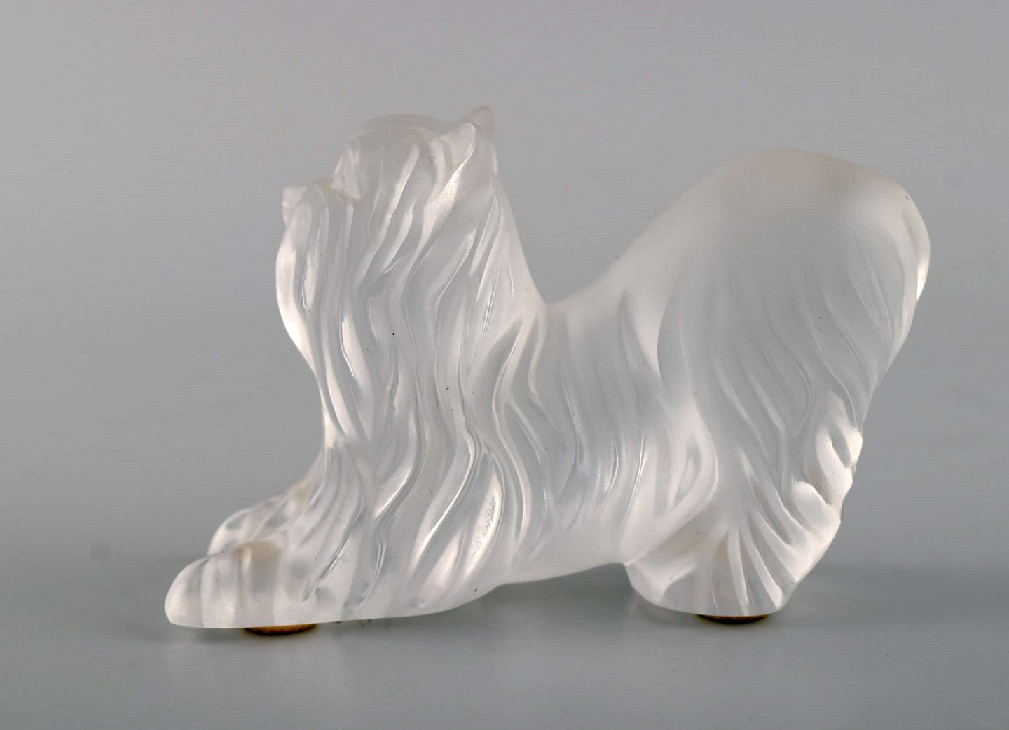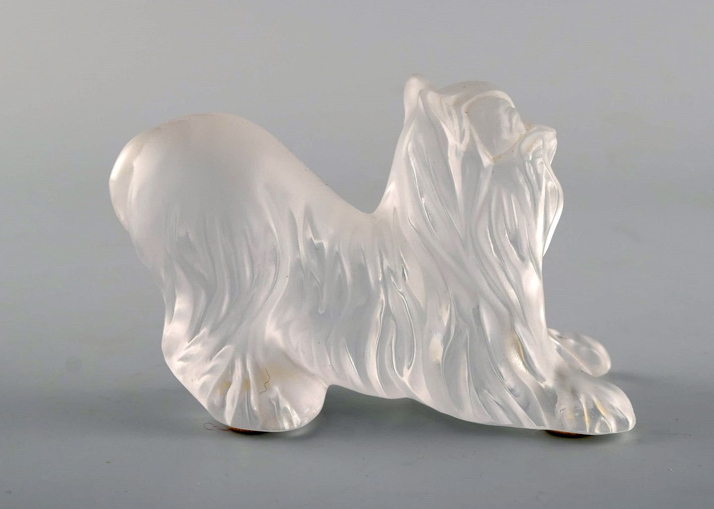 Lalique hund i matteret kunstglas. 1980'erne. Måler: 11 x 7,5 cm. I flot stand. Indridset signatur.