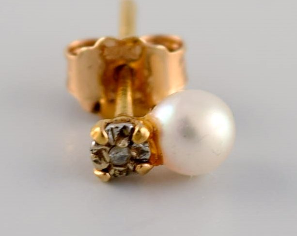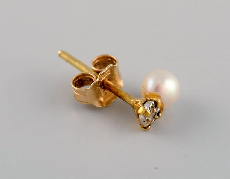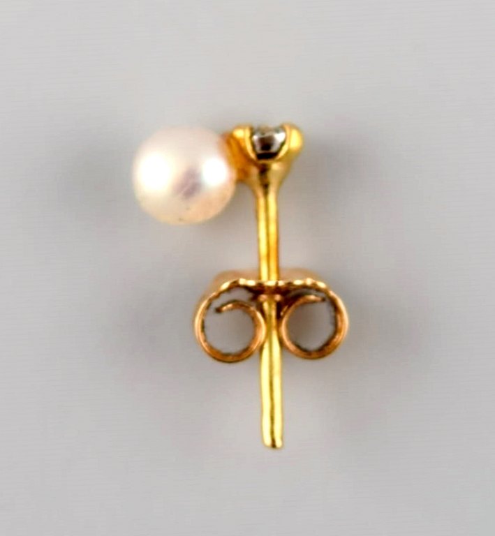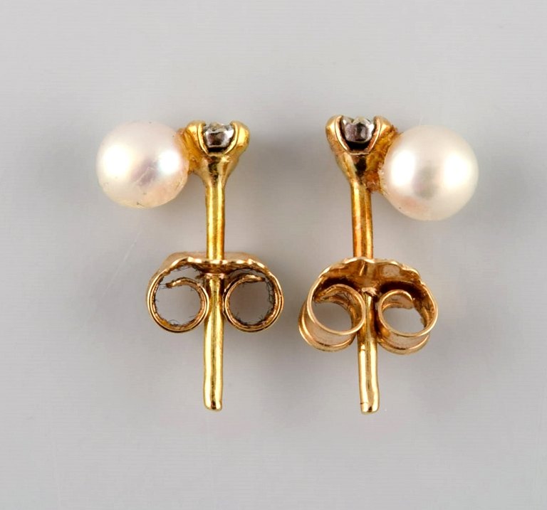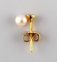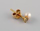 Svensk guldsmed. Et par klassiske ørestikker i 18 karat guld prydet med kulturperler og halvædelsten. Midt 1900-tallet. Måler: 12 x 7 mm. I flot stand. Stemplet.
