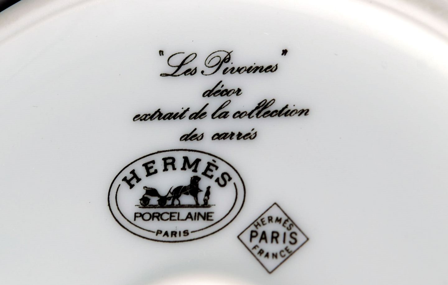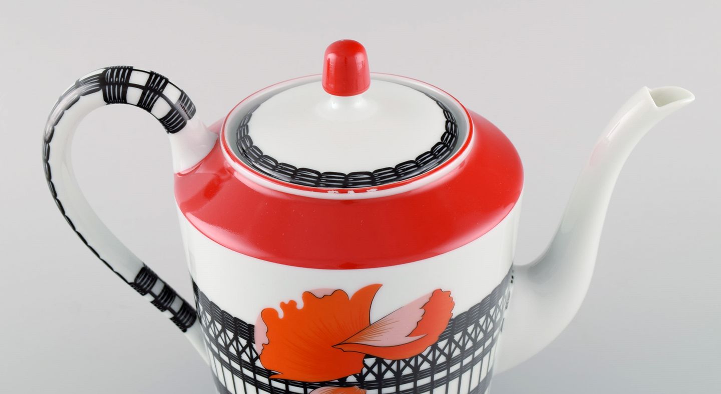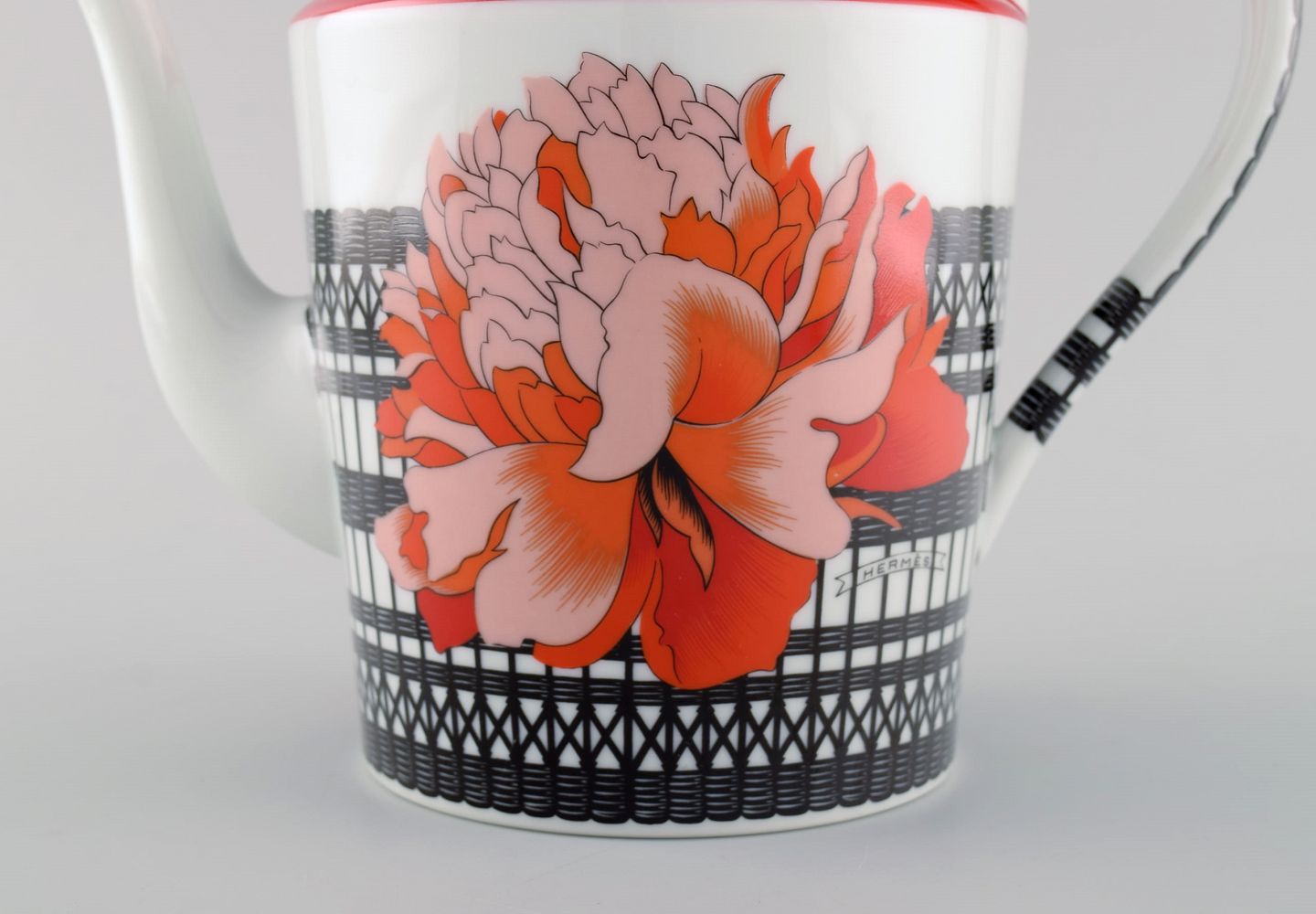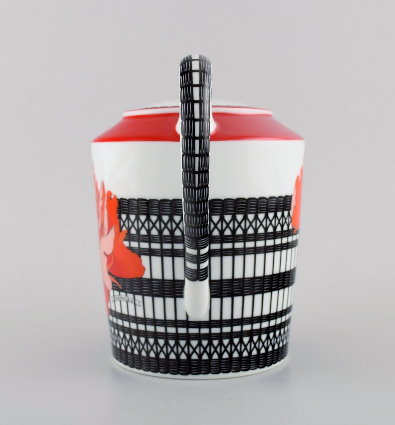 Hermès kaffekande i porcelæn med røde blomster og sort/hvid mønstret dekoration. 1980erne. Måler: 25 x 19,5 cm. I flot stand med let slid på kanten. Stemplet.
