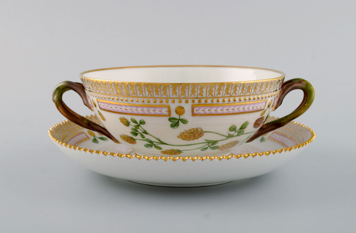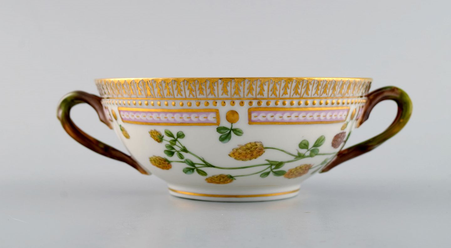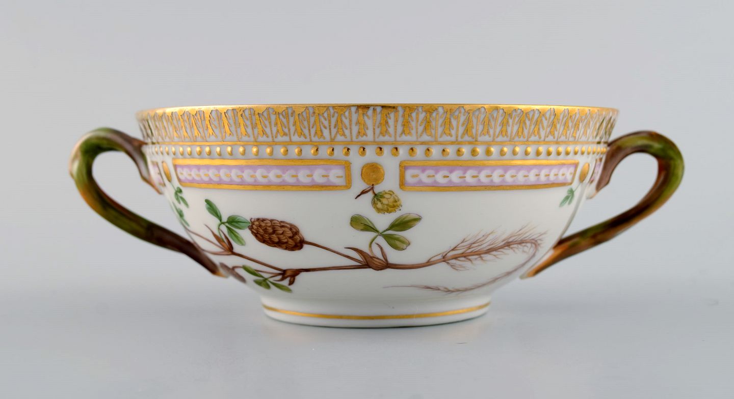 Royal Copenhagen Flora Danica boullionkop med underkop i håndmalet porcelæn med grenformede hanke, blomster og gulddekoration. Modelnummer 20/3612.
