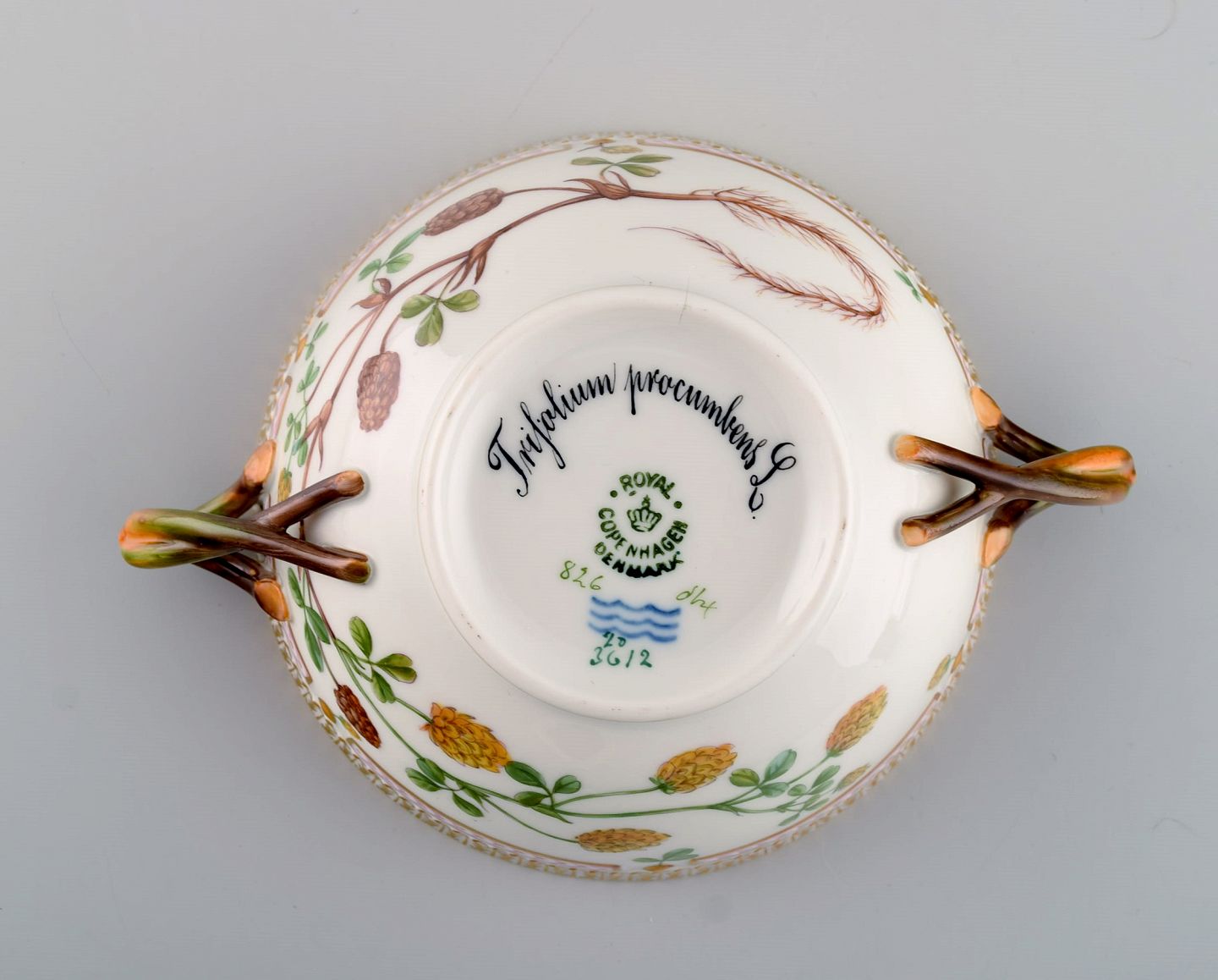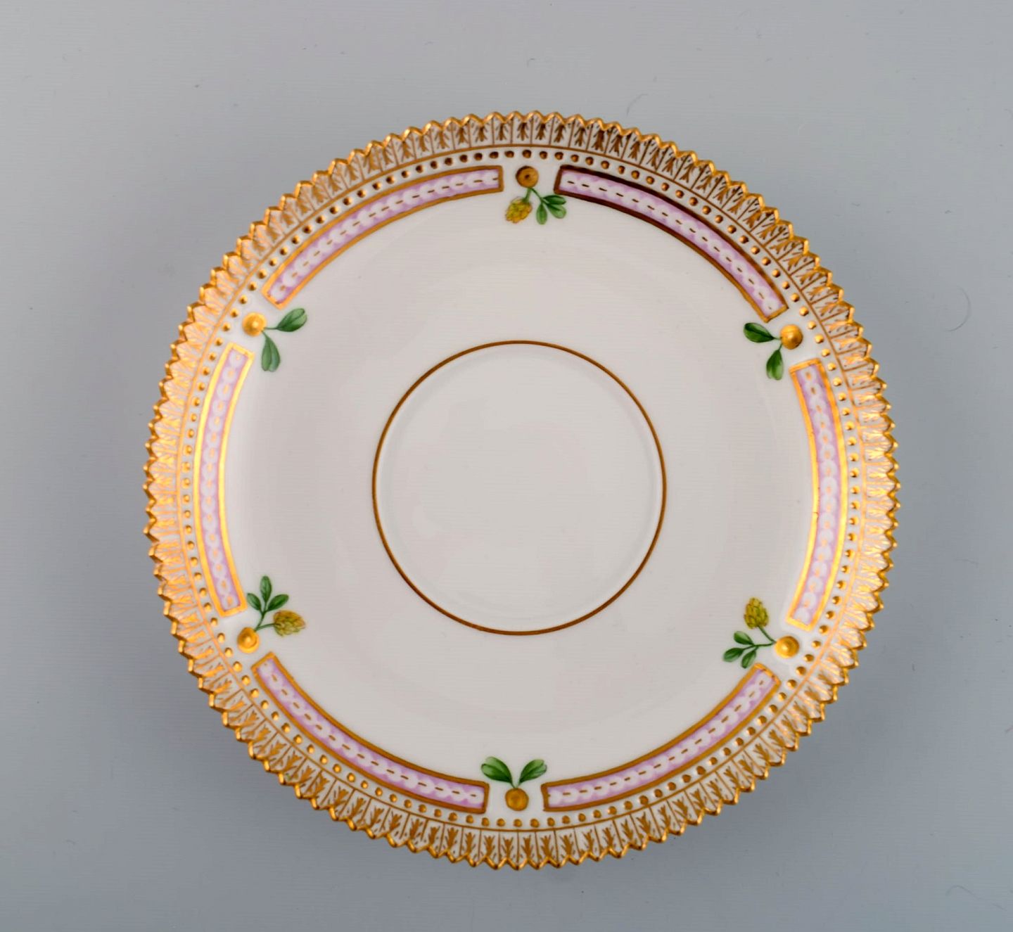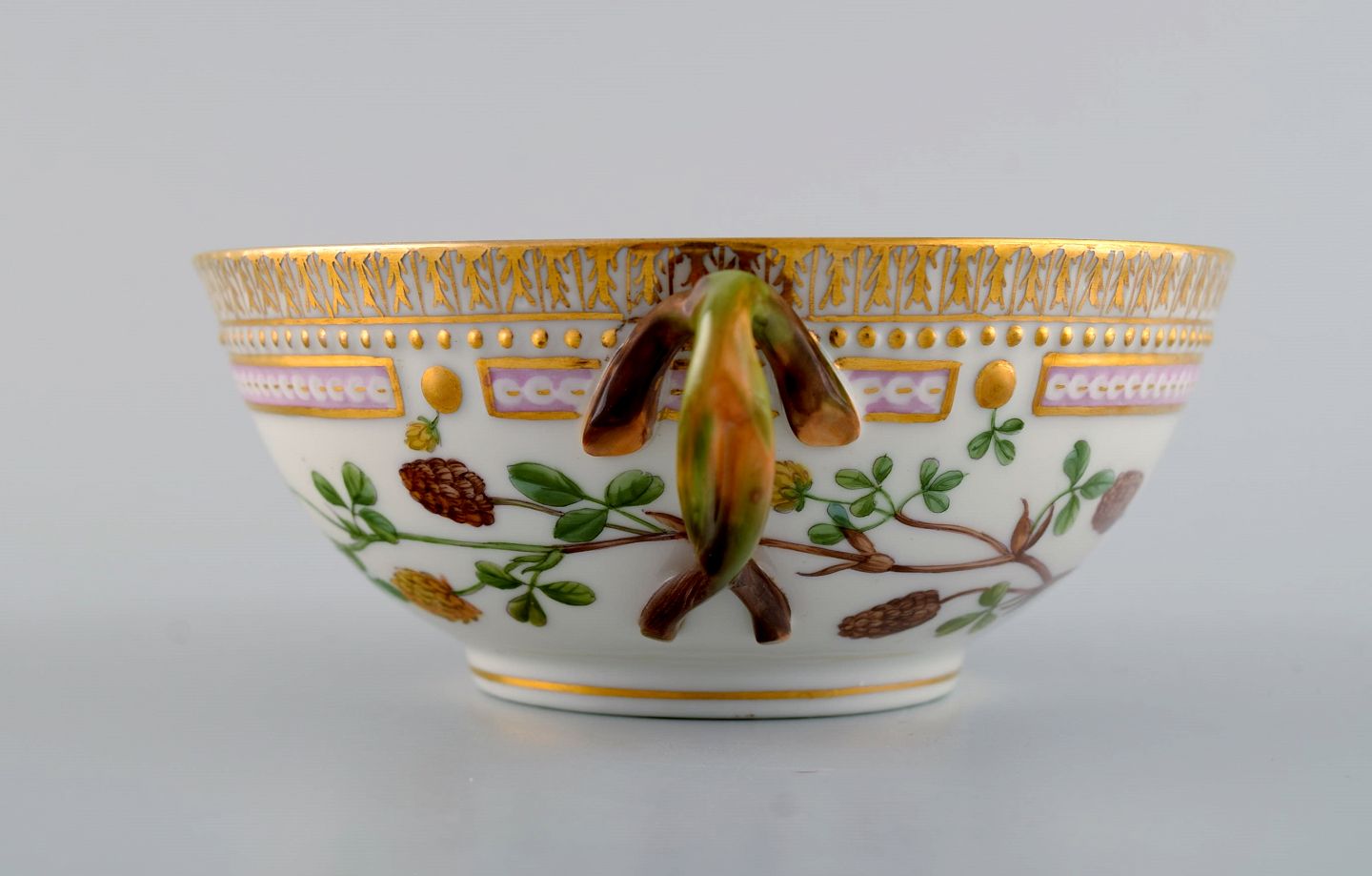 Royal Copenhagen Flora Danica boullionkop med underkop i håndmalet porcelæn med grenformede hanke, blomster og gulddekoration. Modelnummer 20/3612.