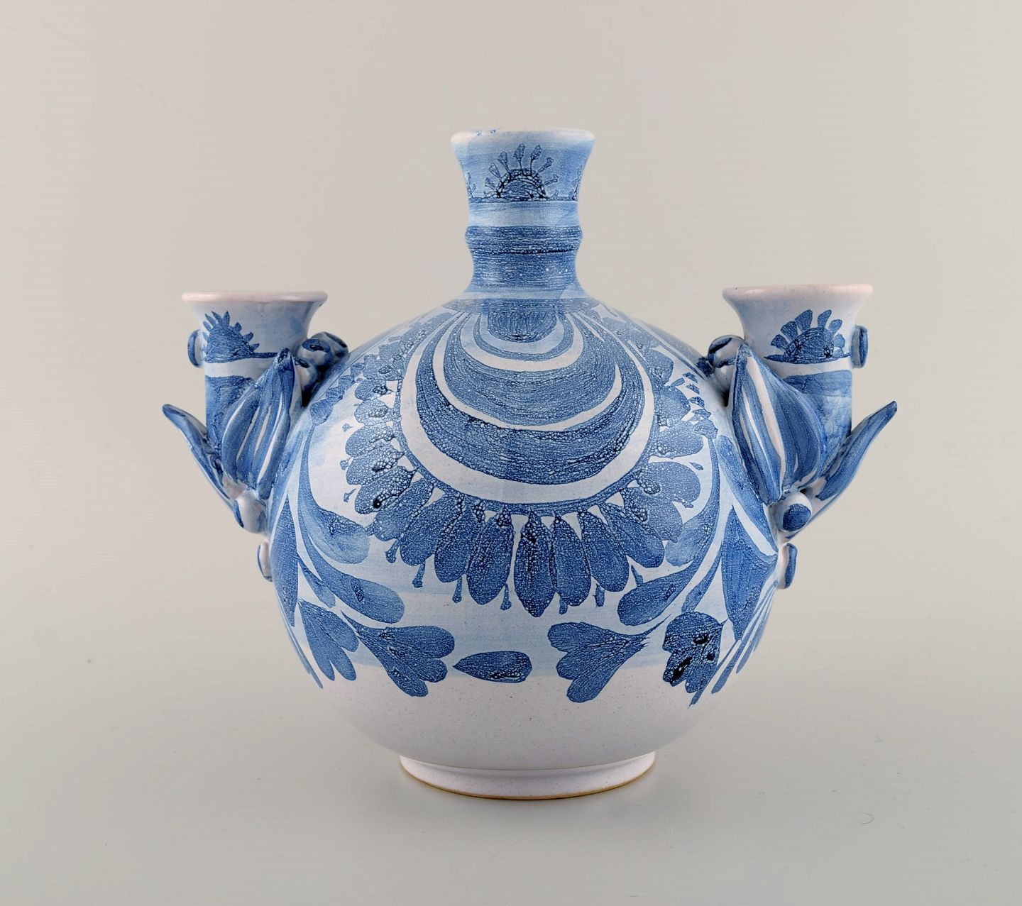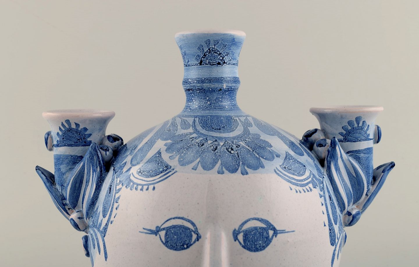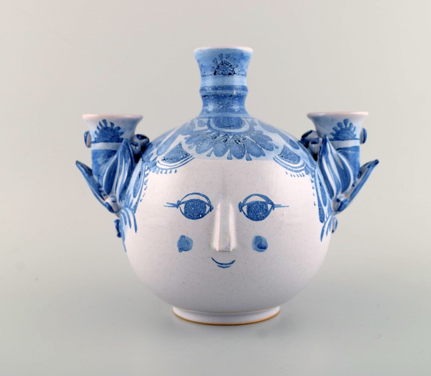 Bjørn Wiinblad (1918-2006), Danmark. Unika trearmet lysestage i glaseret keramik. Kvindeansigt, model OL4. Dateret 1980. Måler: 25 x 21,5 cm. I flot stand. Signeret og dateret.