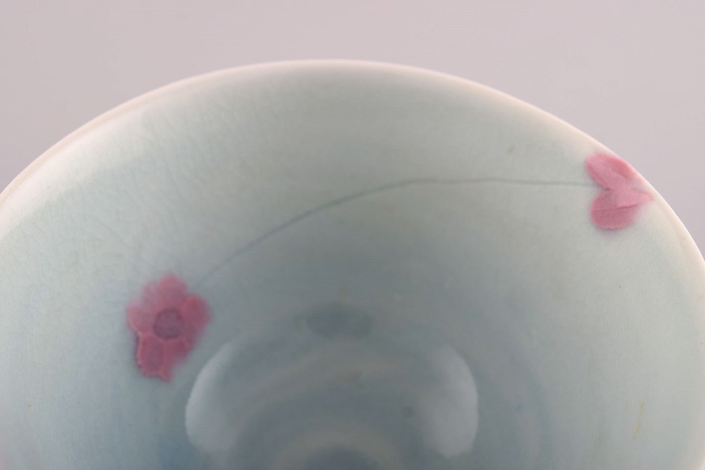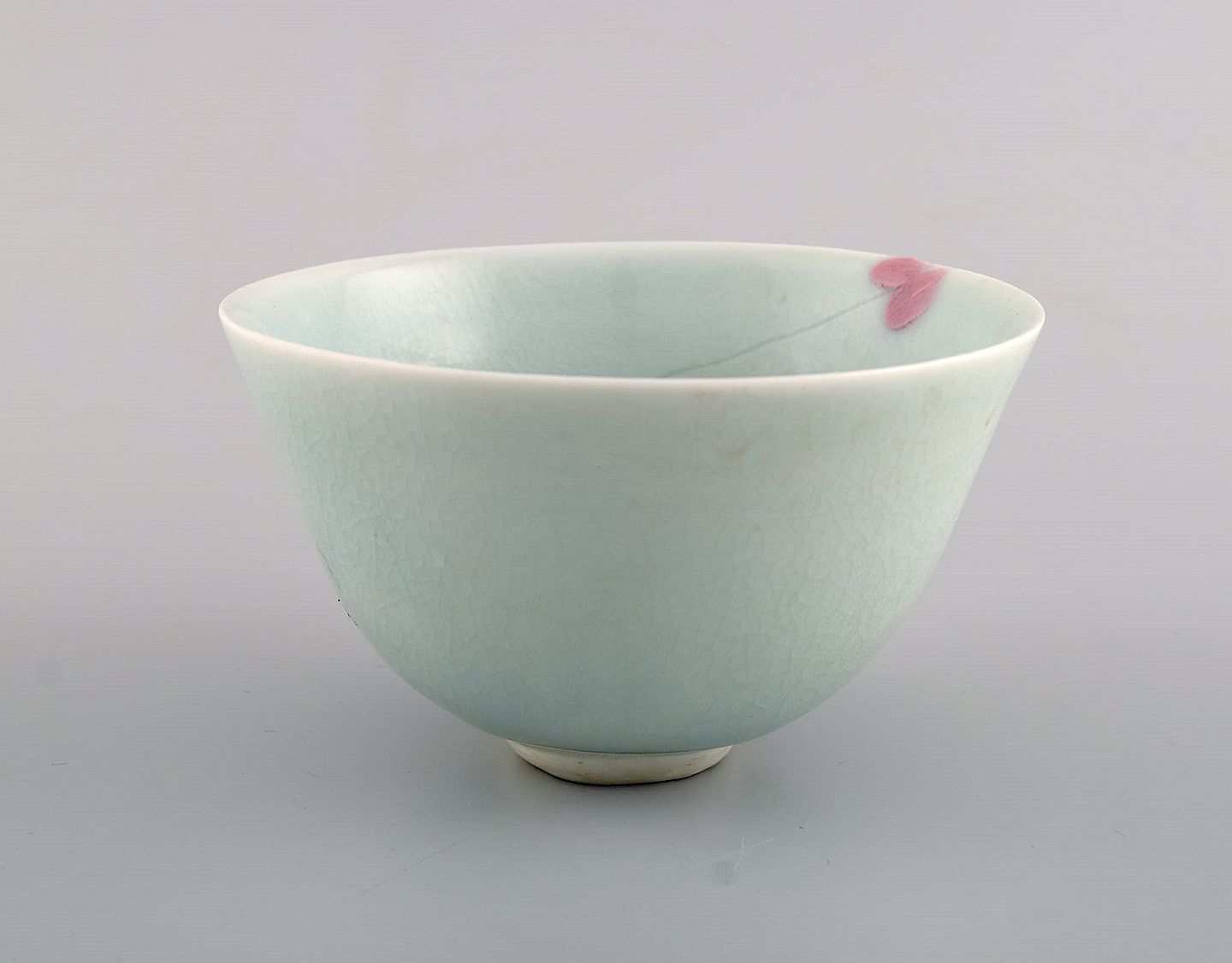 Gunhild Aaberg, dansk samtidskeramiker. Unika skål i håndmalet glaseret stentøj. Smuk krakeleret glasur og lyserøde blomster. 1980'erne. Måler: 12 x 7,5 cm. I flot stand. Signeret.