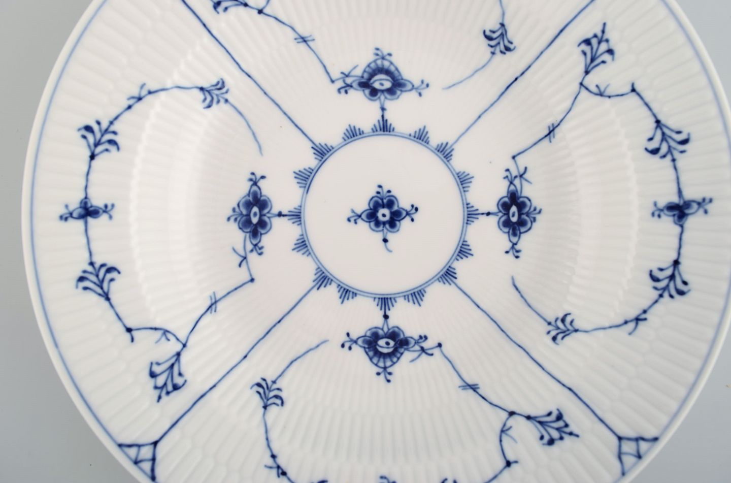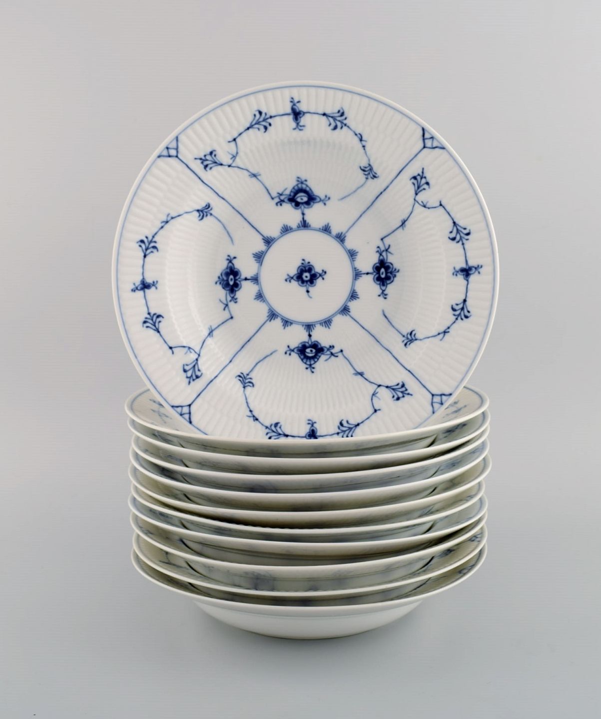 11 Royal Copenhagen Musselmalet riflet dybe tallerkener. Modelnummer 1/165. Dateret 1949. Måler: 24,5 x 4,6 cm. Stemplet. 2. sortering.