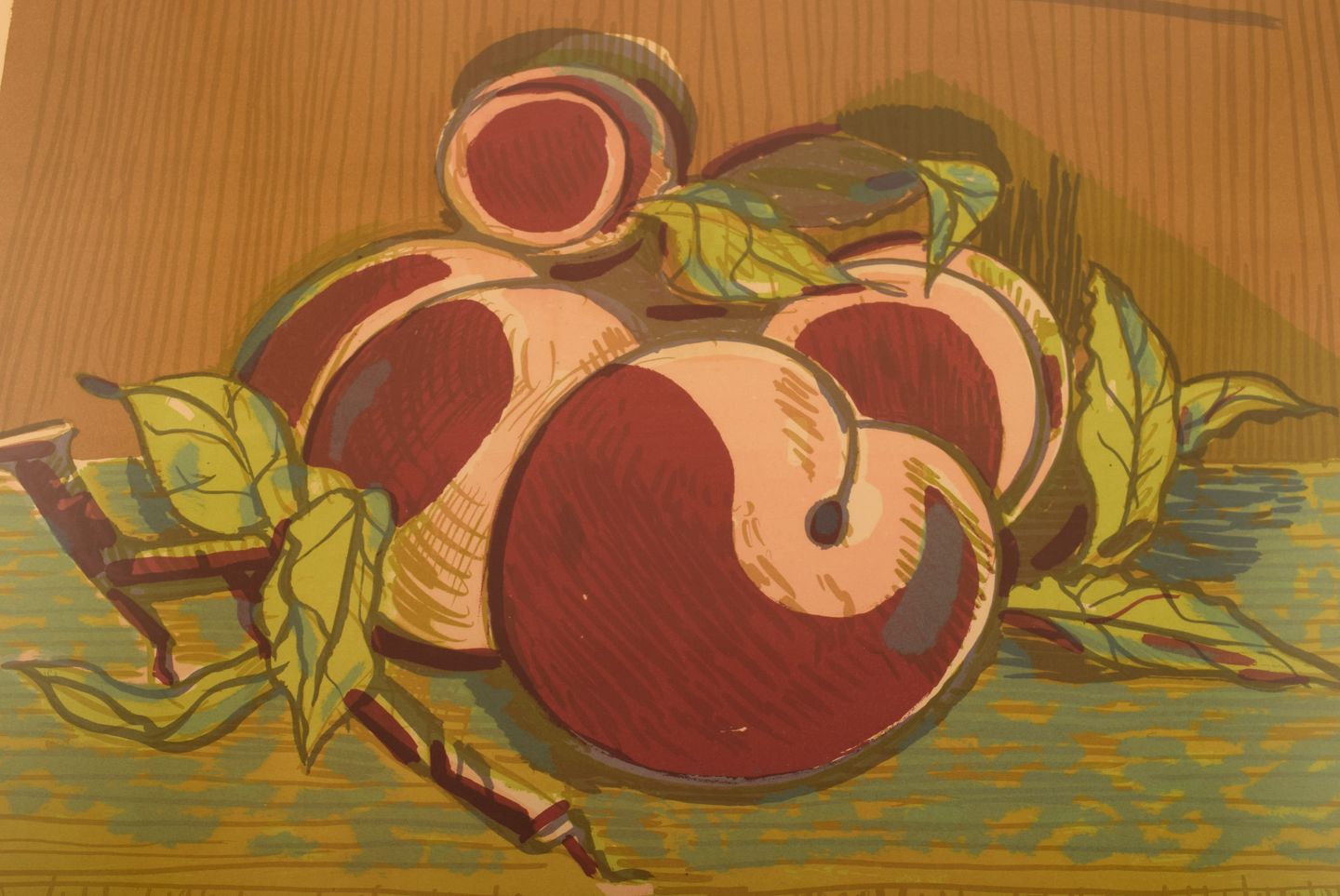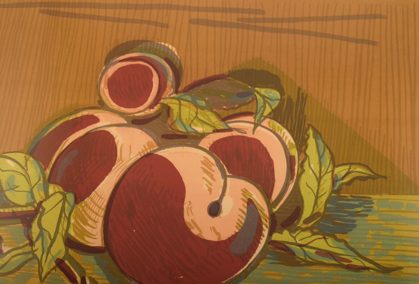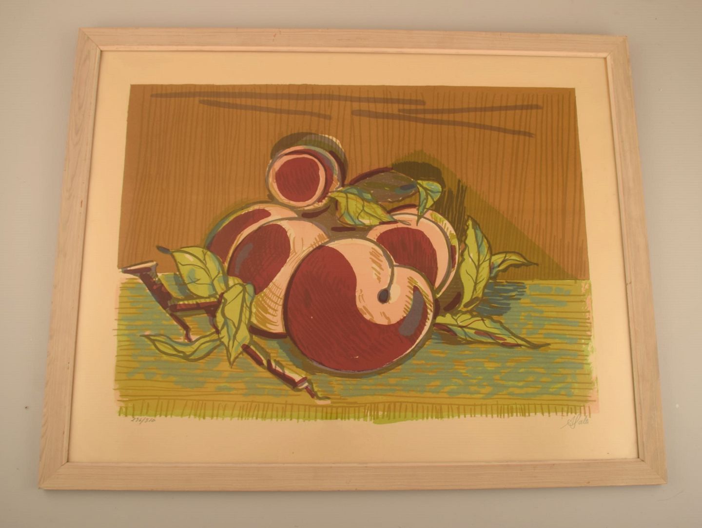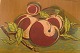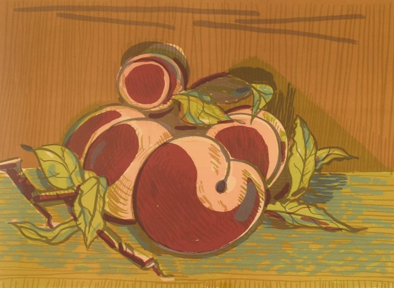 Axel Salto. Farvelitografi. Nummer 296/310. Ferskner. 1920'erne. Lysmål: 57 x 42 cm. Totalmål: 66 x 52 cm. Rammen måler: 3 cm. I flot stand. Signeret og nummereret i blyant.