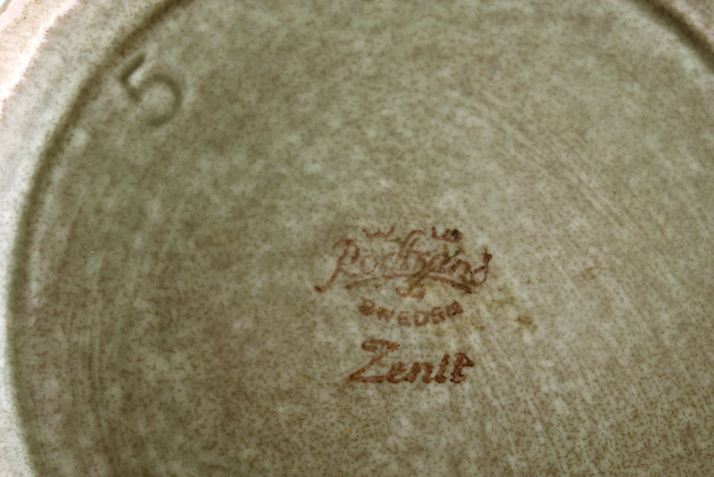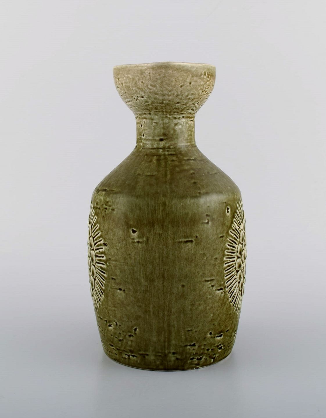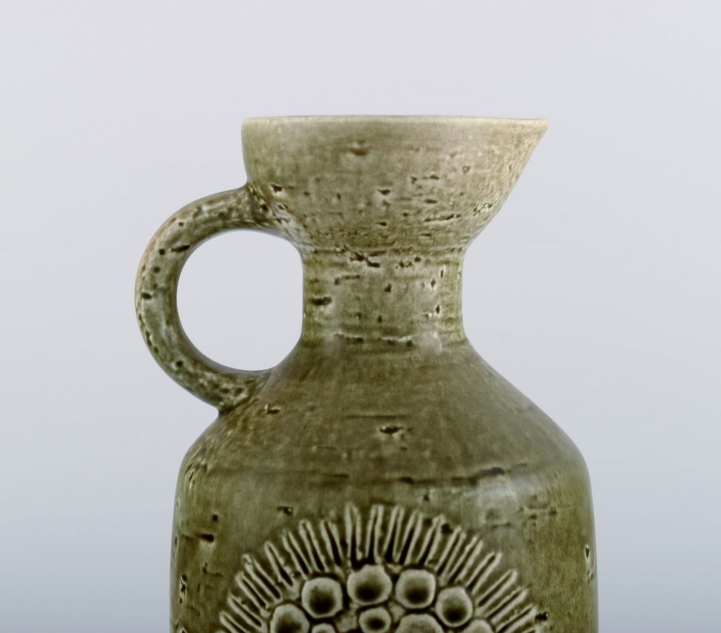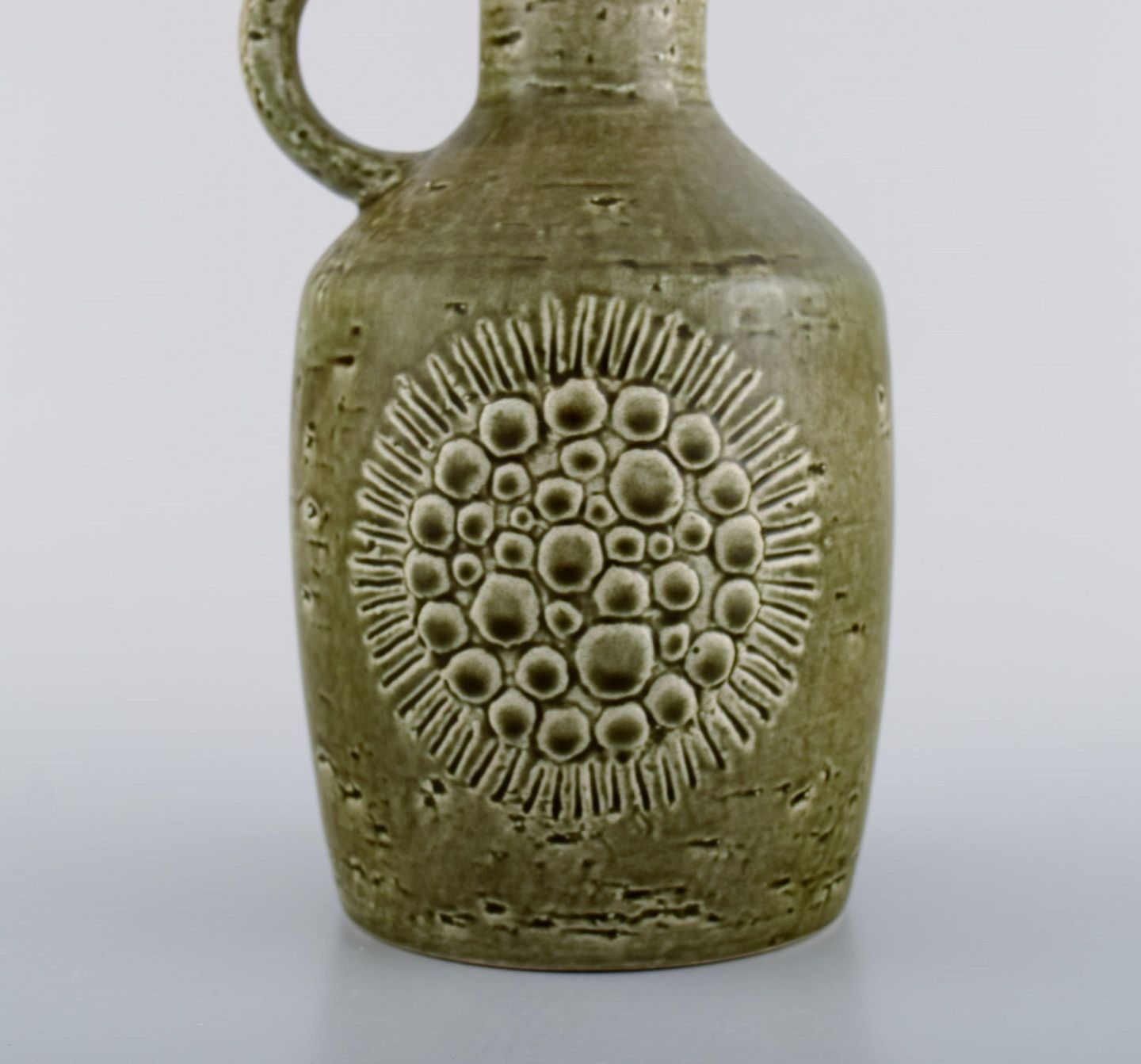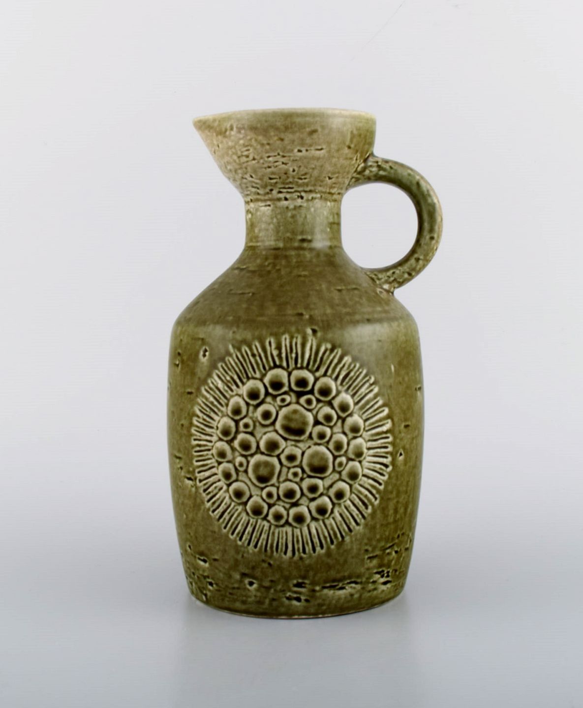 Gunnar Nylund for Rörstrand. Zenit kande i glaseret stentøj. Smuk olivengrøn glasur. 1960'erne. Måler: 21 x 12 cm. I flot stand. Stemplet. 1. Sortering