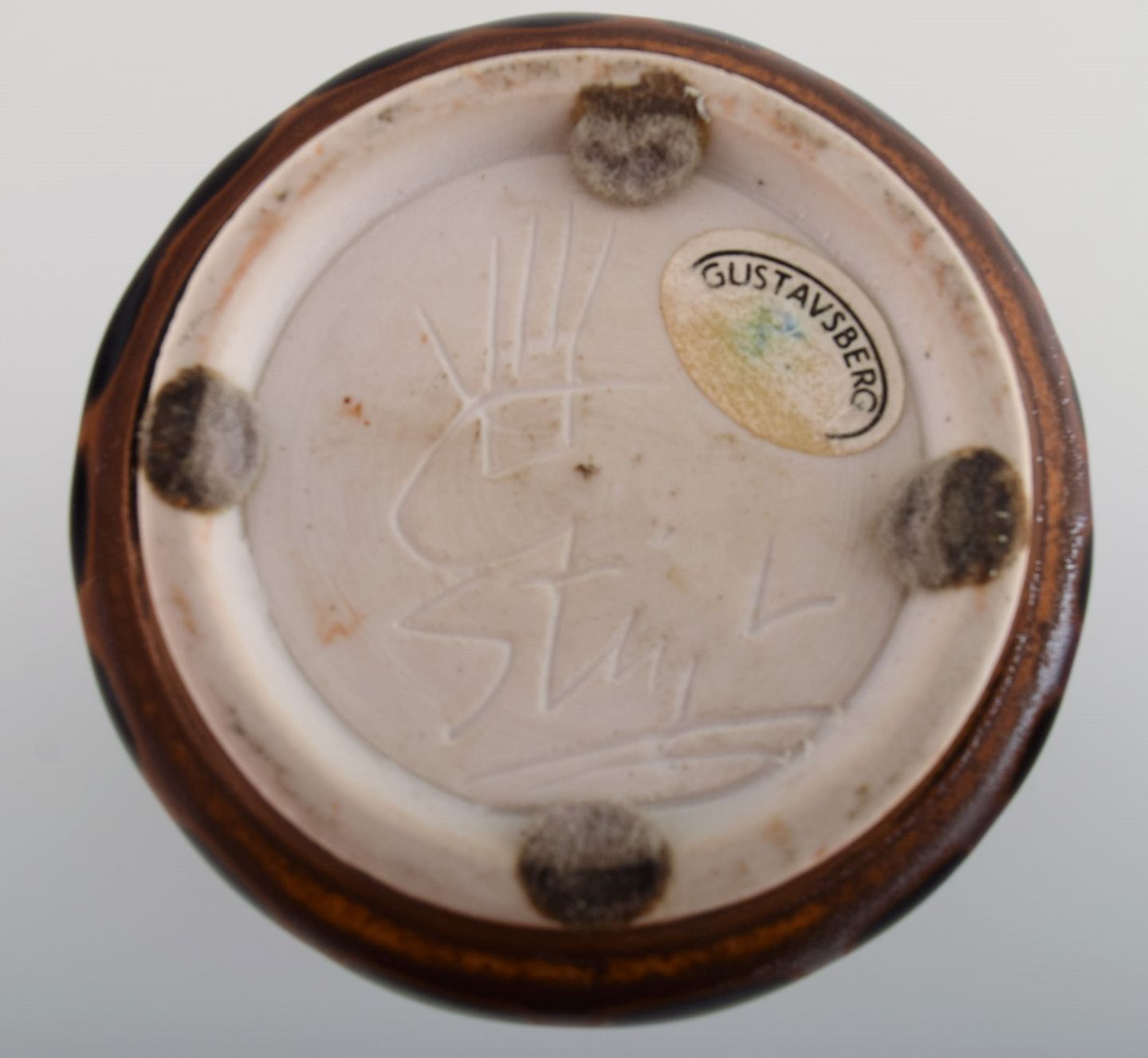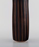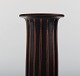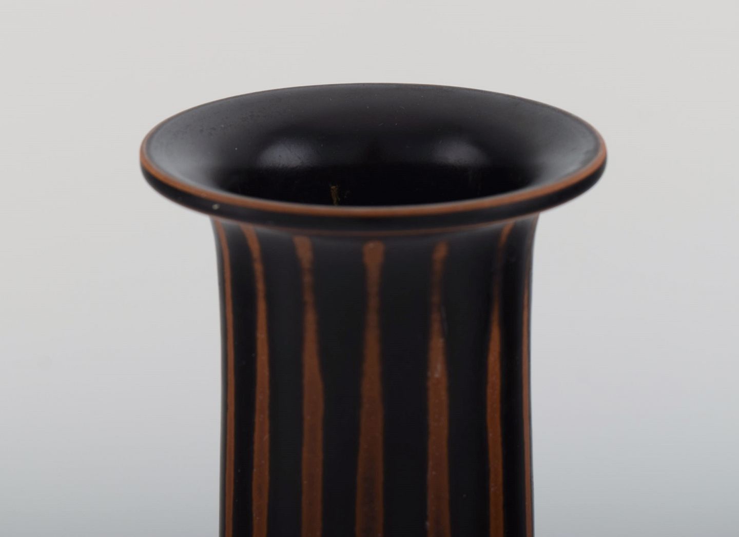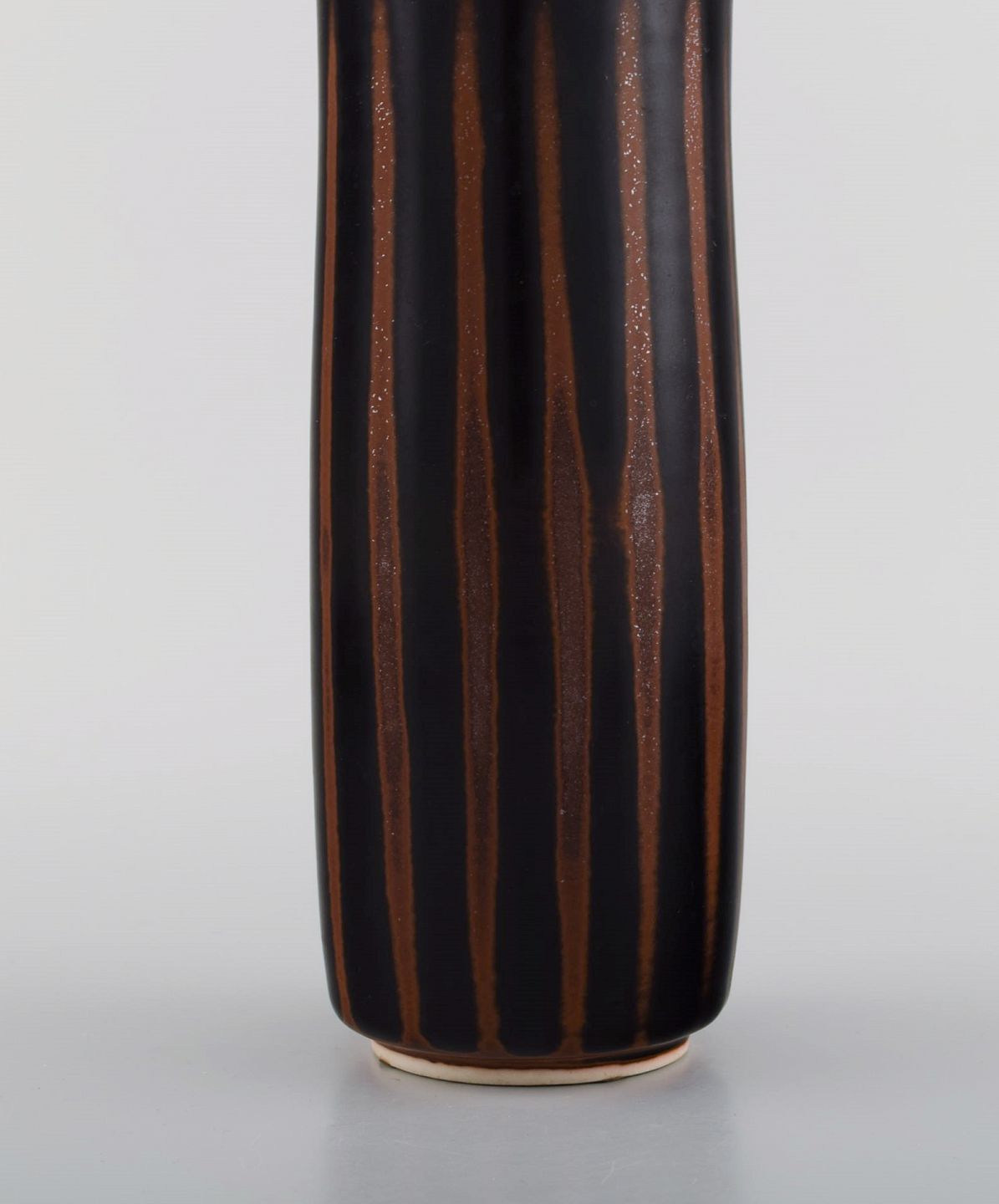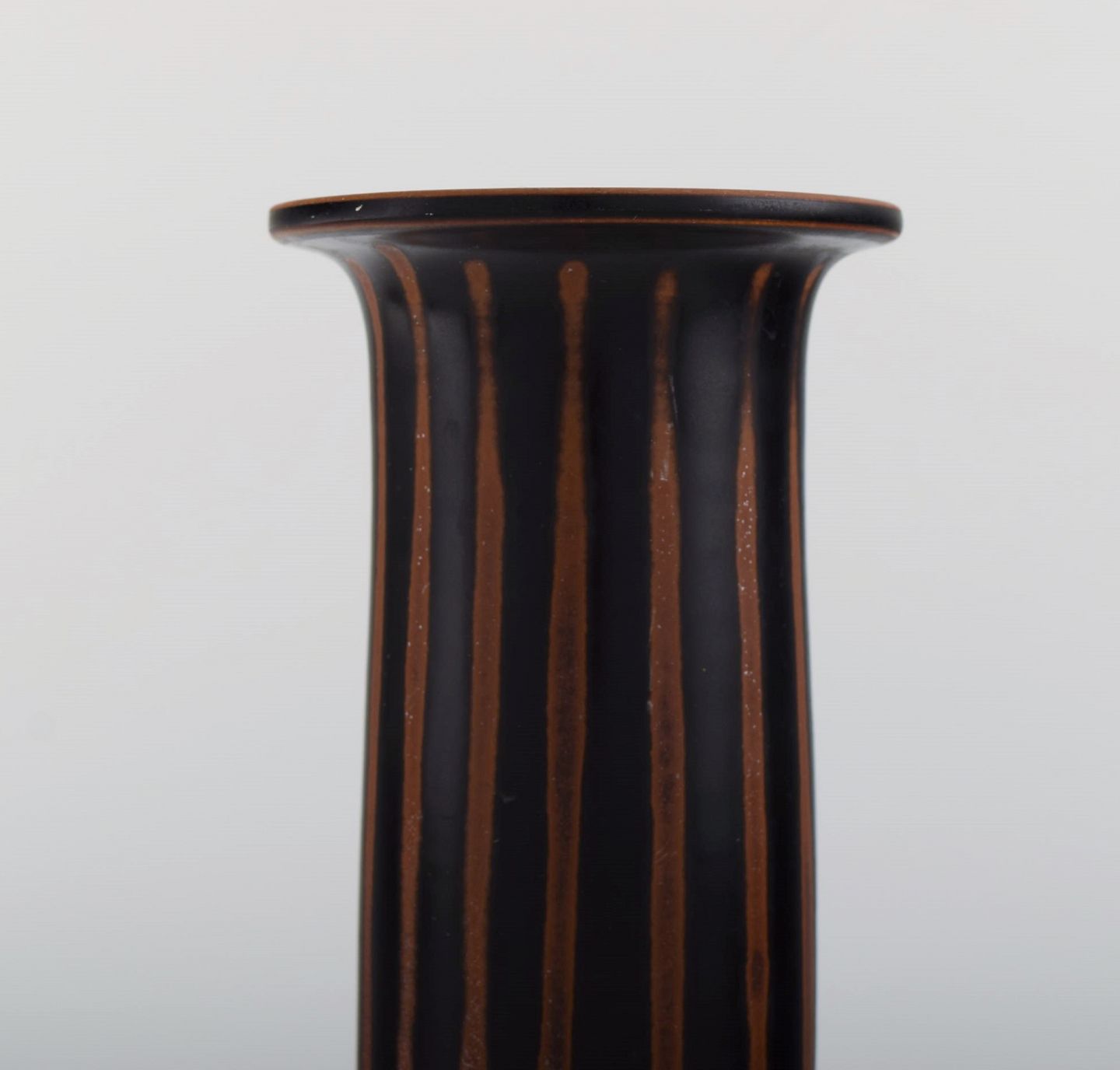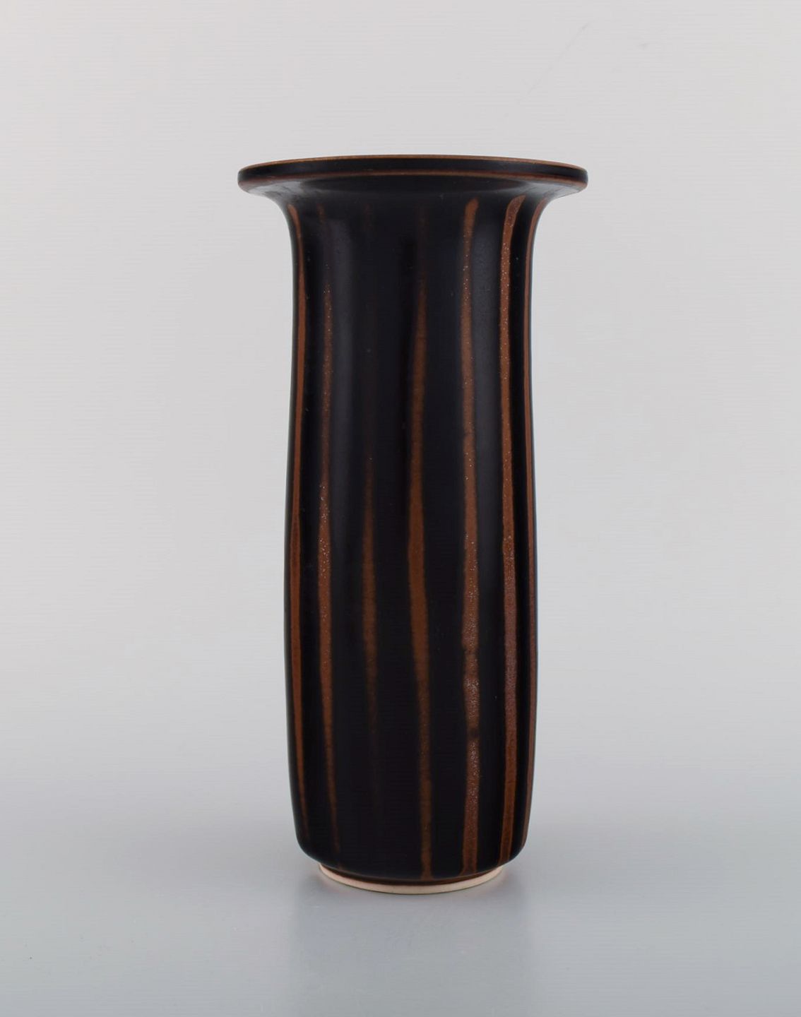 Stig Lindberg for Gustavsberg Studiohand. Vase i glaseret keramik. Smuk glasur i brune nuancer med stribet design. Midt 1900-tallet. Måler: 22 x 11 cm. Stemplet. I flot stand.