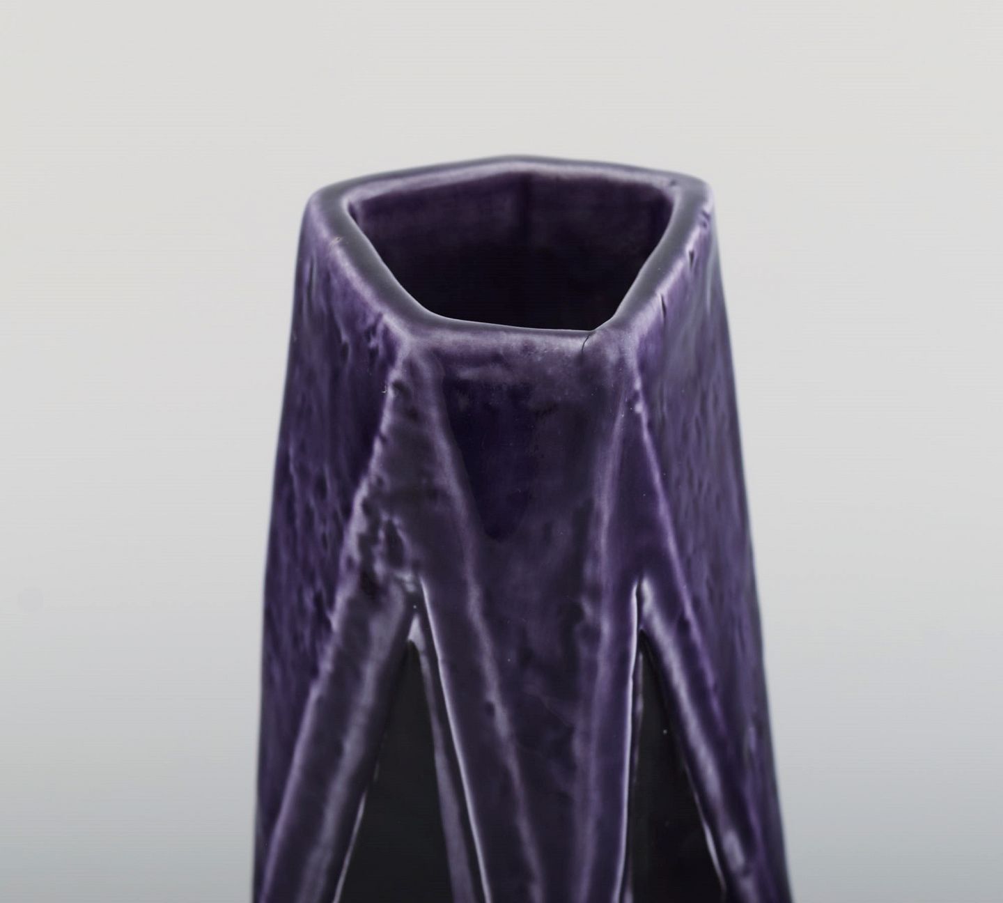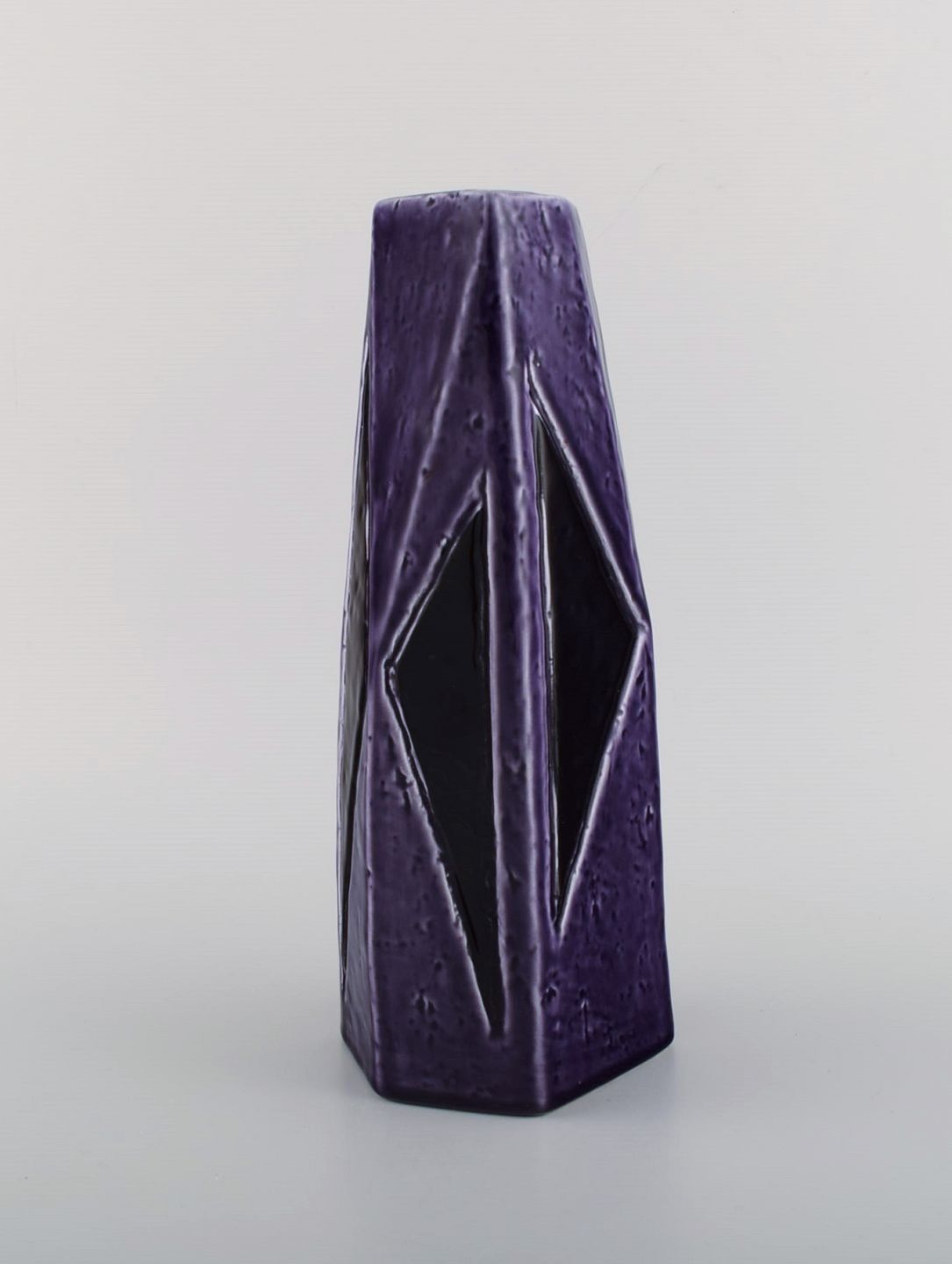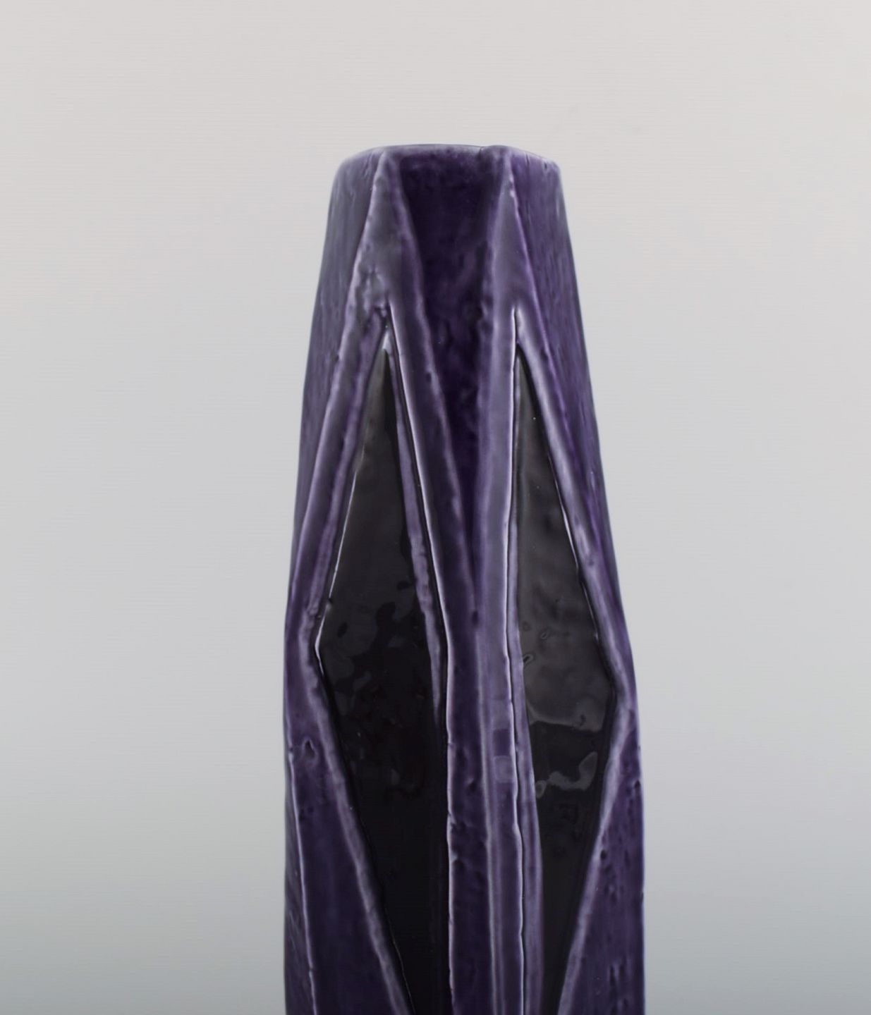 Vilhelm Bjerke Petersen (1909-1957) for Rörstrand. Fasett vase i glaseret keramik. Smuk glasur i lilla nuancer. Midt 1900-tallet. Måler: 27 x 11 cm. I flot stand. Stemplet.