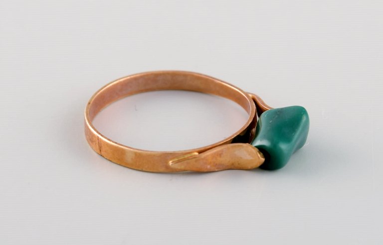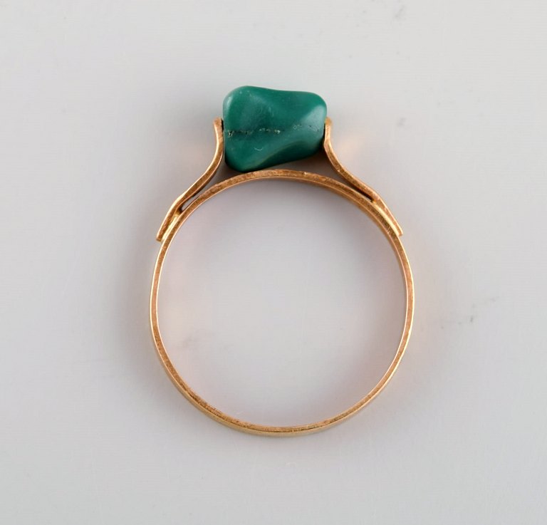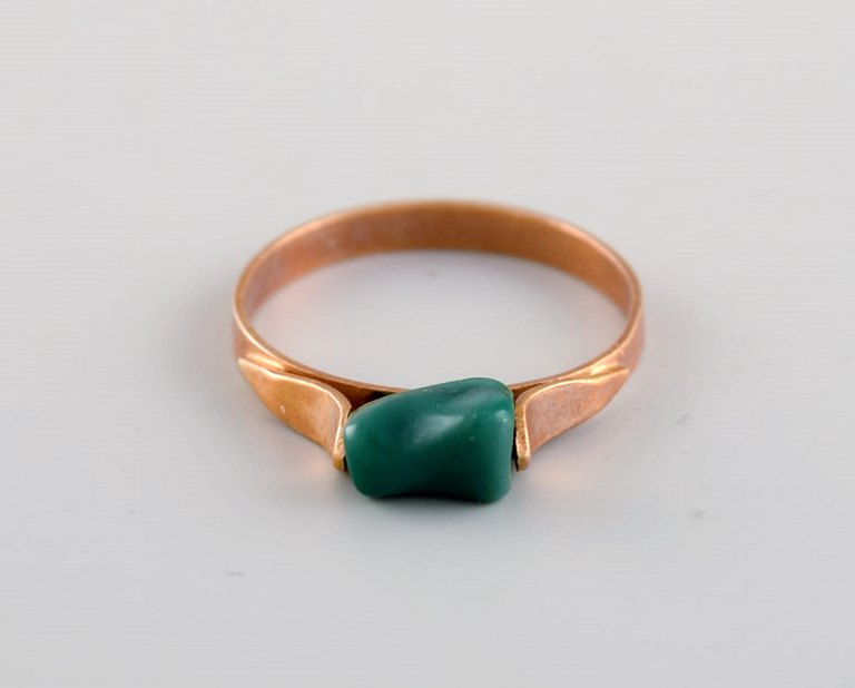 Dansk guldsmed. Modernistisk ring i 14 karat guld med grøn jade. Midt 1900-tallet.
