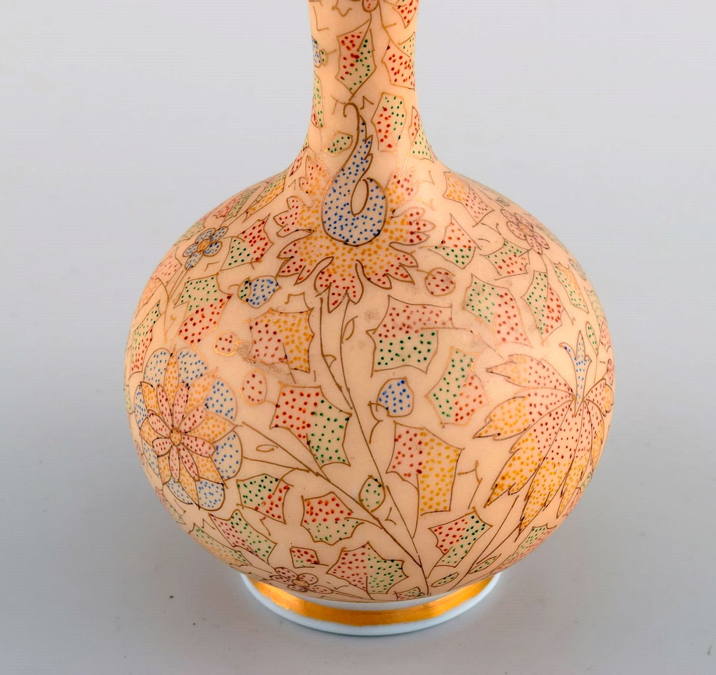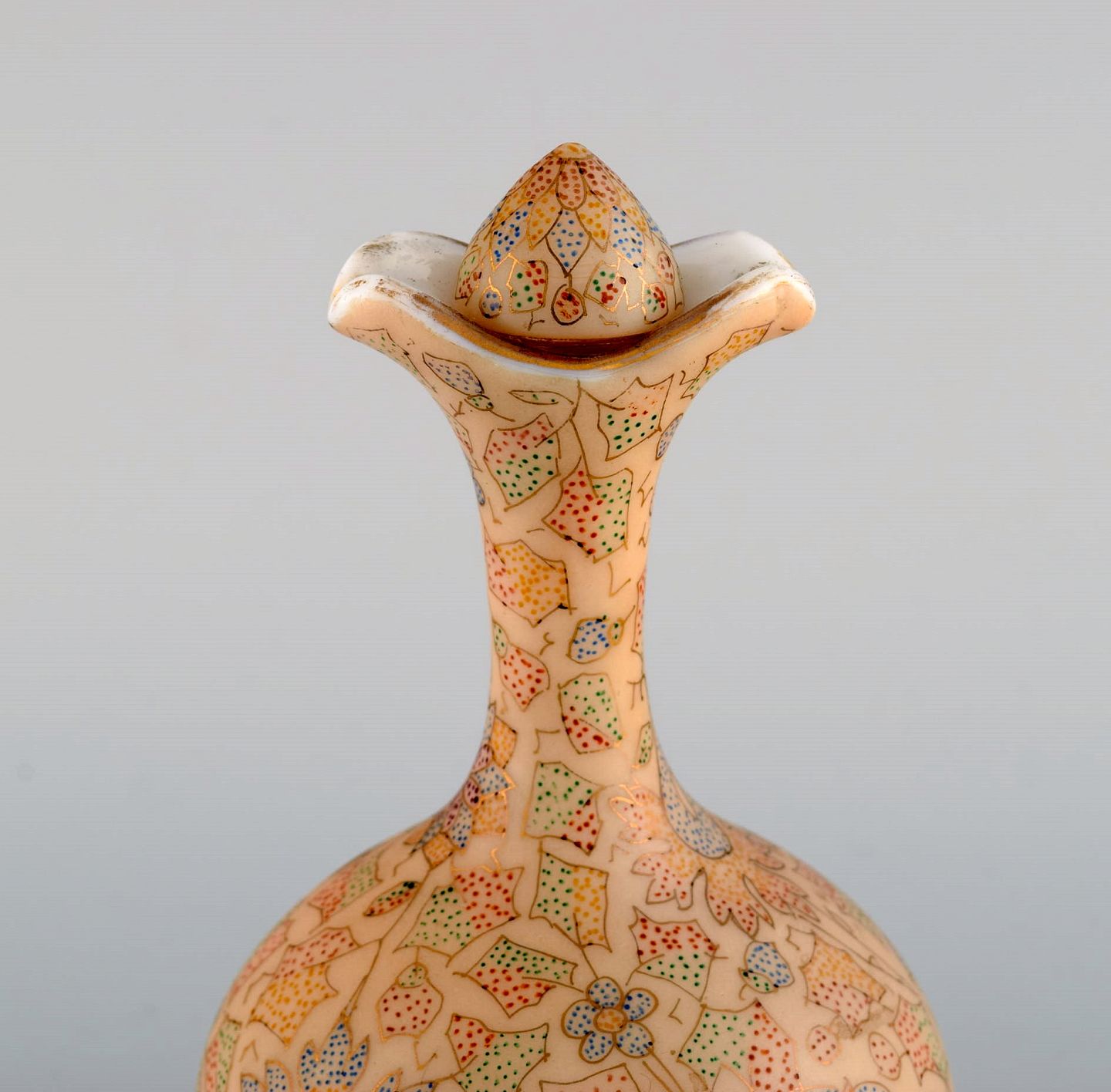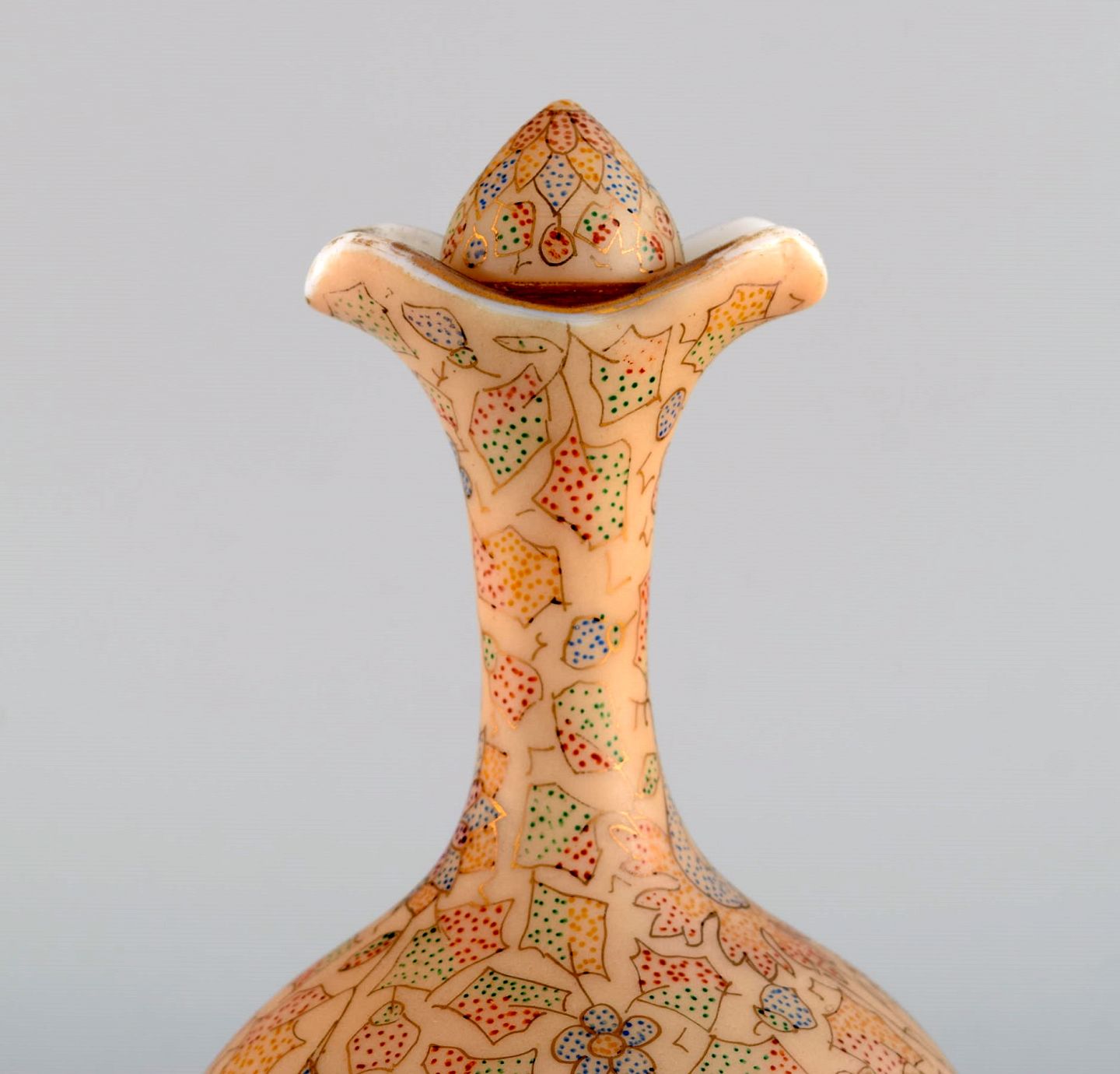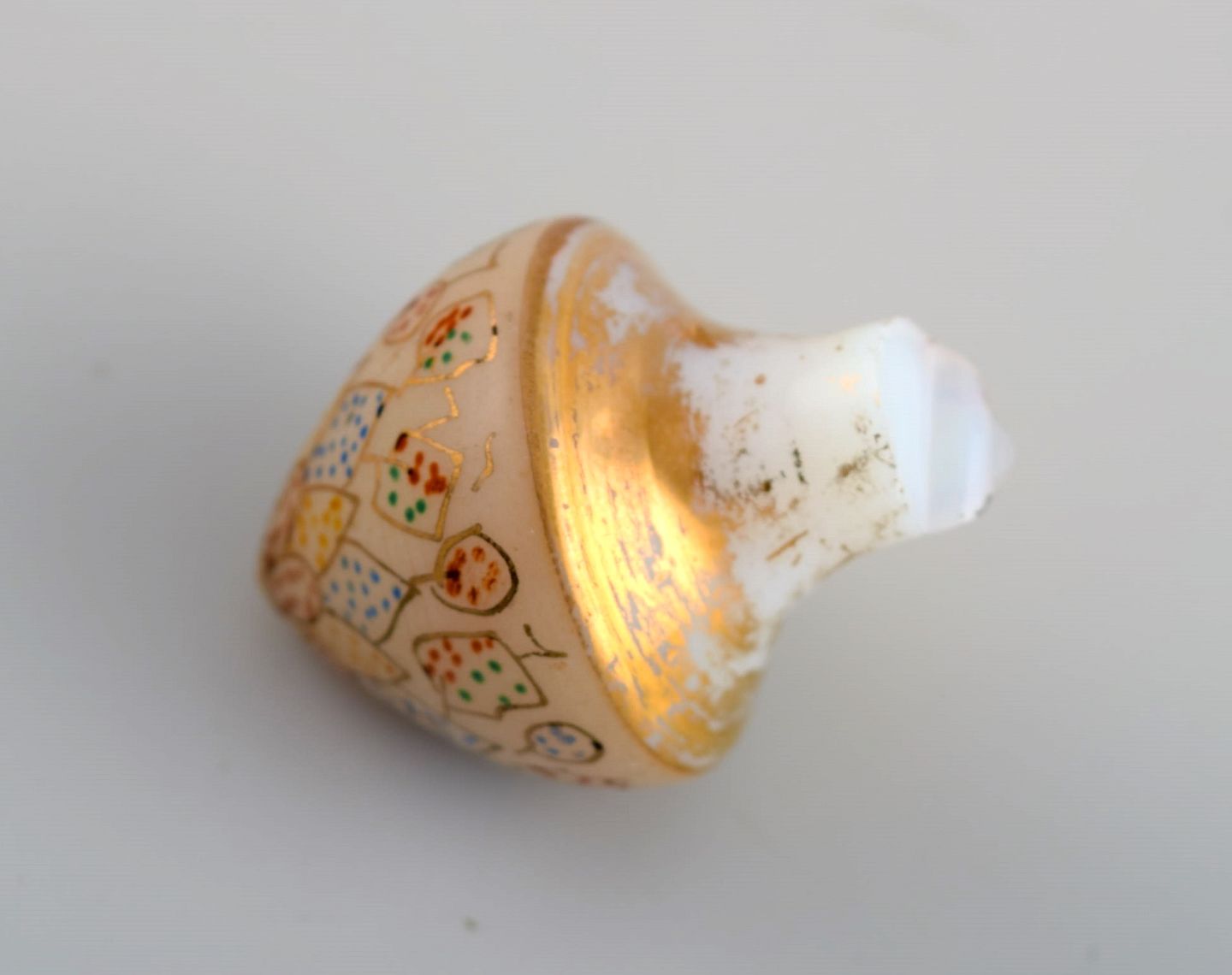 Antik flakon i mundblæst kunstglas dekoreret med bladværk. Frankrig, sent 1800-tallet. Måler: 18 x 9,5 cm. I flot stand. Skade på proppen. Signeret.