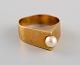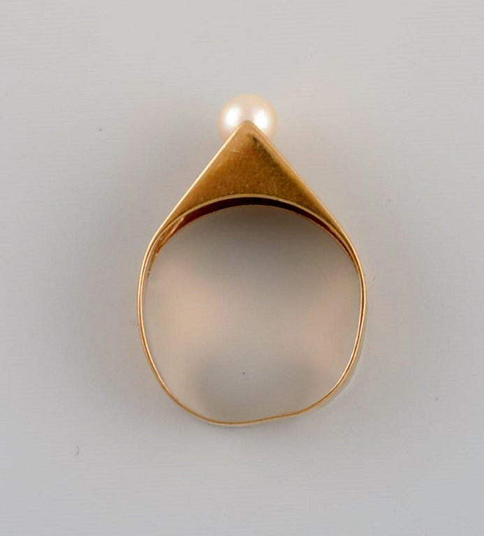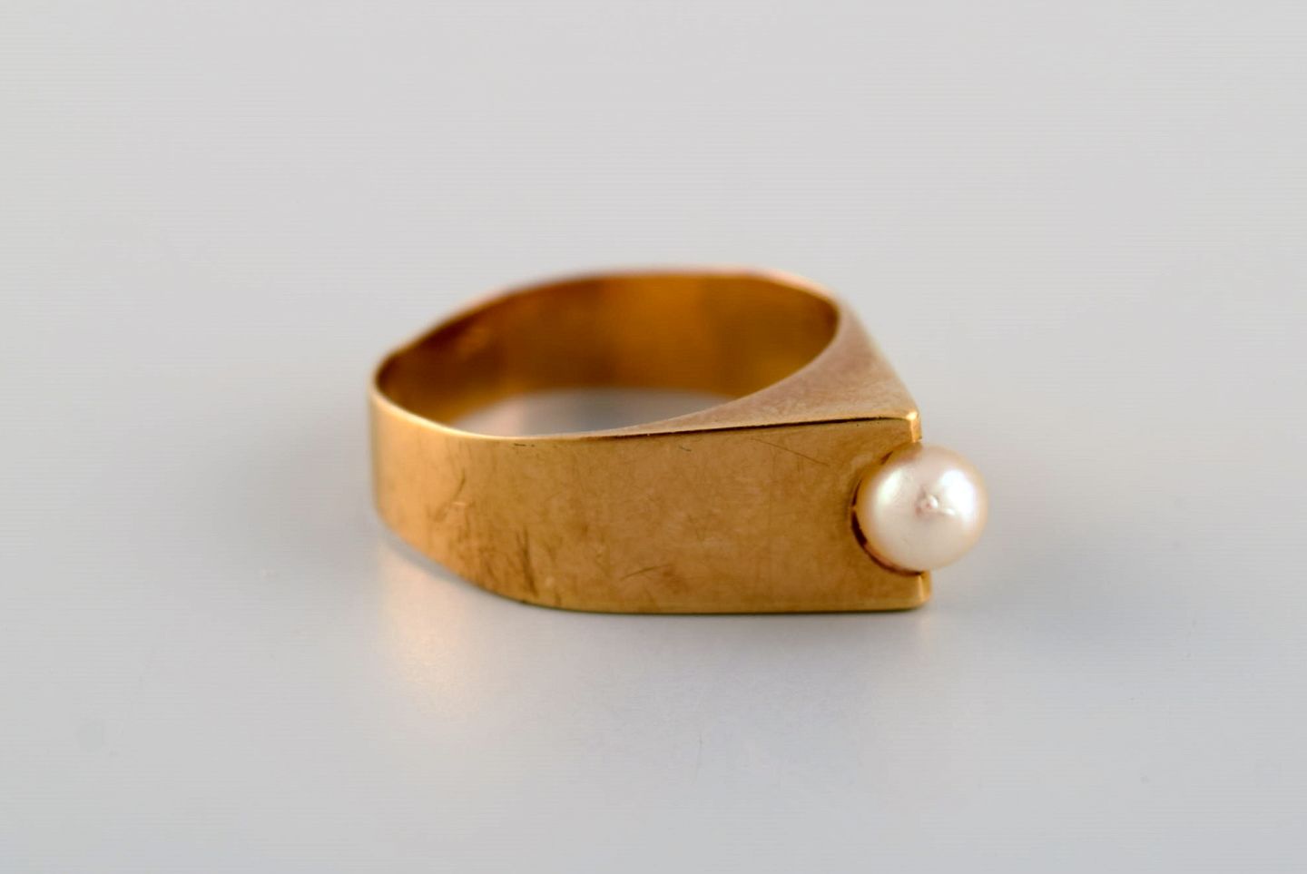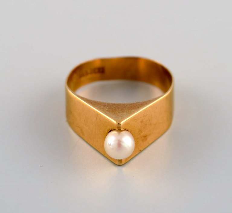 Svensk guldsmed. Modernistisk vintage ring i 18 karat guld prydet med kulturperle. Dateret 1965.