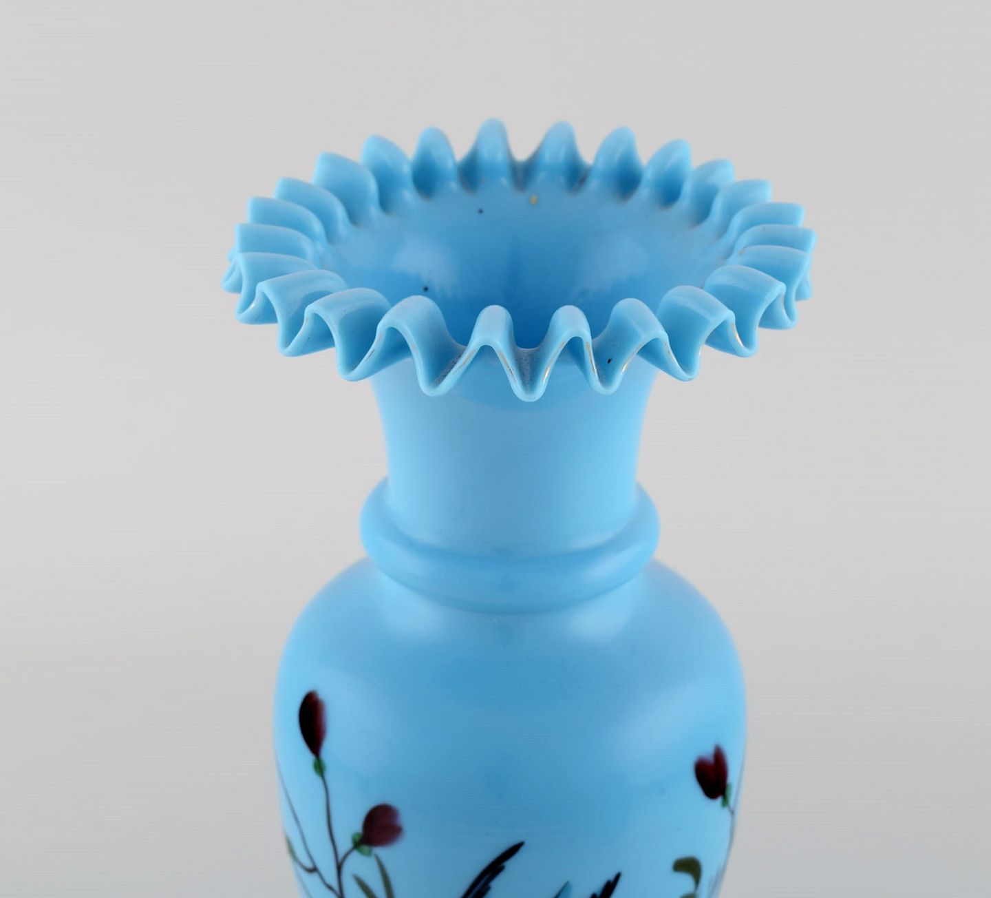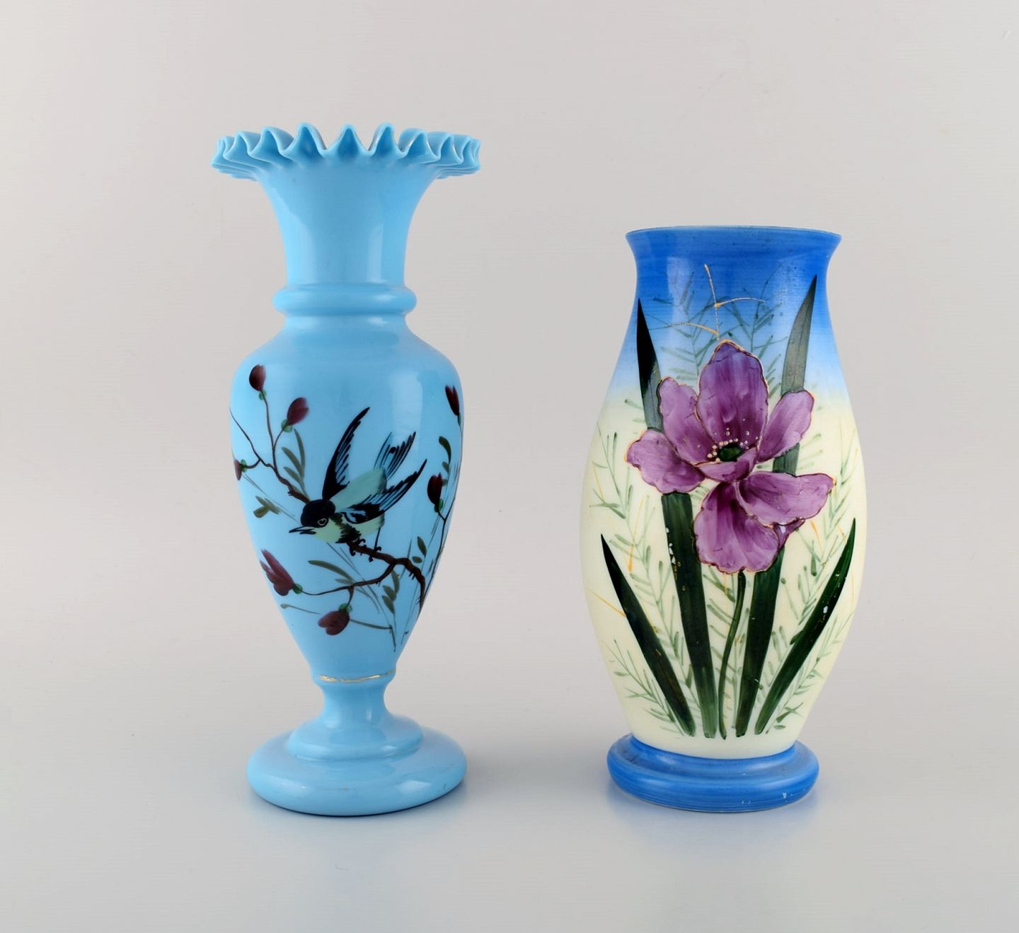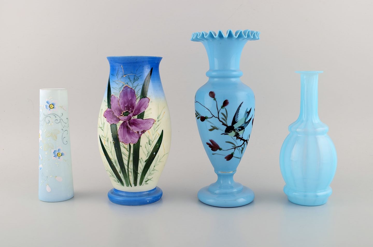 Fire antikke vaser i håndmalet mundblæst opalineglas i blå og turkis nuancer. Ca. 1900. Største måler: 27 x 11,5 cm. I flot stand.