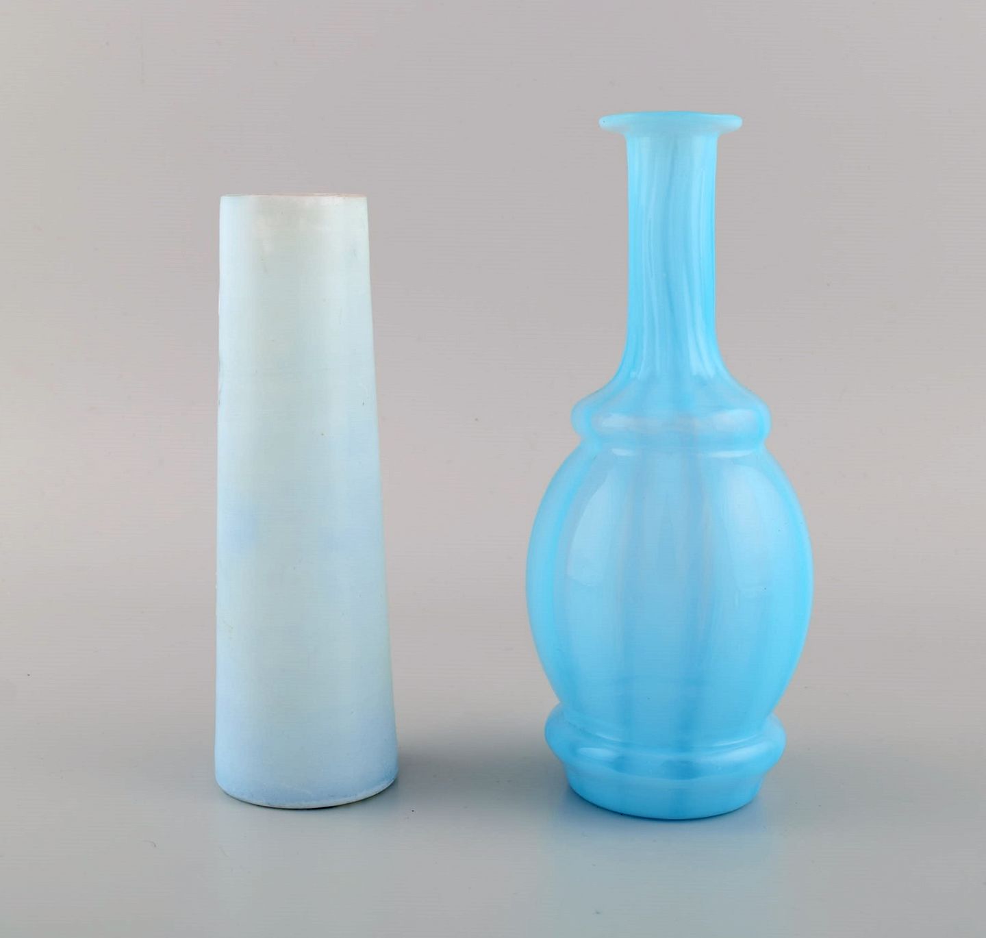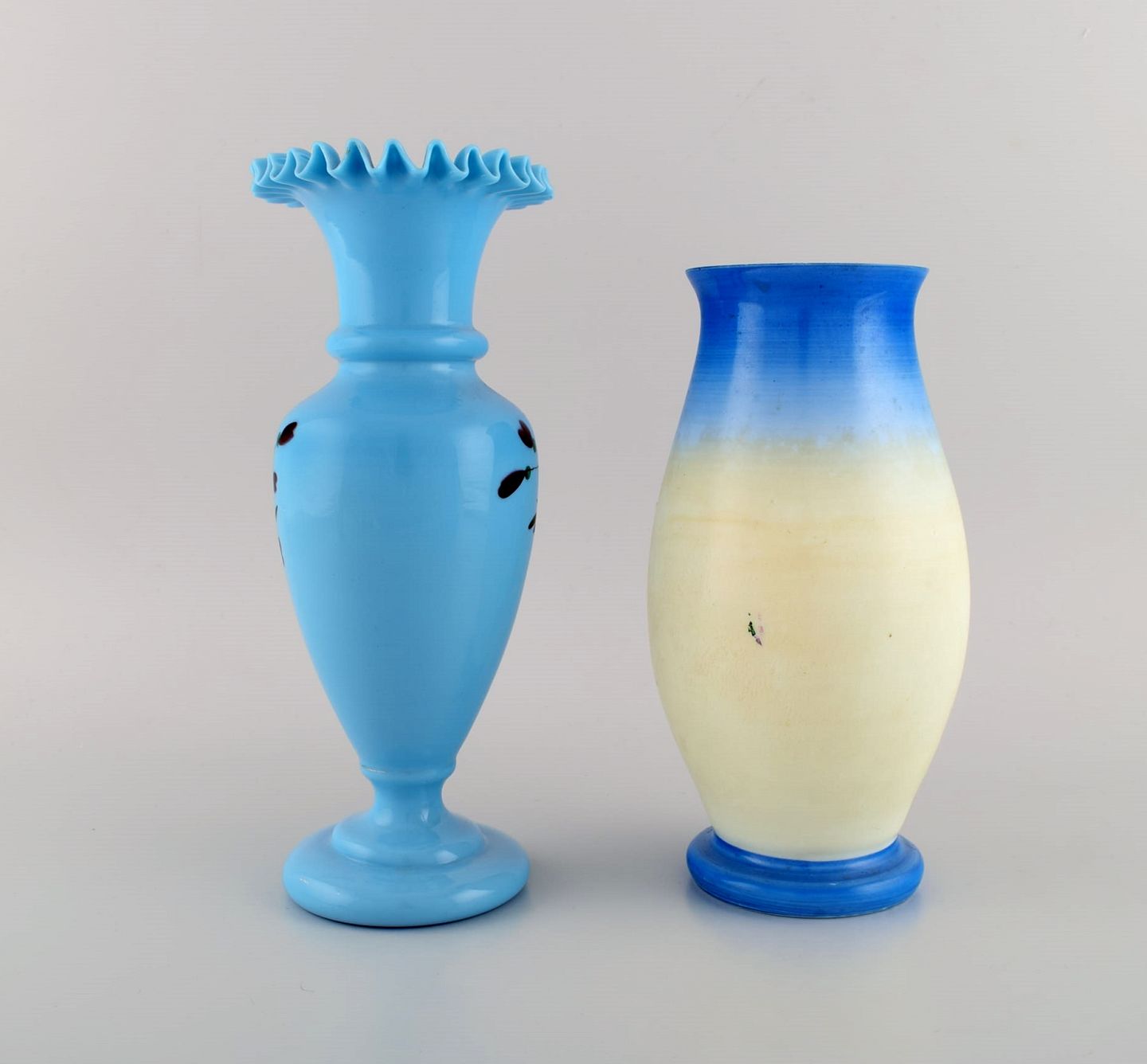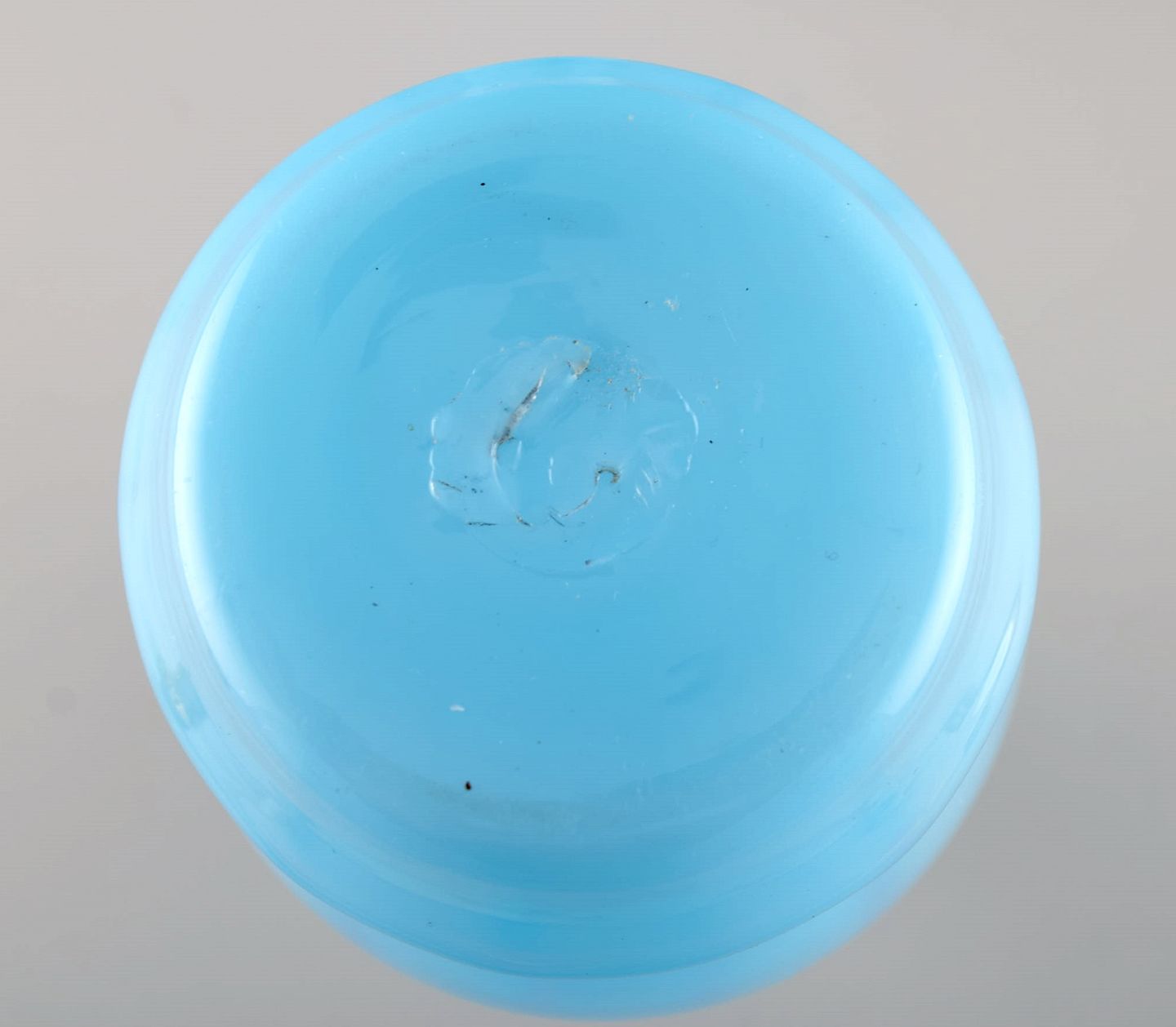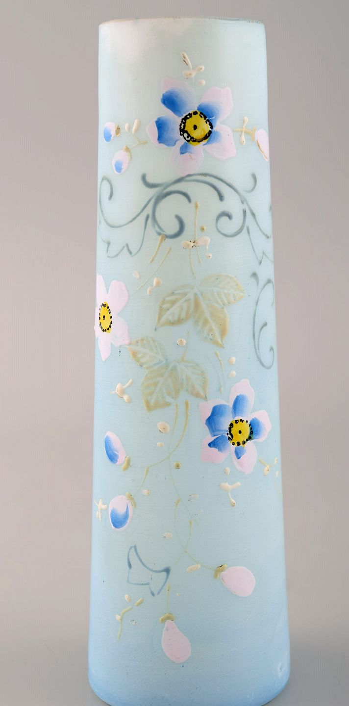 Fire antikke vaser i håndmalet mundblæst opalineglas i blå og turkis nuancer. Ca. 1900. Største måler: 27 x 11,5 cm. I flot stand.