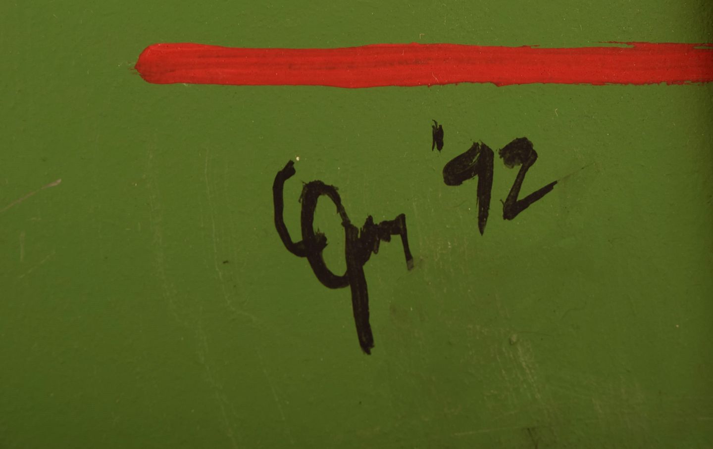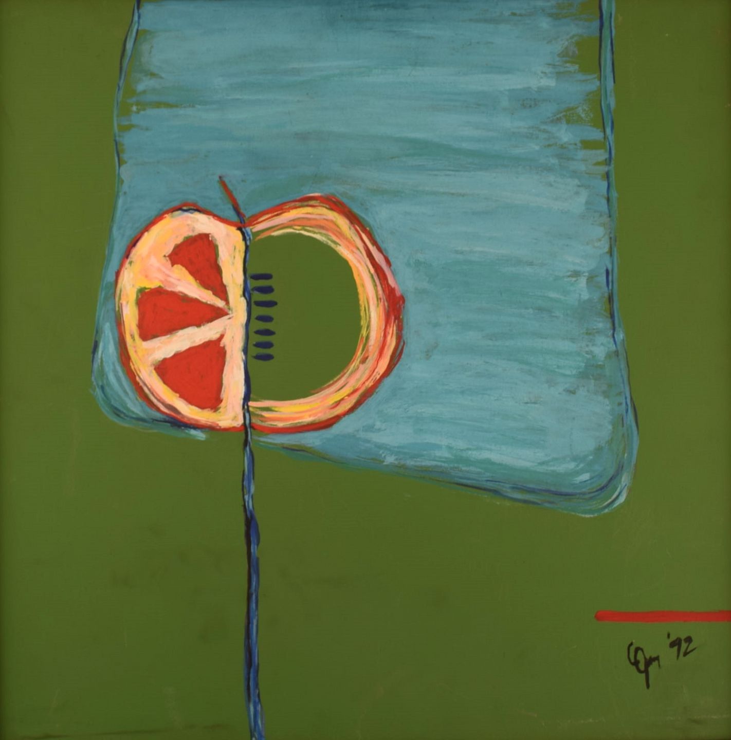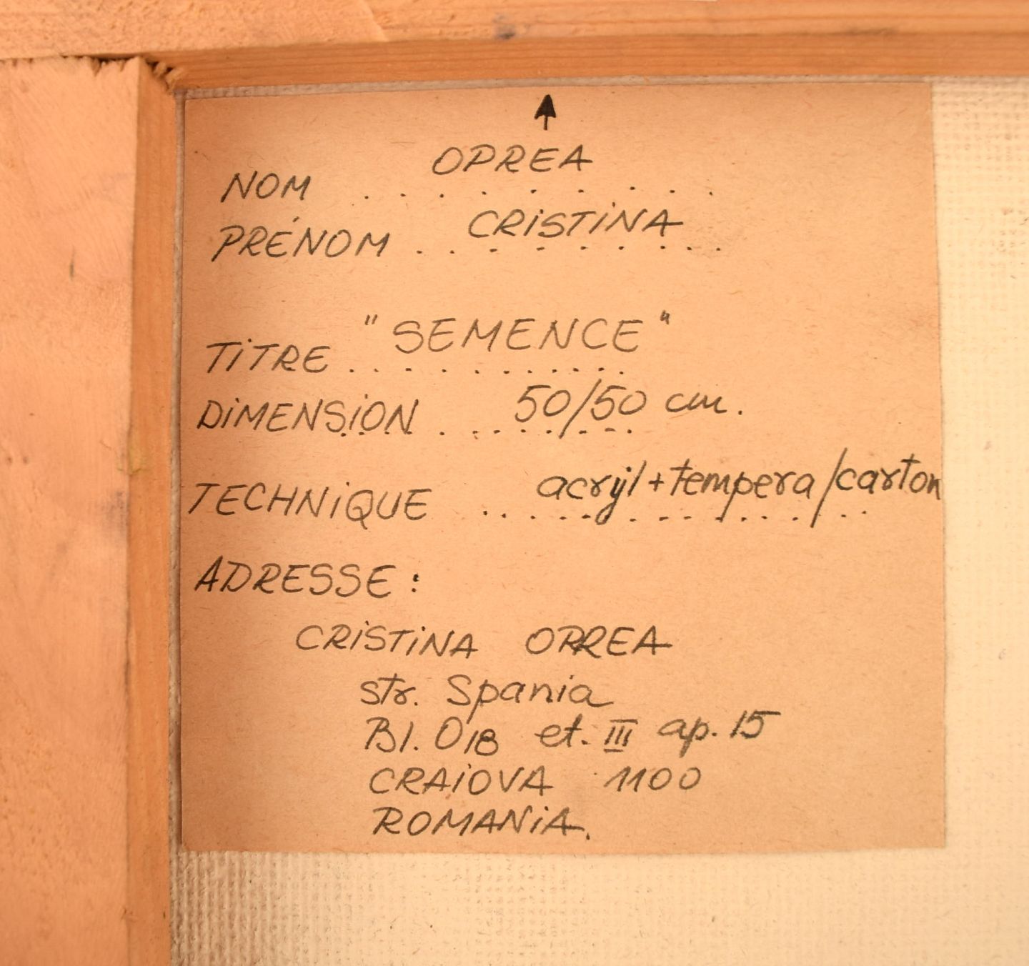 Christina Oprea, rumænsk kunstner. Akryl og tempera på karton. Abstrakt komposition. Dateret 1992. Pladen måler: 49 x 49 cm. Rammen måler: 1 cm. Signeret. I flot stand.