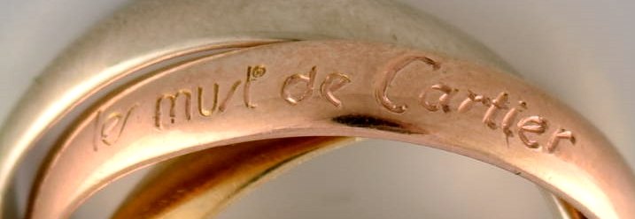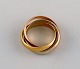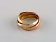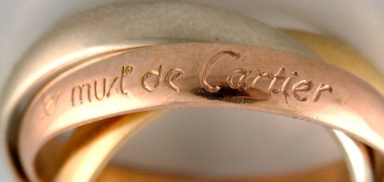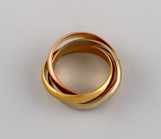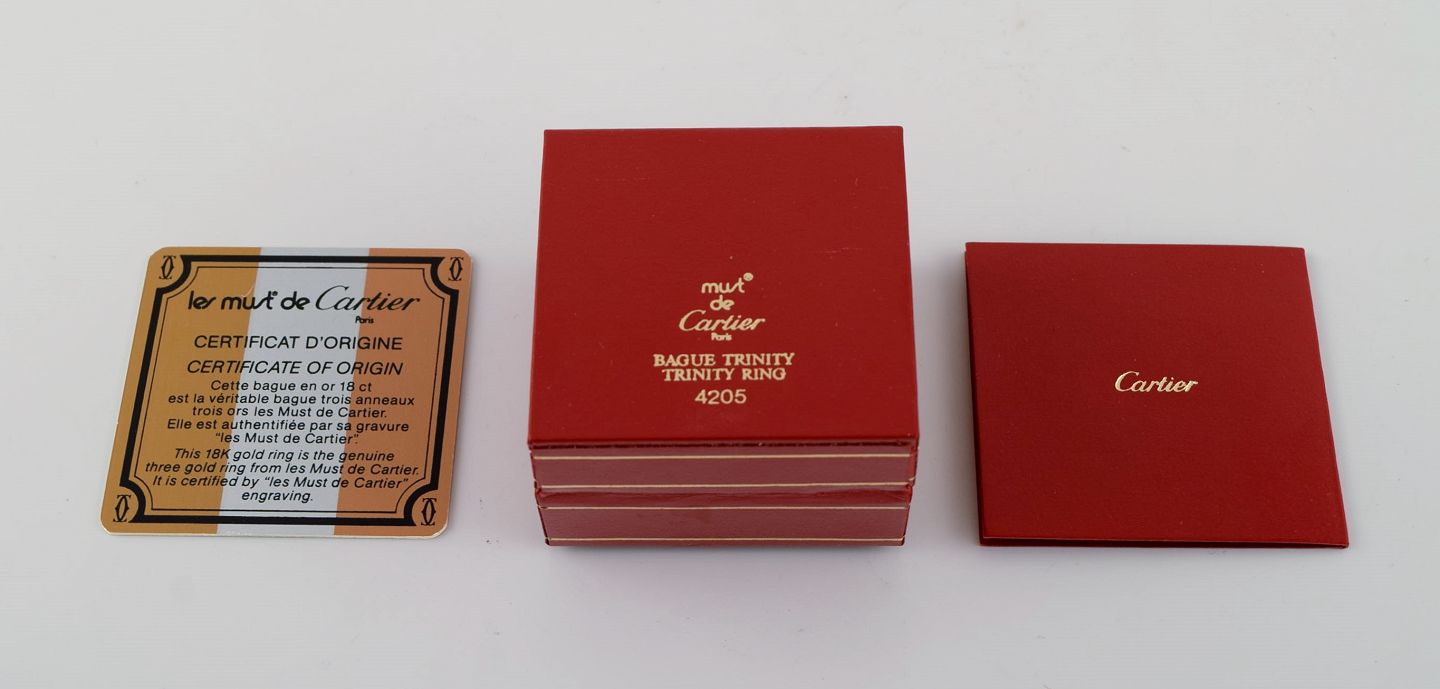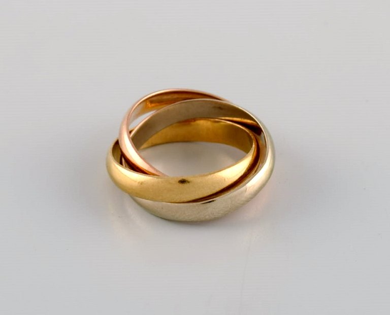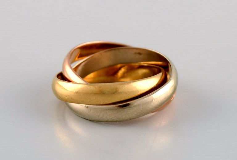 Cartier trinity ring i 18 karat rødguld, hvidguld og guld. 1970'erne. Diameter: 16 mm. I flot stand. Stemplet. Original æske og certifikat medfølger.