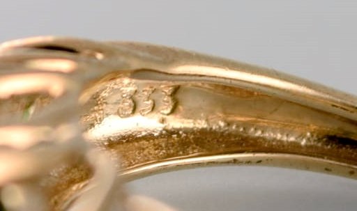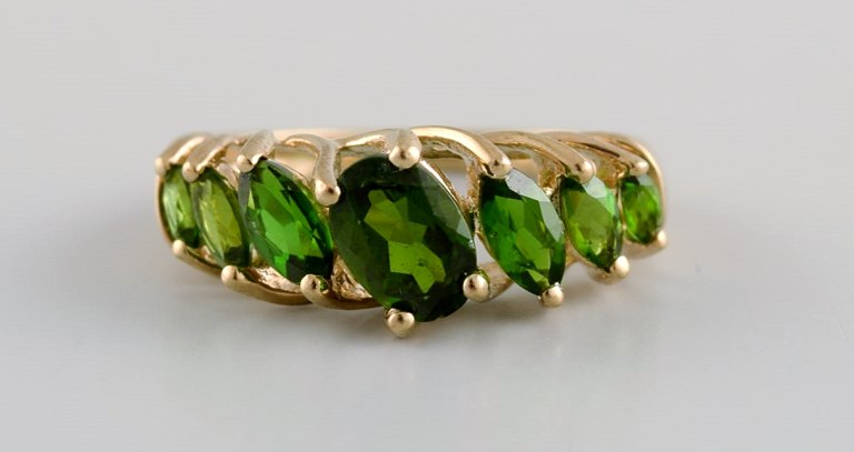 Skandinavisk guldsmed. Vintage alliancering i 8 karat guld prydet med grønne halvædelsten. Midt 1900-tallet.