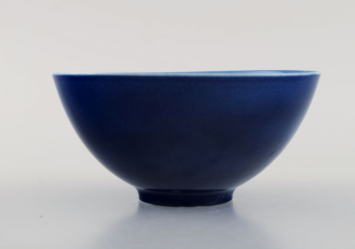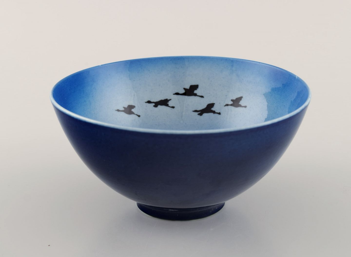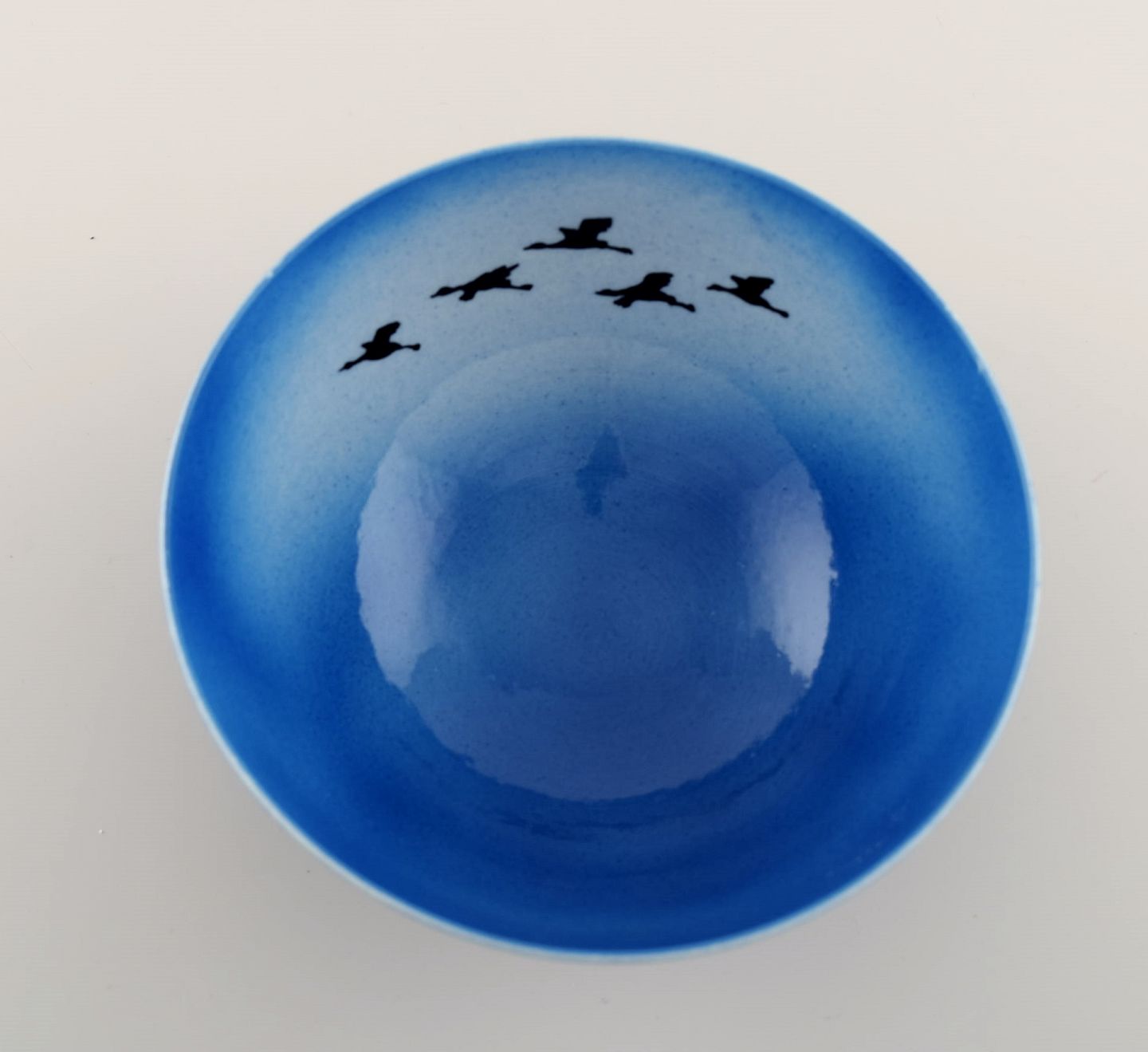 Sven Wejsfelt (1930-2009), Gustavsberg Studiohand. Unika skål i glaseret keramik med håndmalede fugle. Smuk glasur i blå nuancer. Dateret 1991. Måler: 14,3 x 6,8 cm. I flot stand. Signeret og dateret.