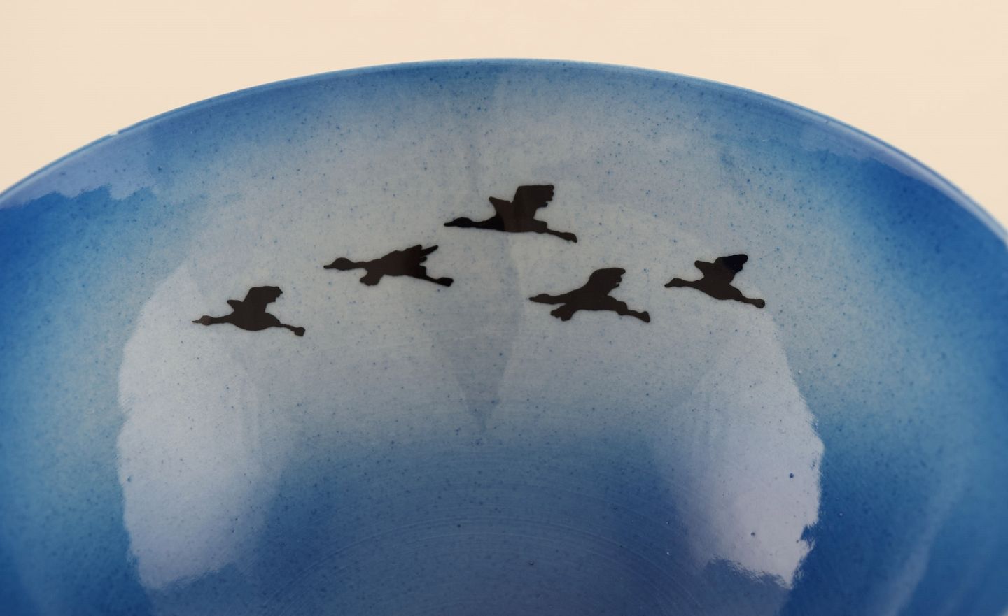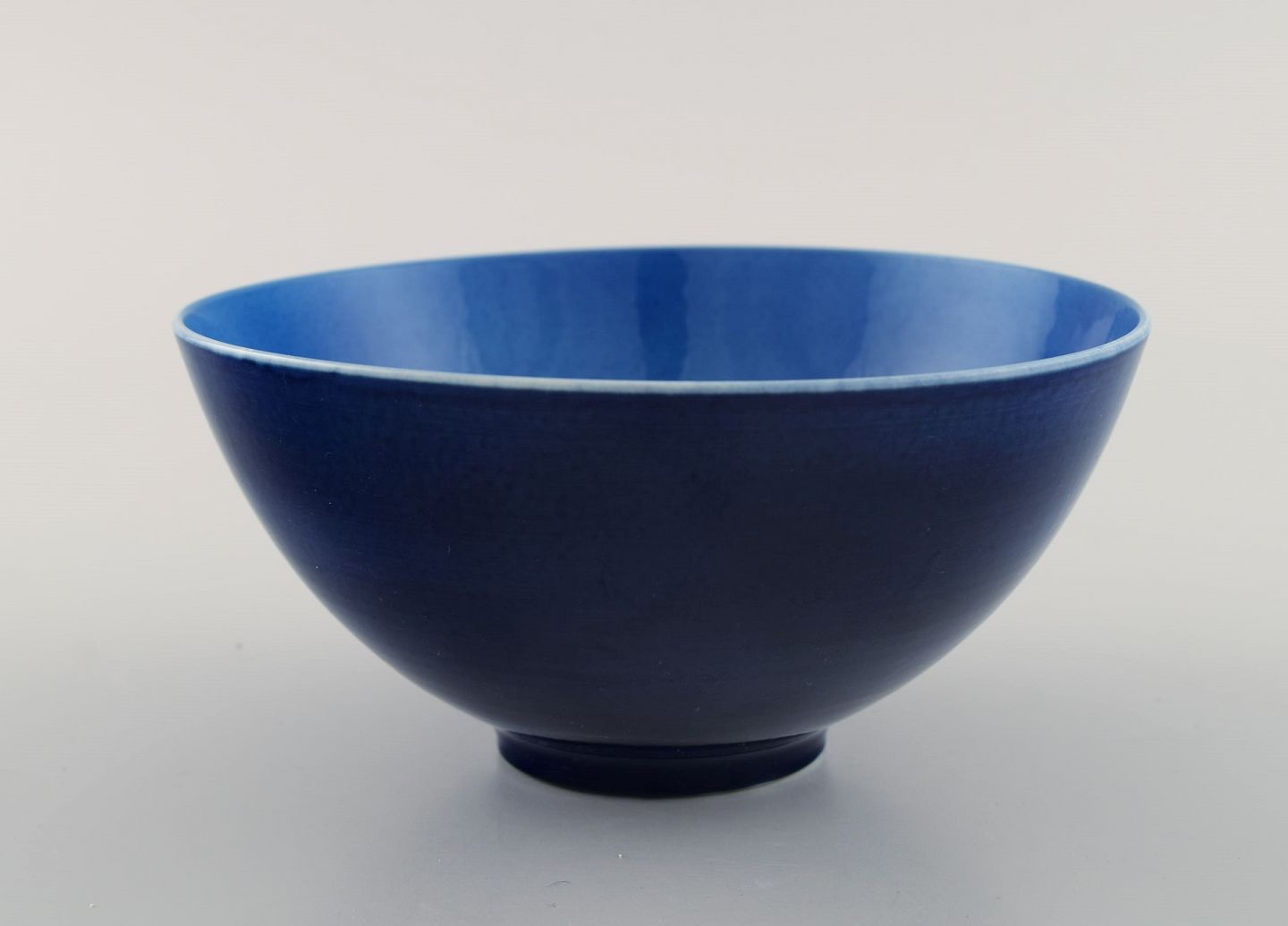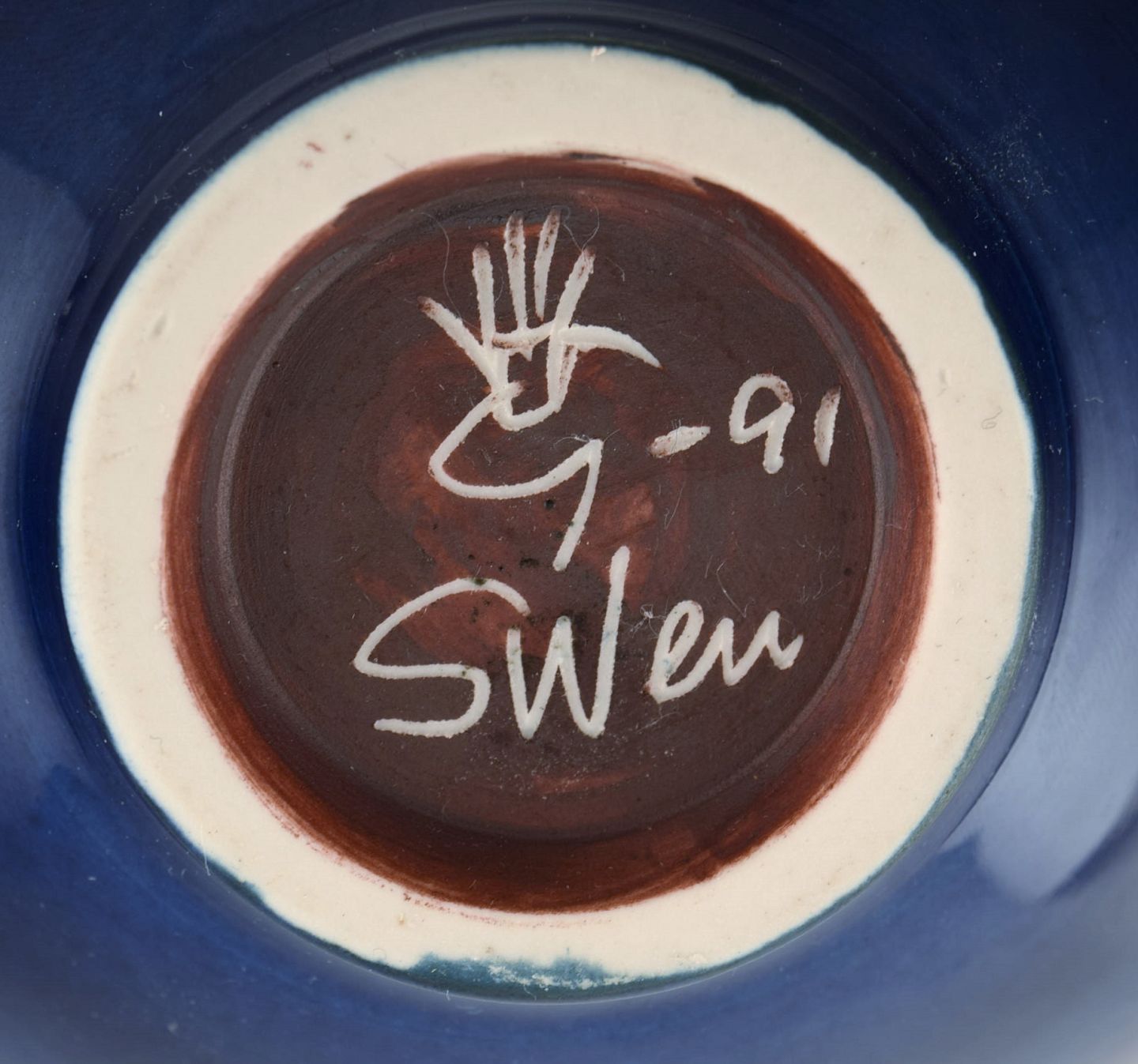 Sven Wejsfelt (1930-2009), Gustavsberg Studiohand. Unika skål i glaseret keramik med håndmalede fugle. Smuk glasur i blå nuancer. Dateret 1991. Måler: 14,3 x 6,8 cm. I flot stand. Signeret og dateret.