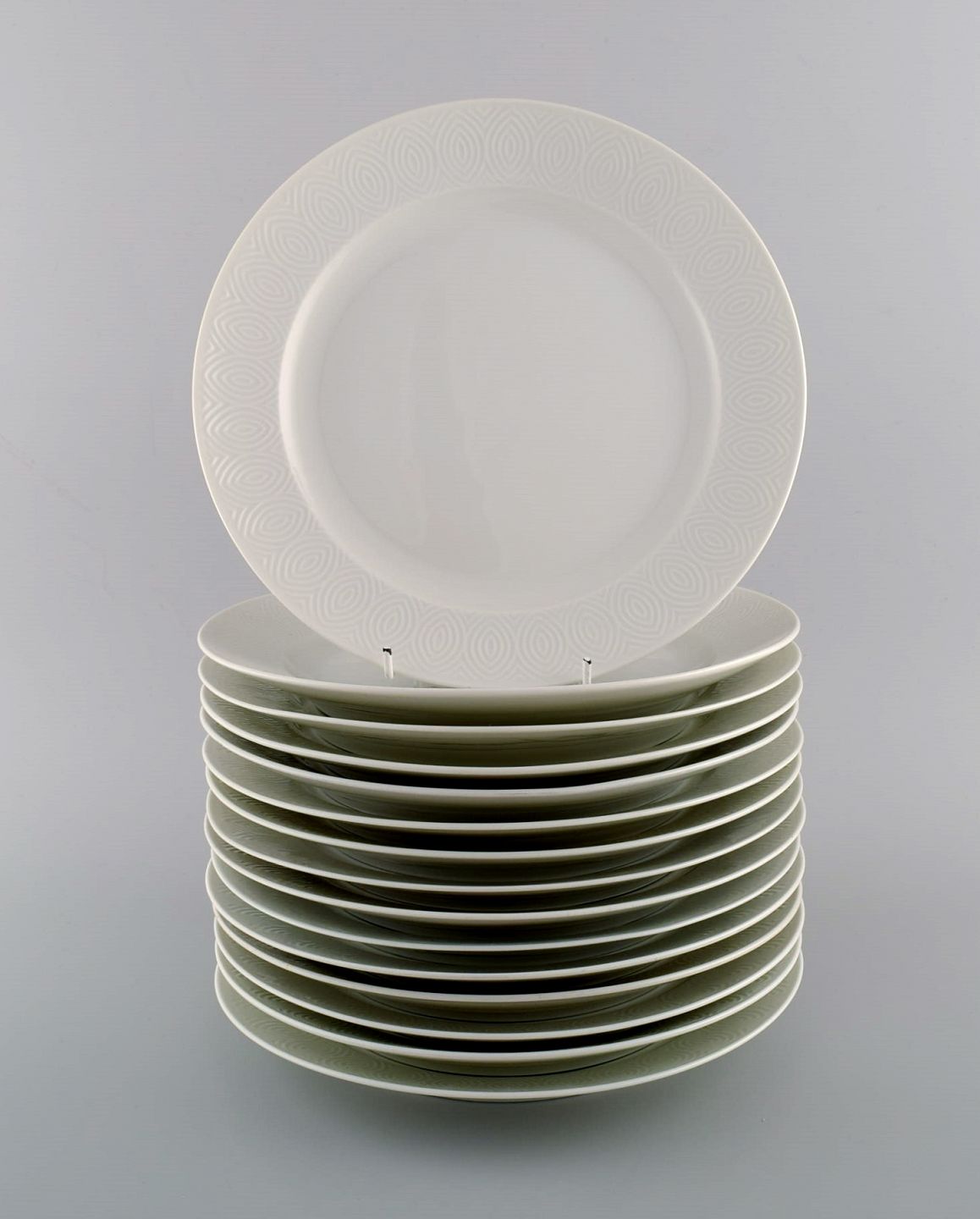 Royal Copenhagen. Salto Stel, Hvidt. 15 middagstallerkener. 1960'erne. Diameter: 25 cm. I flot stand. 1. sortering. Tegnet af Axel Salto i 1956.