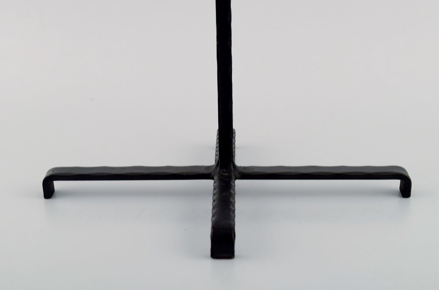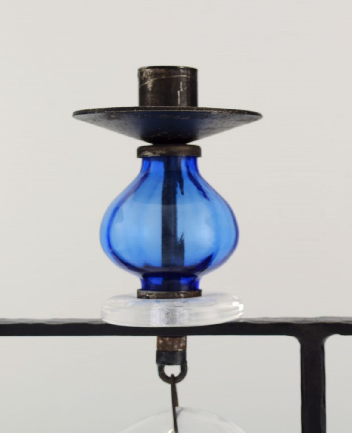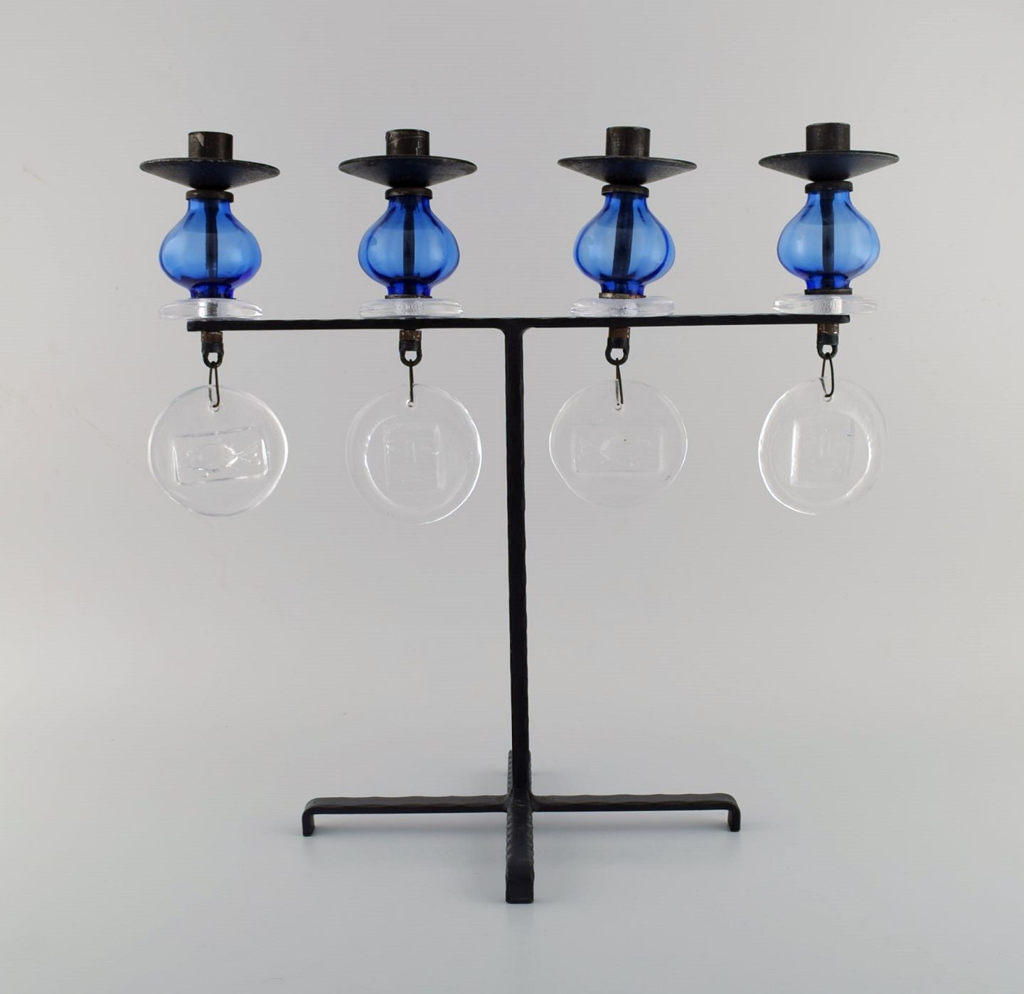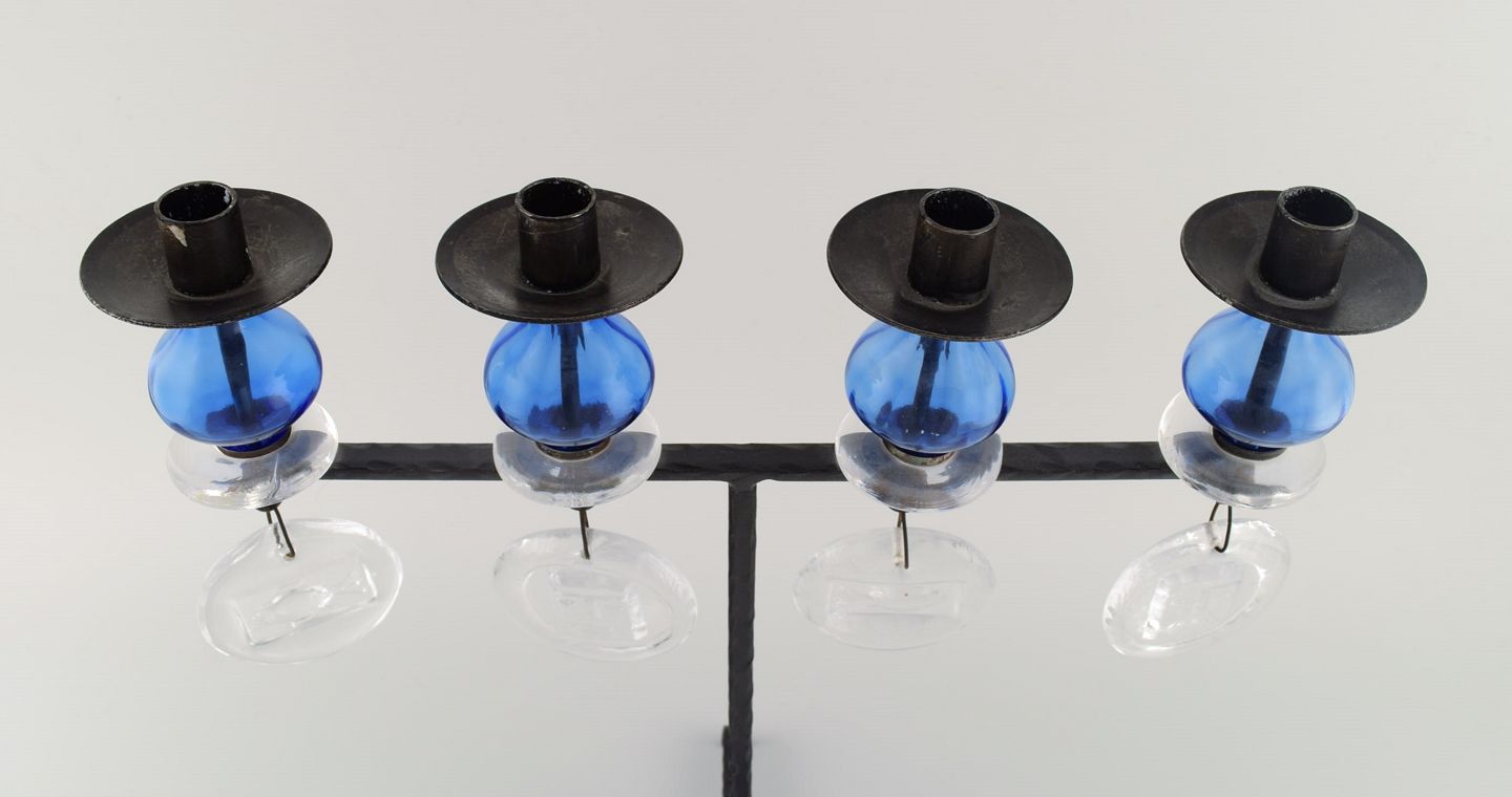 Erik Höglund for Kosta Boda, stor lysestage i støbejern med mundblæste glas. Midt 1900-tallet. I flot stand. Måler 44 x 42,5 cm.