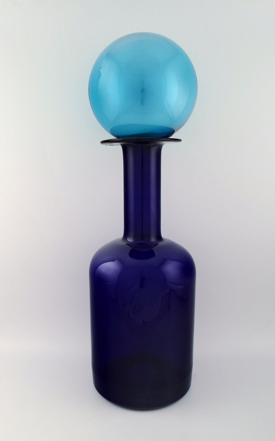 Otto Brauer for Holmegaard. Gigantisk vase/flaske i blåt kunstglas med blå kugle. 1960'erne. Måler: 68,5 x 21 cm (inkl kugle). I perfekt stand.