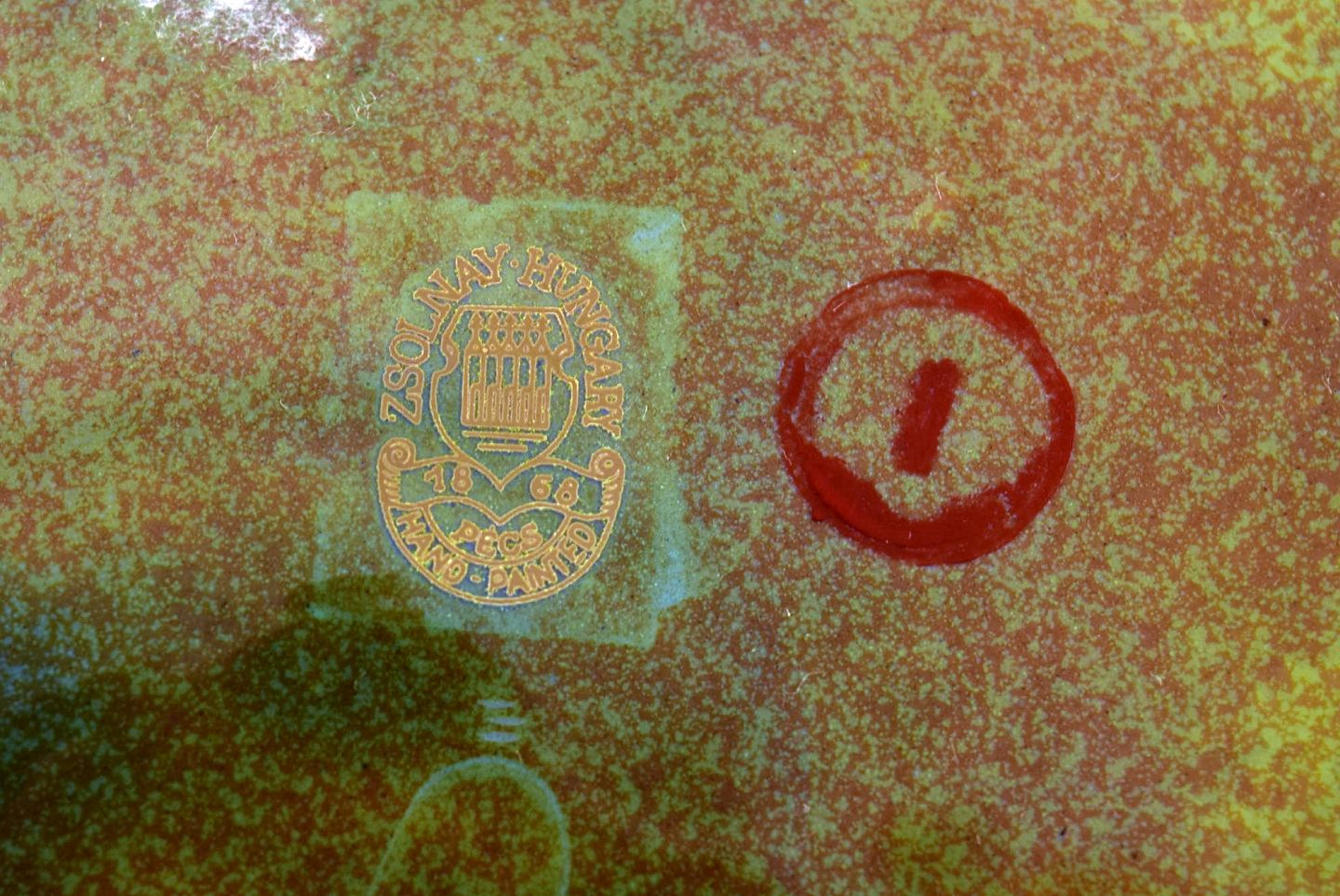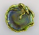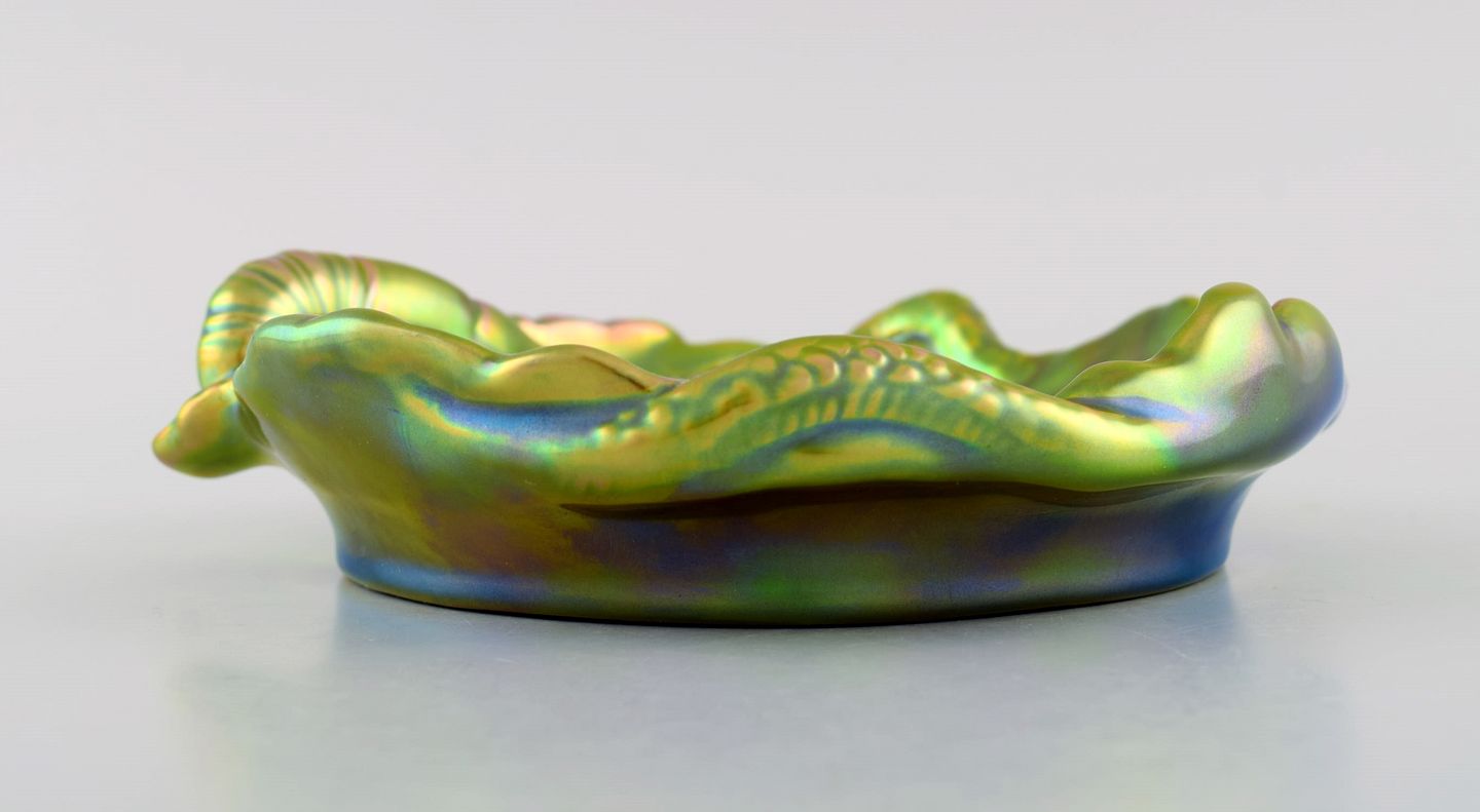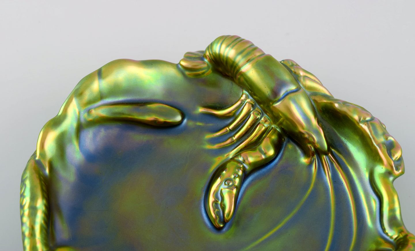 Zsolnay skål i glaseret stentøj modelleret med krebs. Smuk eozin glasur. Midt 1900-tallet. Måler: 17 x 5 cm. I flot stand. Stemplet.
