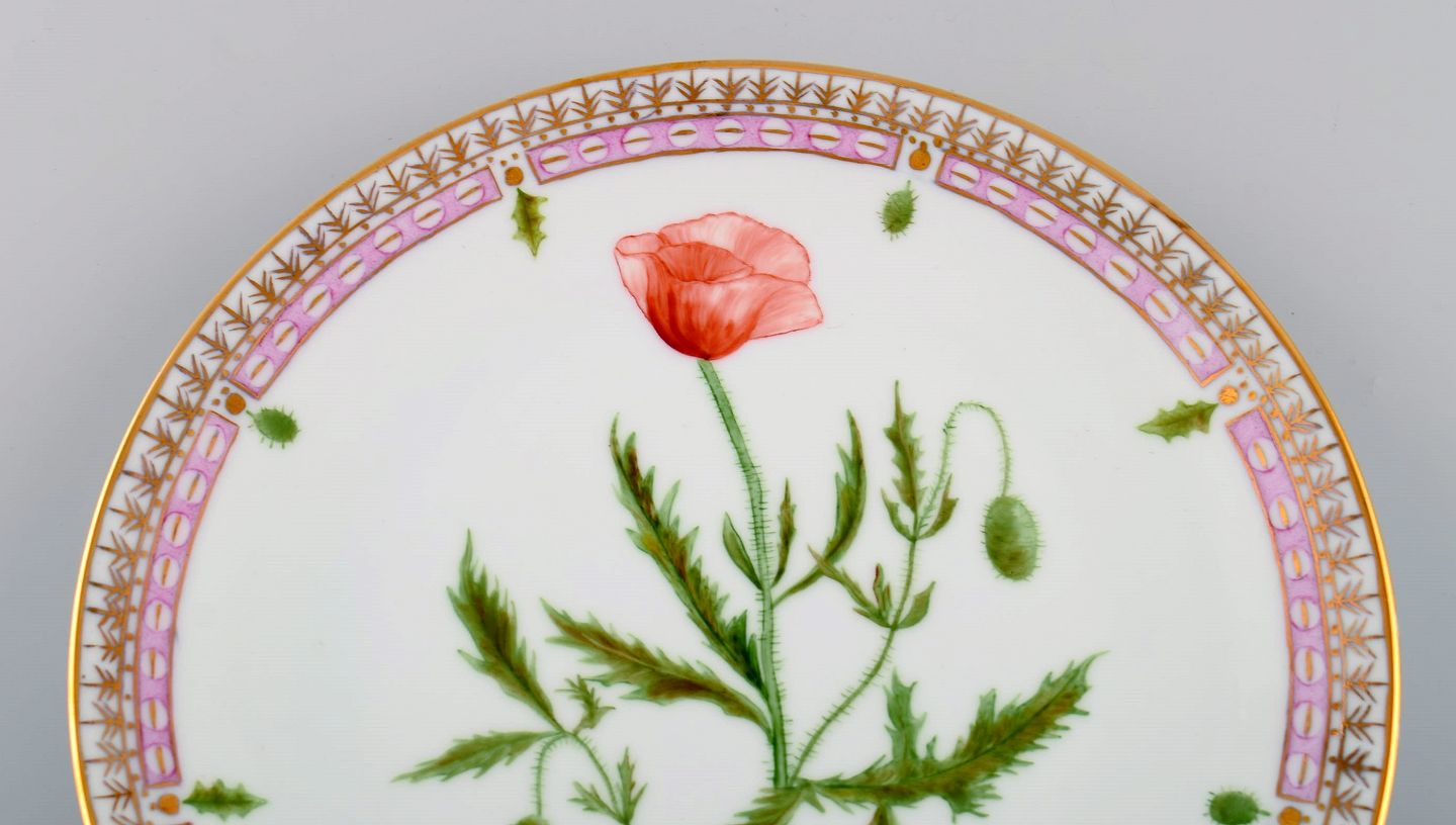 Middagstallerken i Flora Danica stil. Håndmalede blomster og gulddekoration. Midt 1900-tallet. Diameter: 24,6 cm. I flot stand. Signeret.