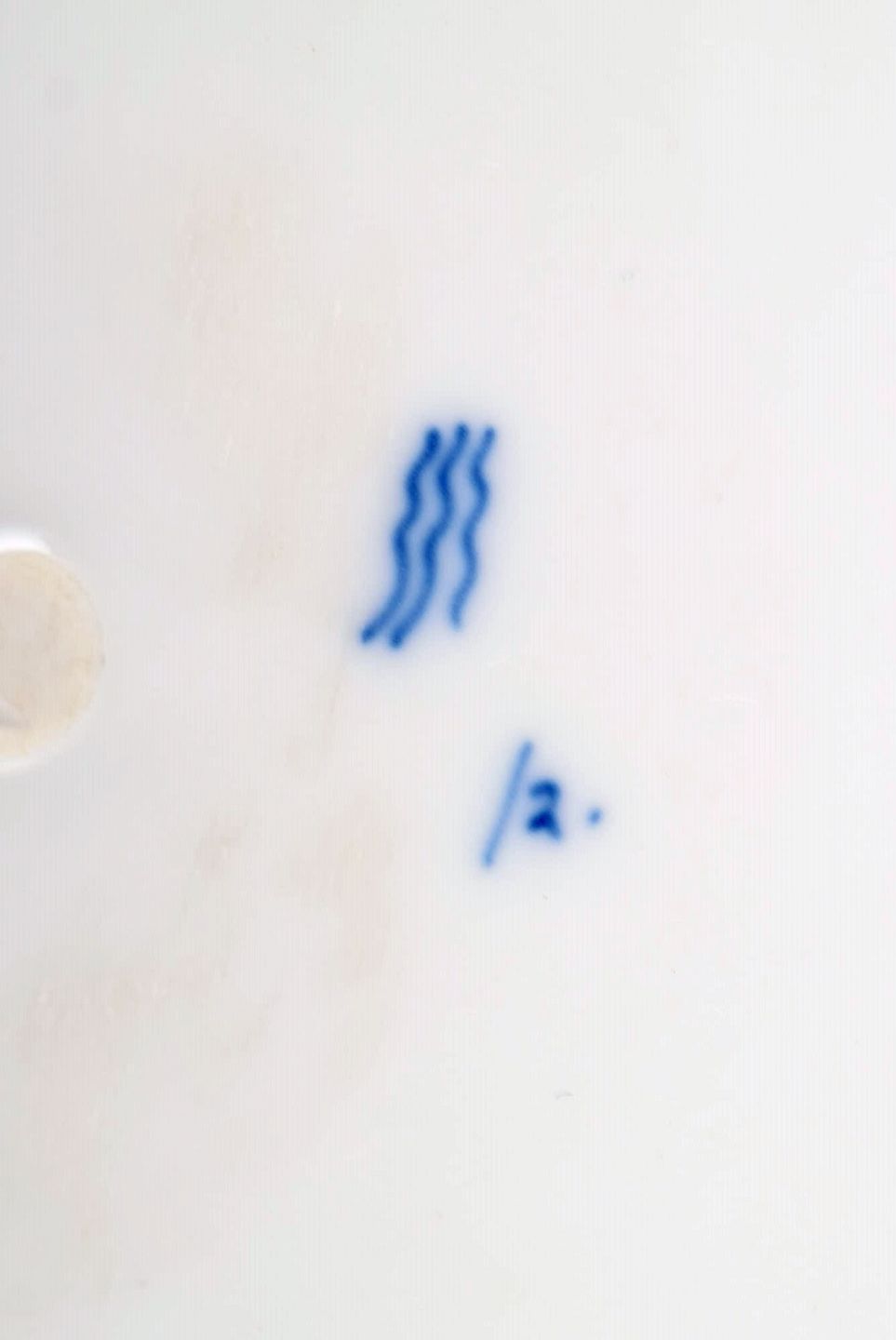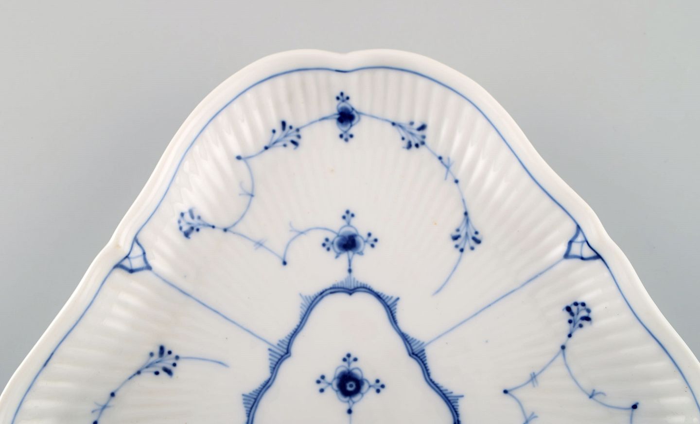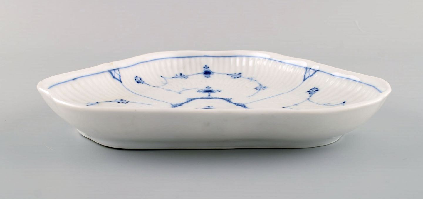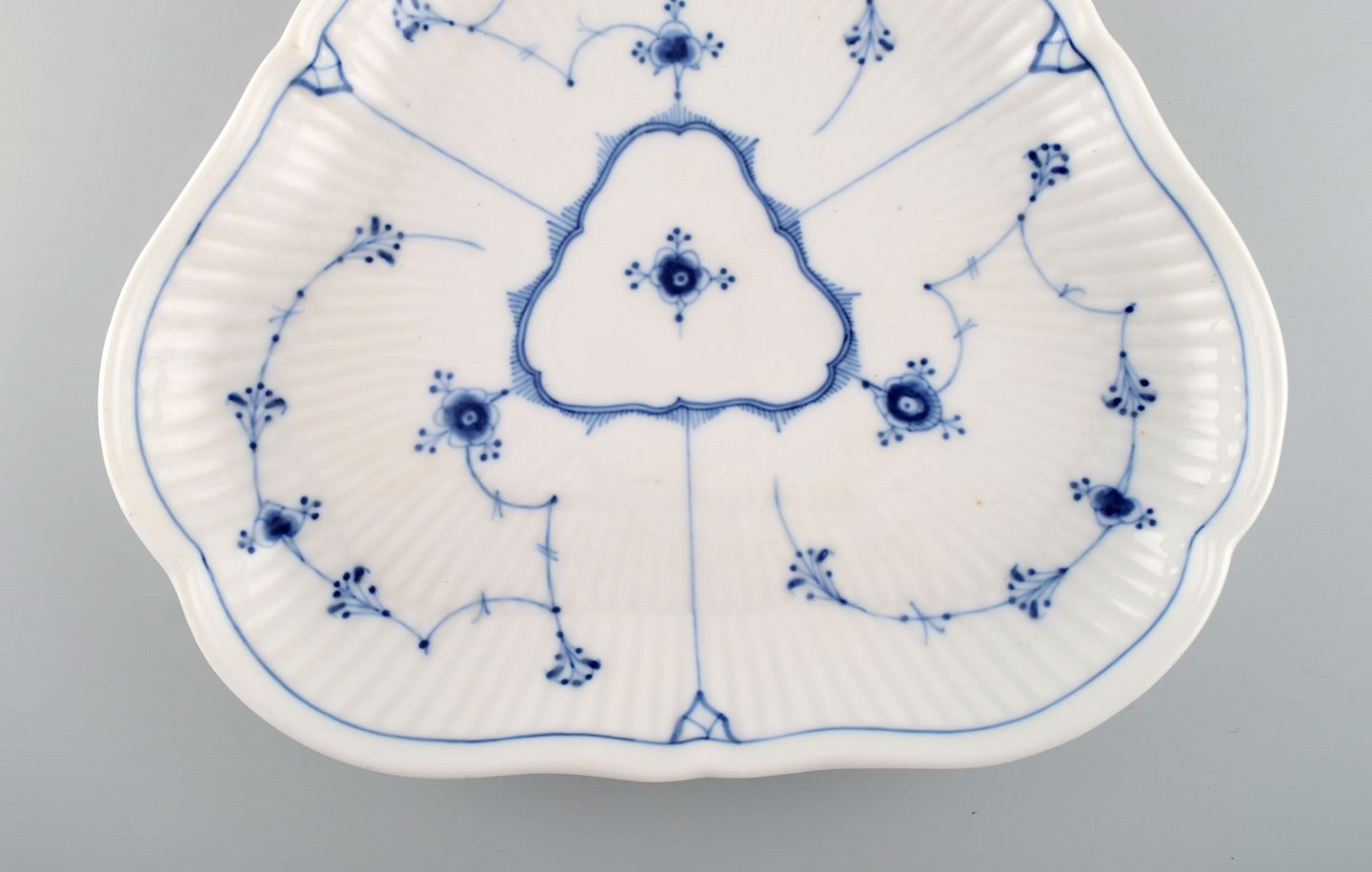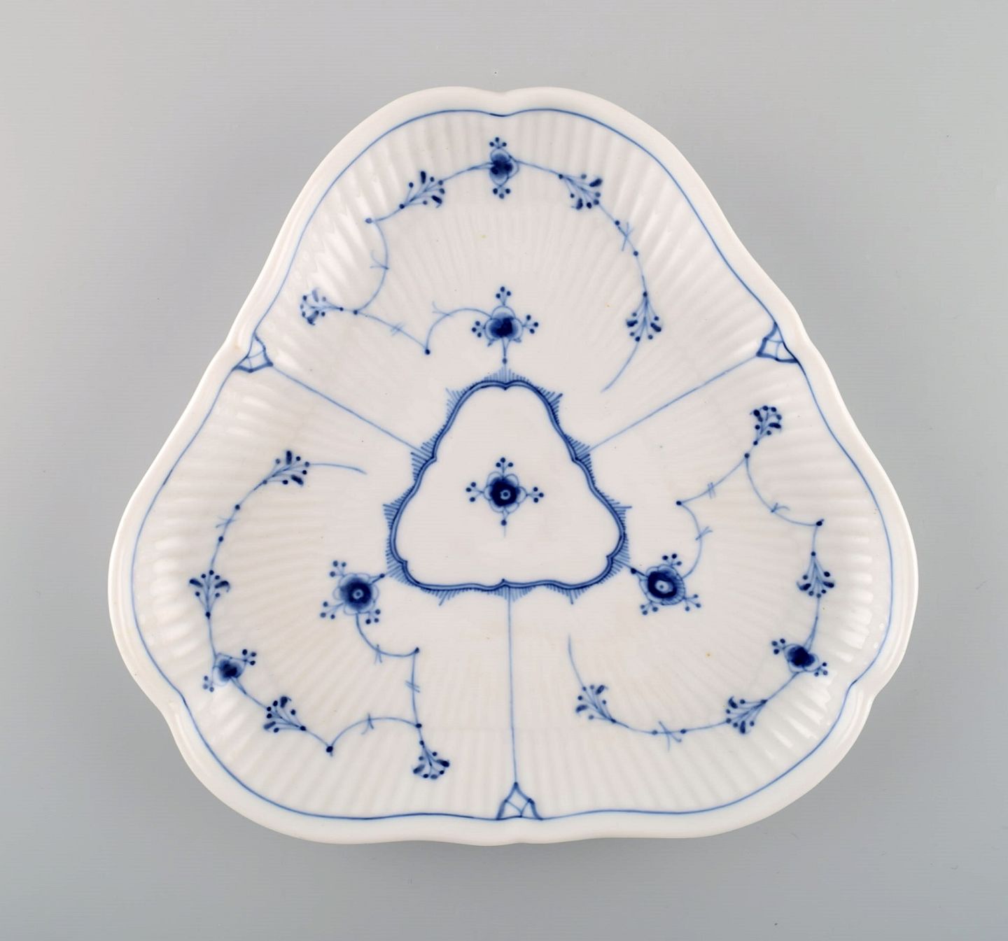 Antikt trekantet Royal Copenhagen Musselmalet Riflet fad. Midt 1800-tallet. Måler: 23 x 3,3 cm. I flot stand. 1. sortering. Stemplet.