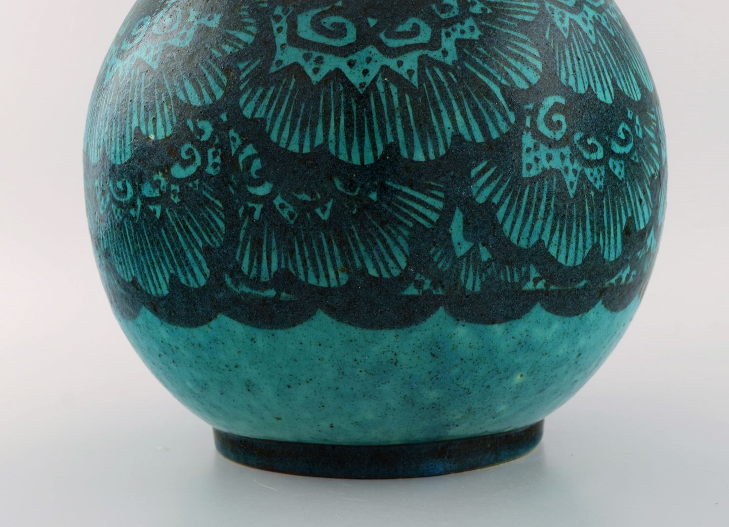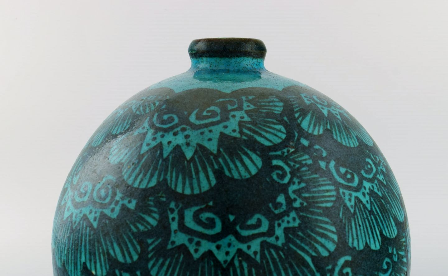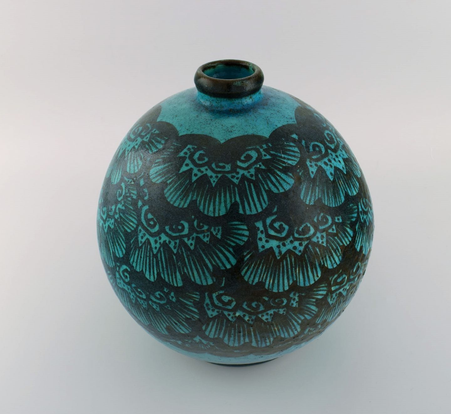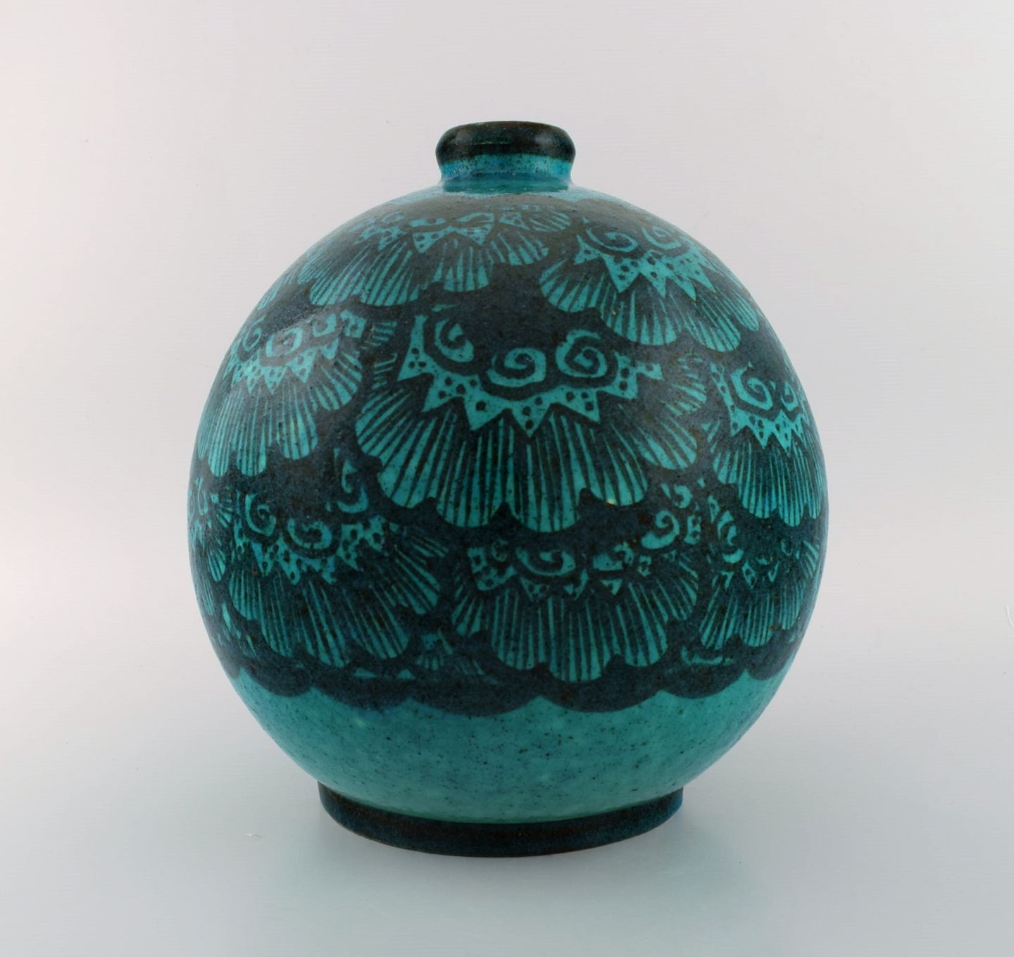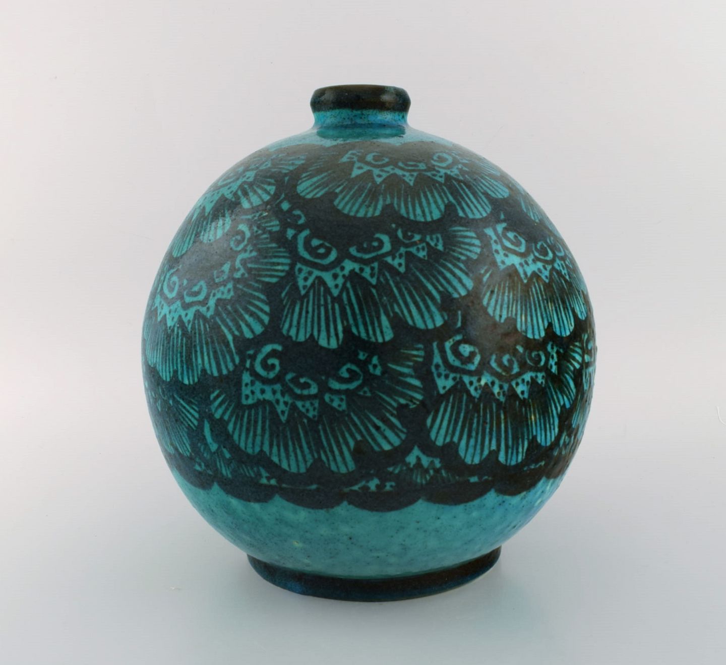 Edmond Lachenal (1855-1948), Frankrig. Stor rund unika vase i håndmalet glaseret keramik. Smuk glasur i turkis nuancer. 1920/30'erne.