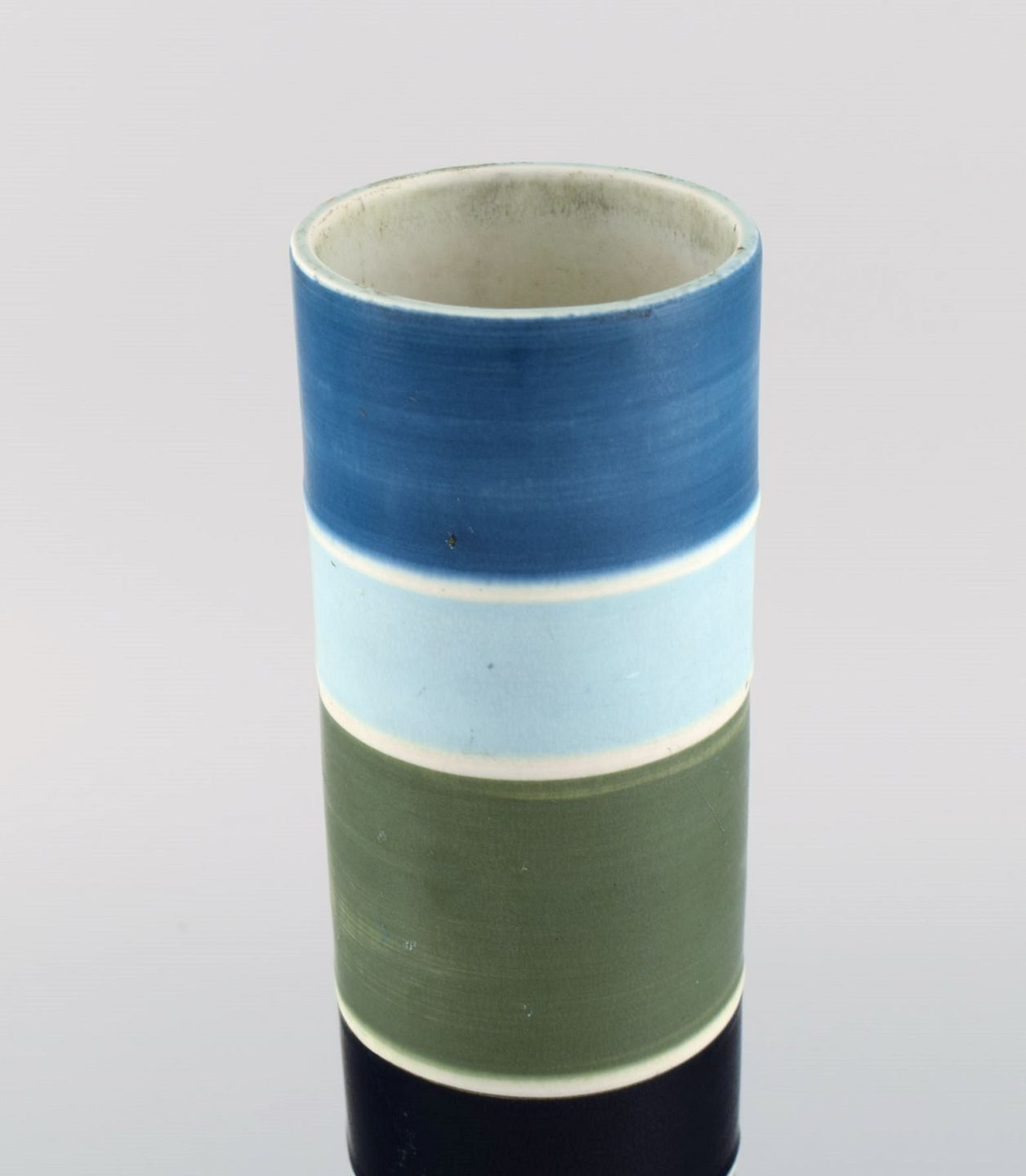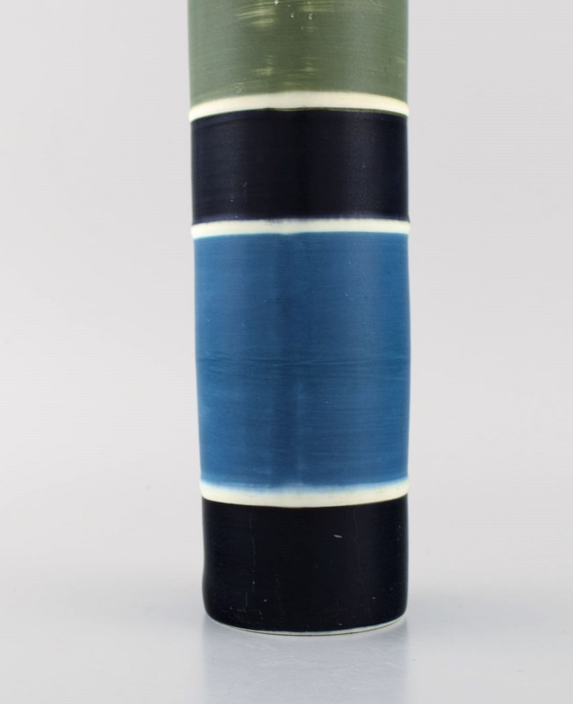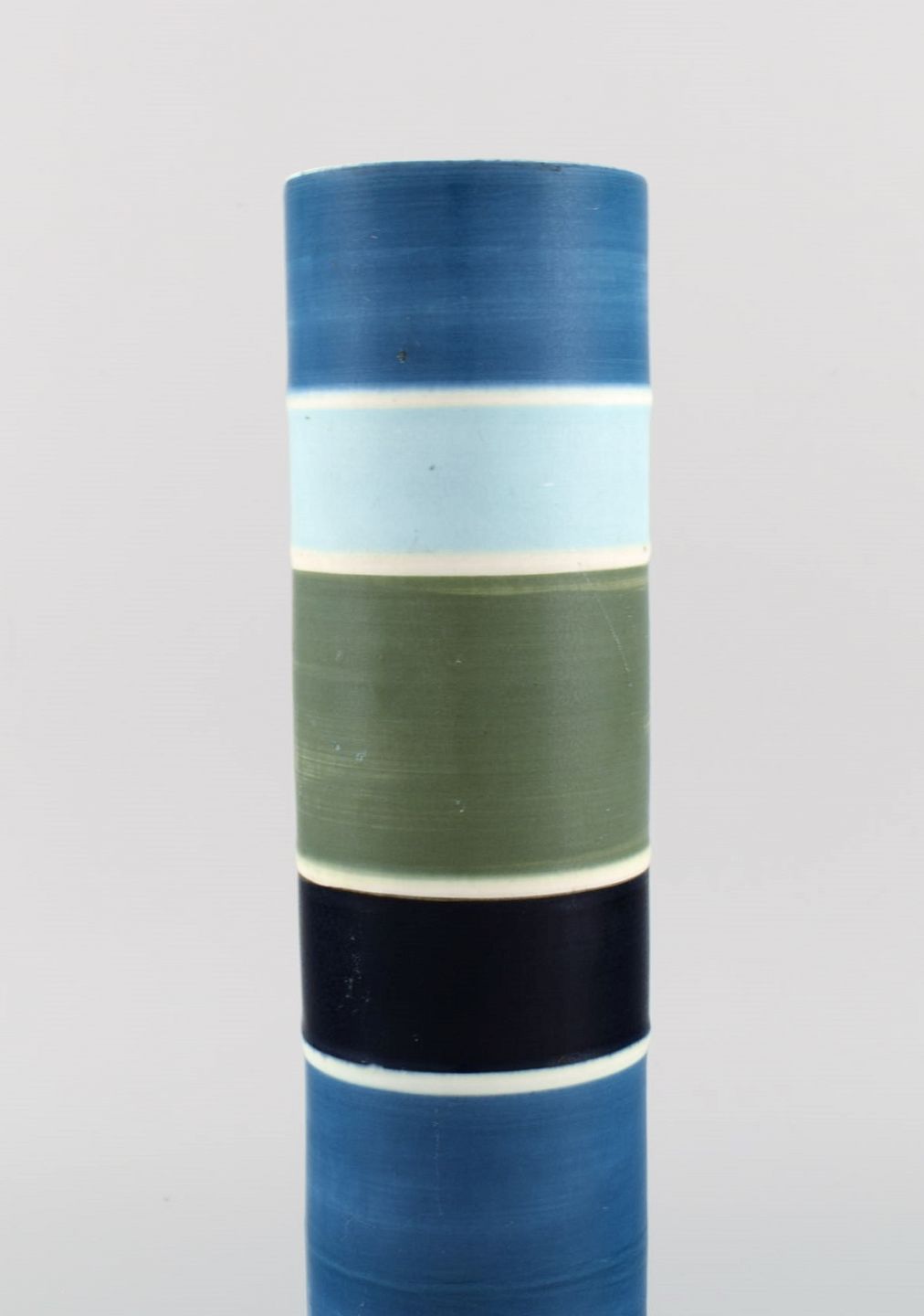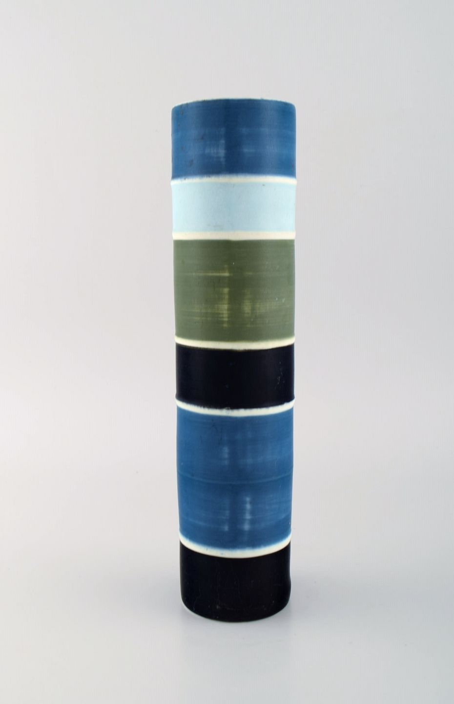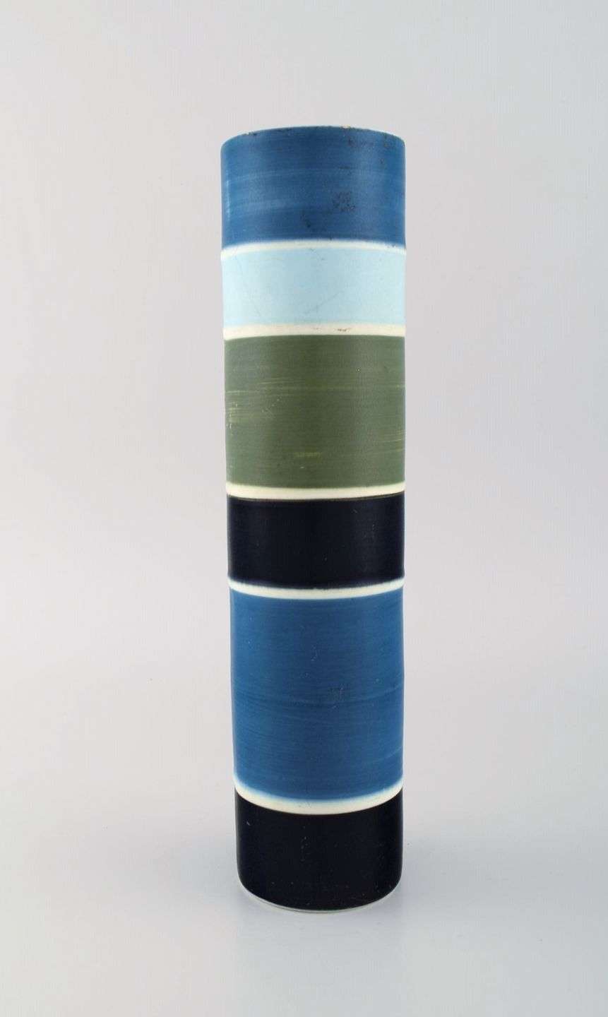 Carl-Harry Stålhane for Rörstrand. Stor cylindrisk Tema vase i glaseret keramik. Stribet design. Midt 1900-tallet.