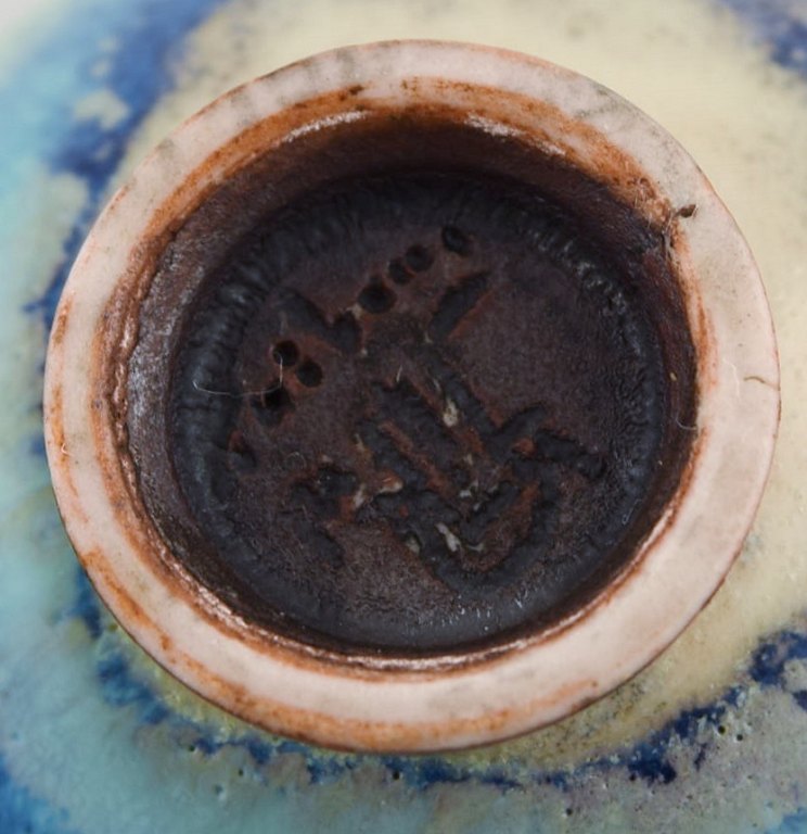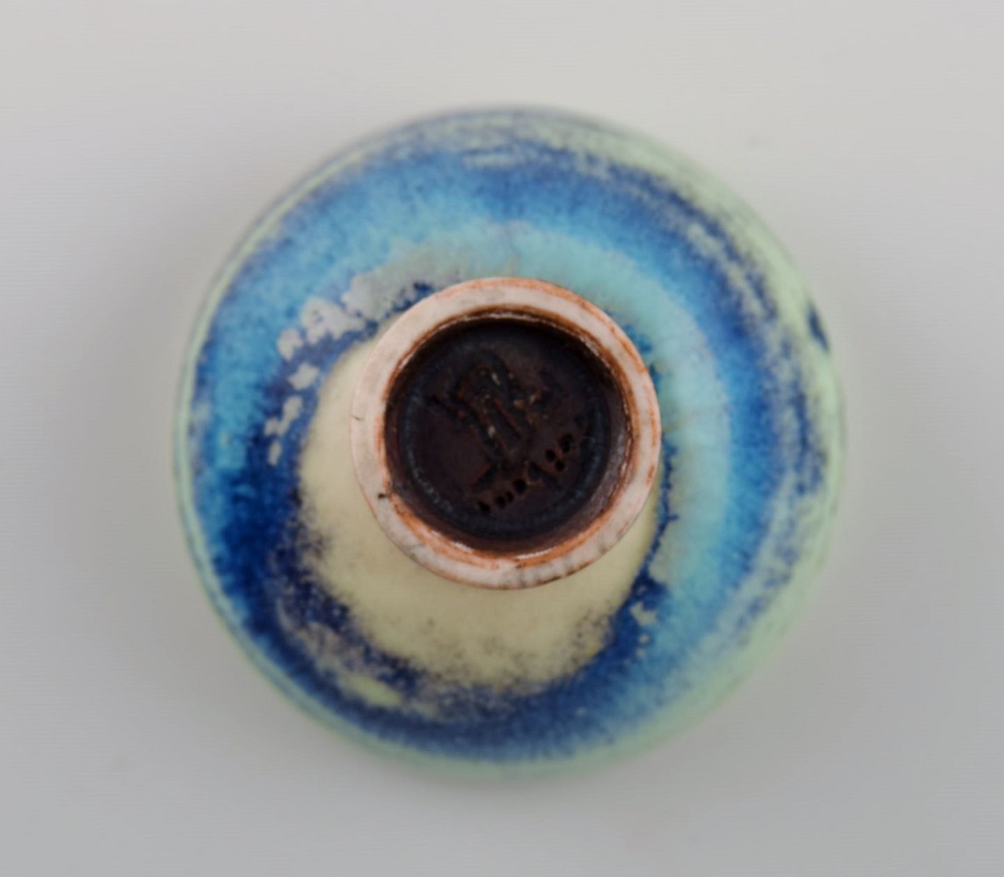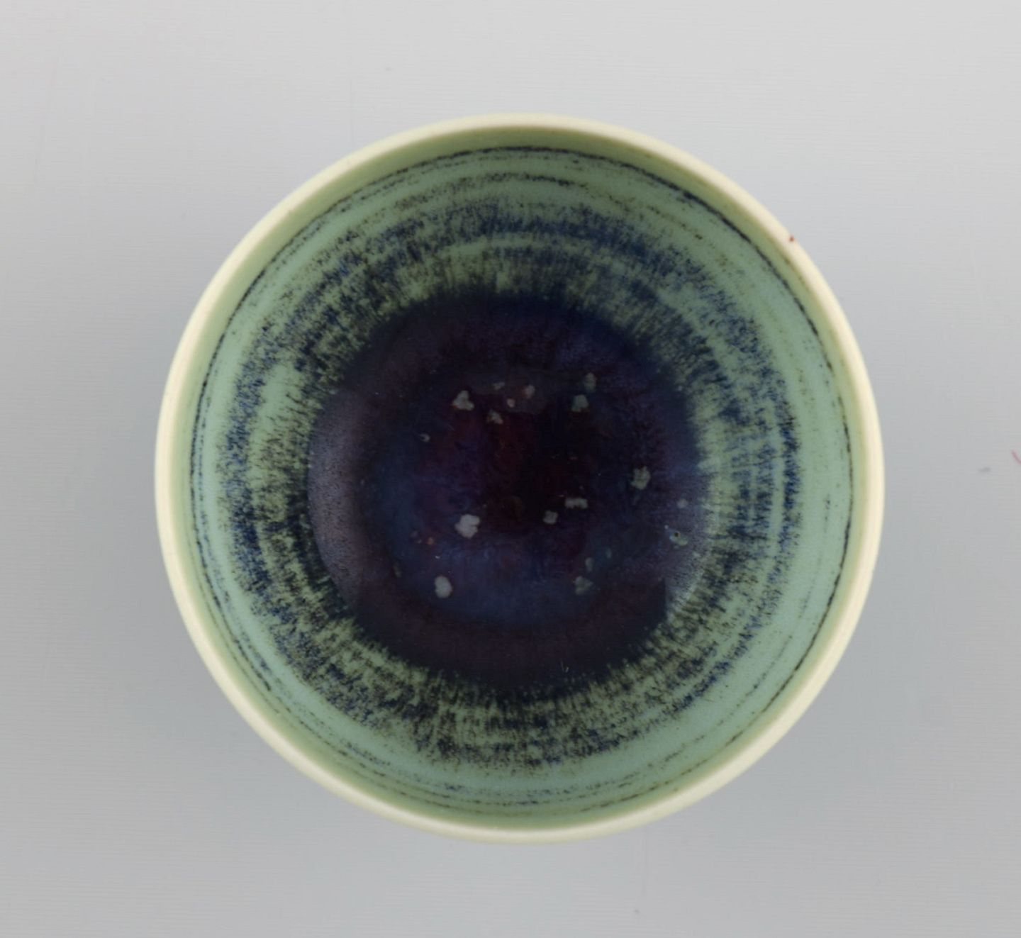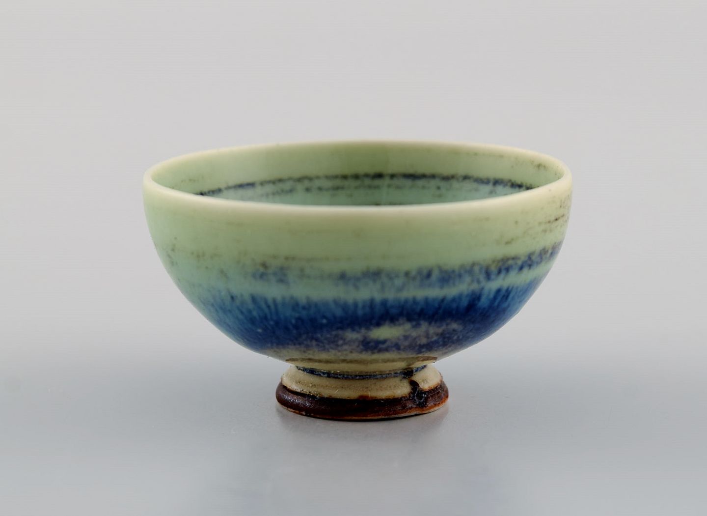 Berndt Friberg (1899-1981) for Gustavsberg Studiohand. Miniature skål i glaseret stentøj. Smuk glasur i blågrønne nuancer. 1960'erne. Måler: 4,5 x 2,5 cm. I flot stand. Signeret.
