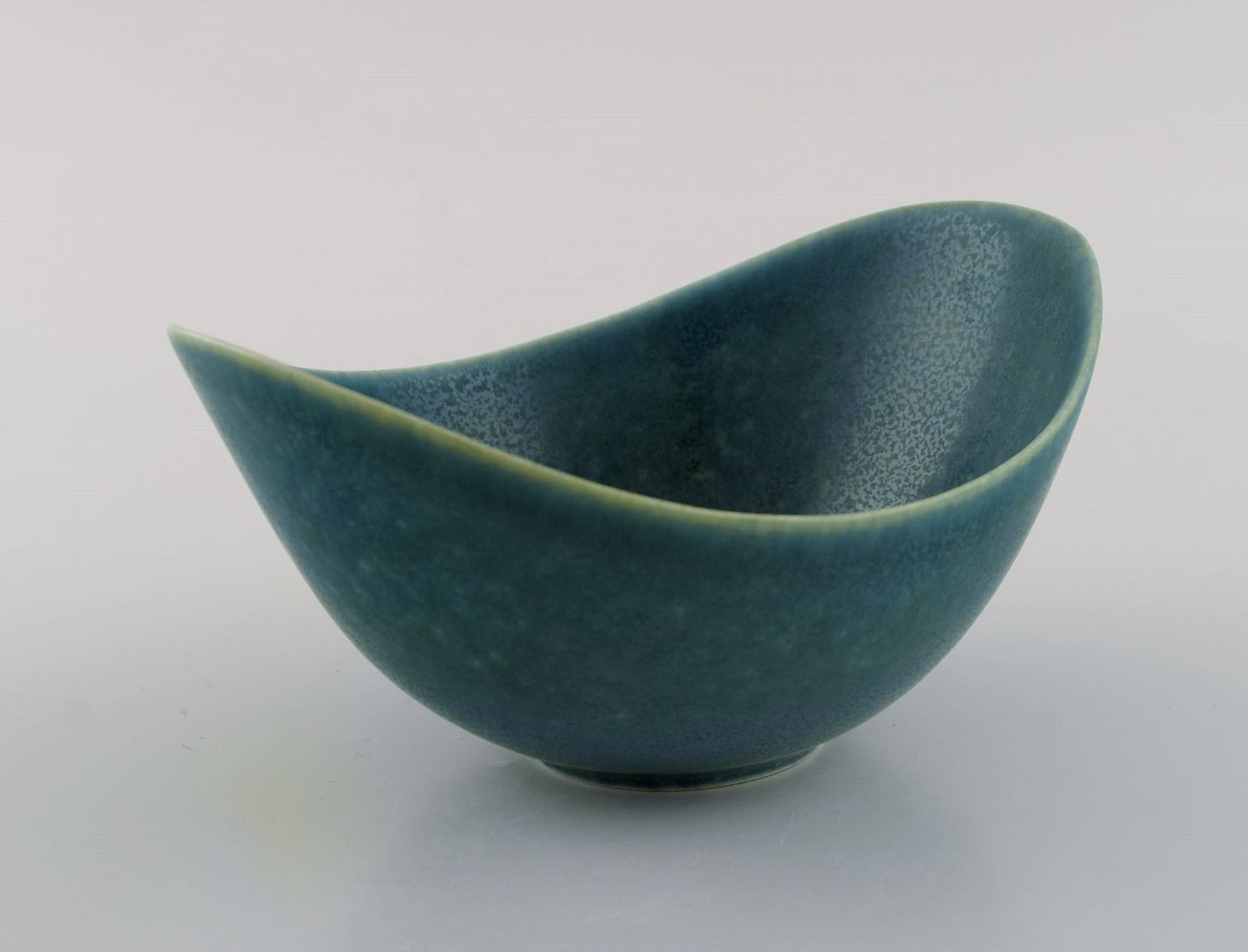 Gunnar Nylund for Rörstrand. Skål i glaseret keramik. Smuk spættet glasur i blågrønne nuancer. 1960'erne. Måler: 16 x 8,3 cm. I flot stand. Stemplet. 2. Sortering