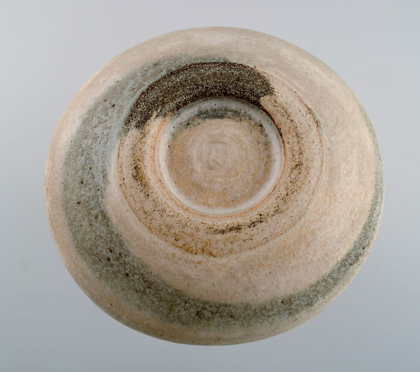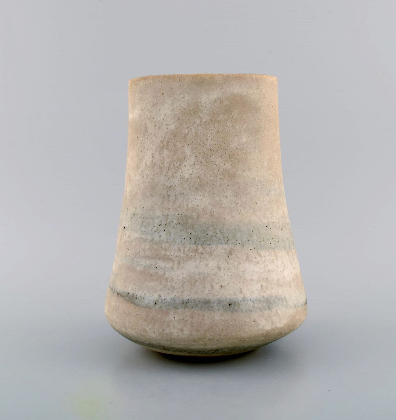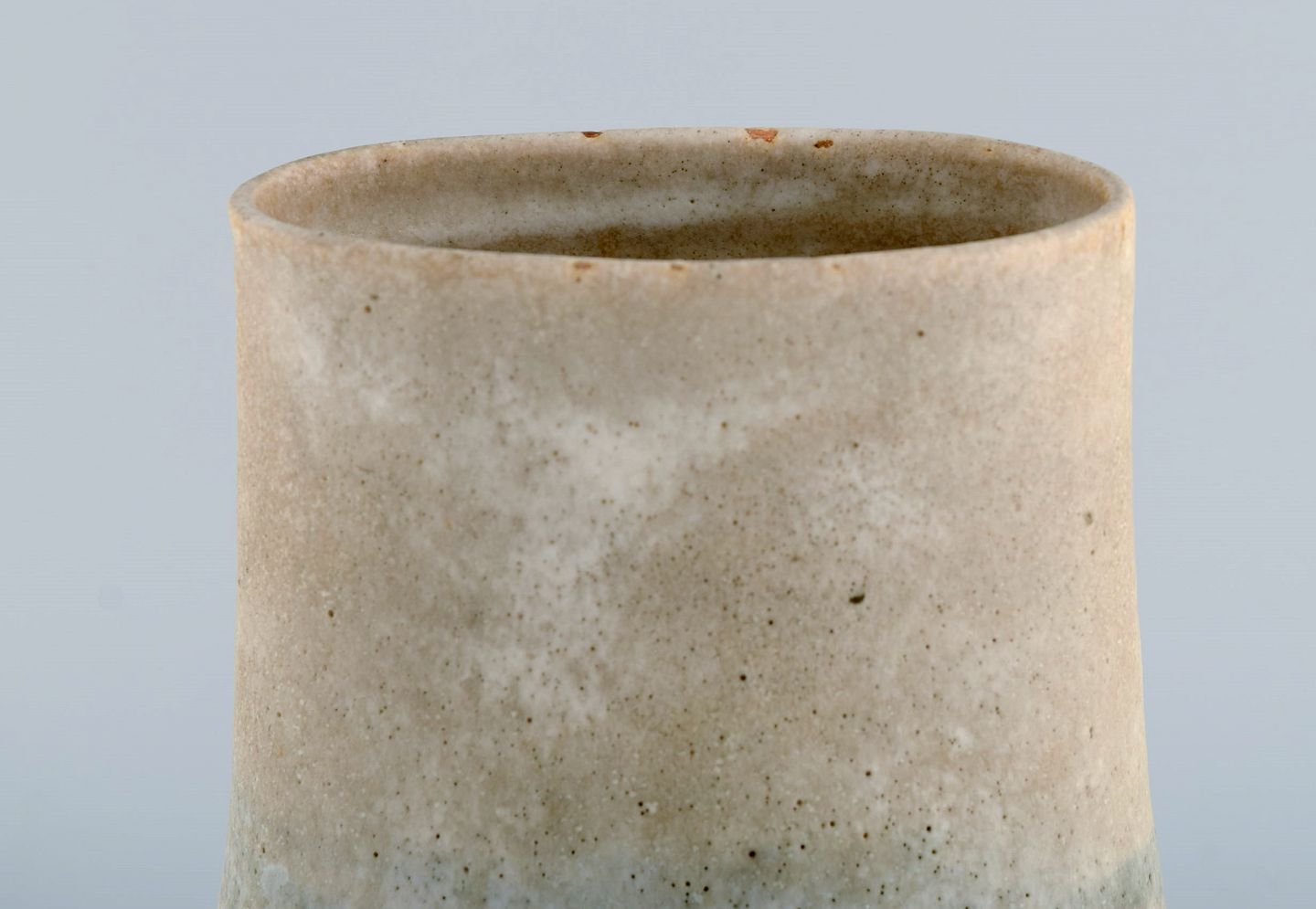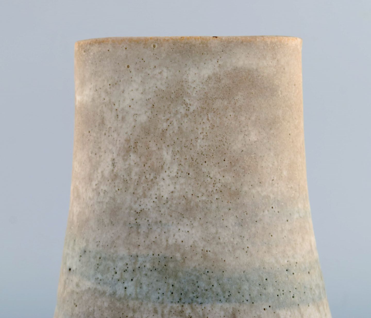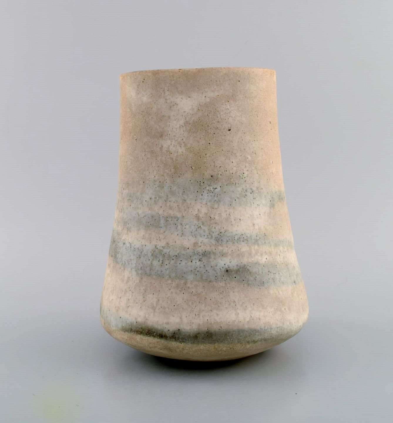 Lucie Rie (f. 1902, d. 1995), østrigsk-født britisk keramiker. Stor modernistisk unika vase i glaseret stentøj. Smuk glasur i sand nuancer. Eget værksted, ca. 1970.