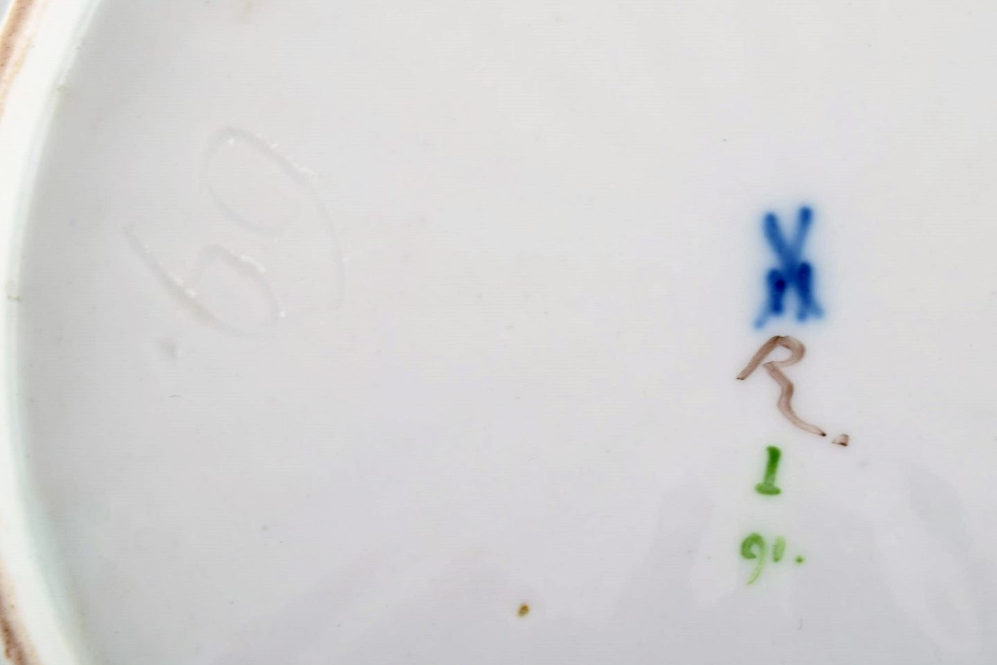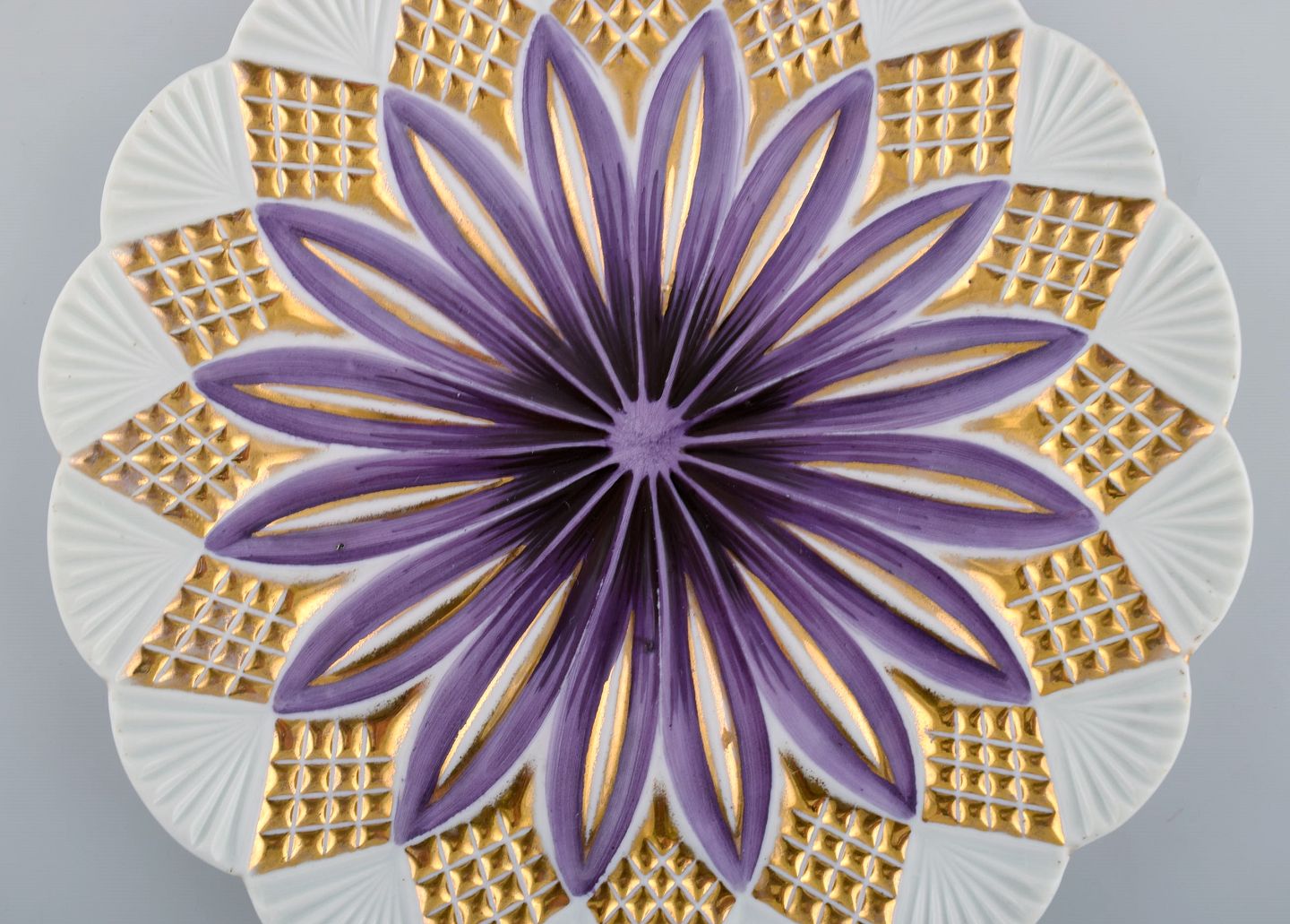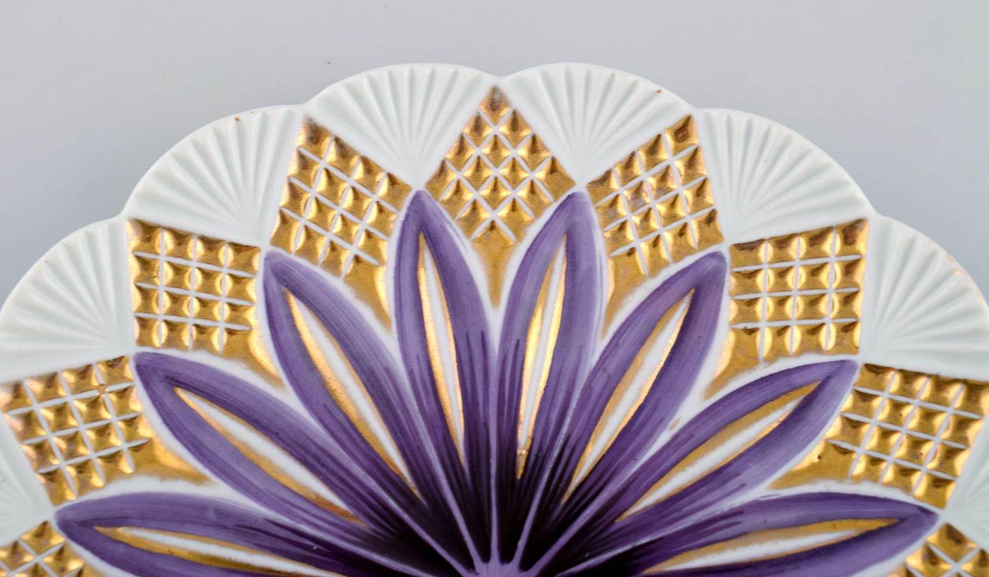 Antik Meissen tallerken i håndmalet porcelæn. Lilla blomst og gulddekoration. Tidligt 1900-tallet. Diameter: 21,5 cm. I flot stand. Stemplet. 1. Sortering.