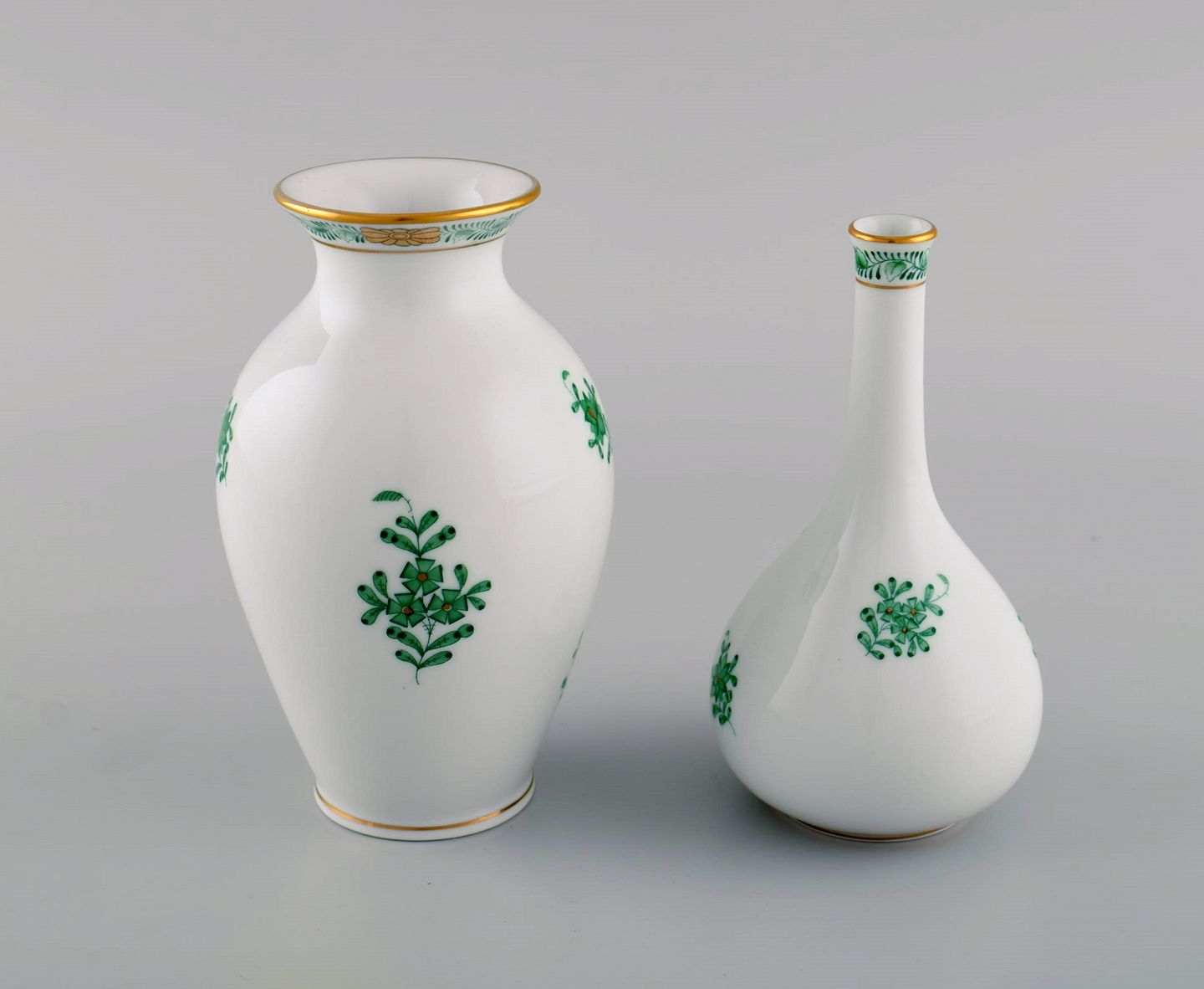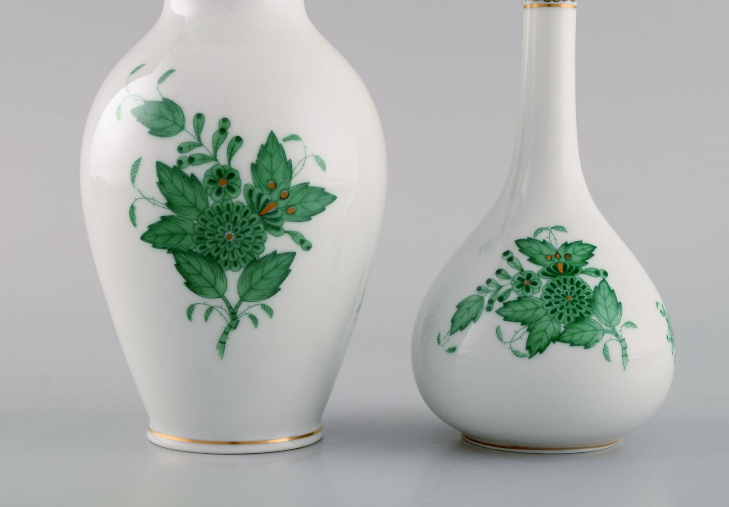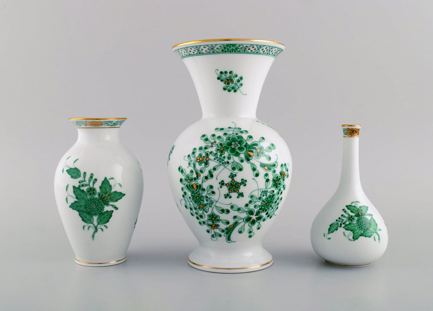Tre Herend Green Chinese vaser i håndmalet porcelæn. Midt 1900-tallet. Største måler: 20,8 x 12 cm Mindste måler: 13 x 7,5 cm. I flot stand. Stemplet.