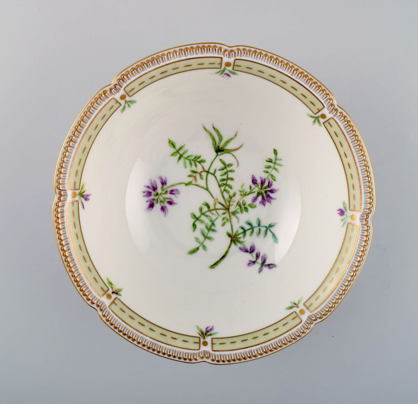 Porcelænsskål med håndmalede blomster og gulddekoration. Flora Danica stil. Dateret 1979. Måler: 21 x 7 cm. I flot stand. Stemplet.