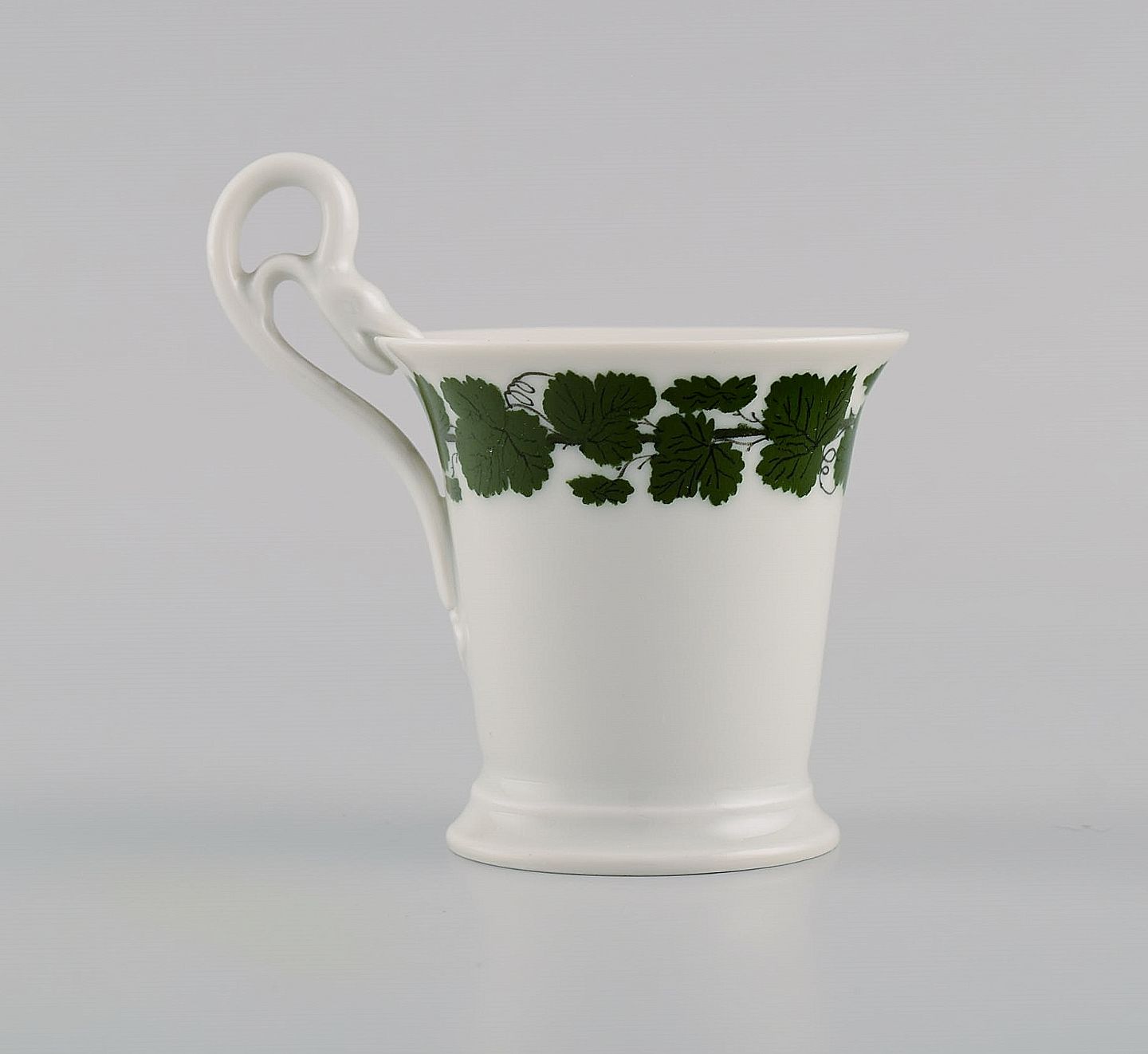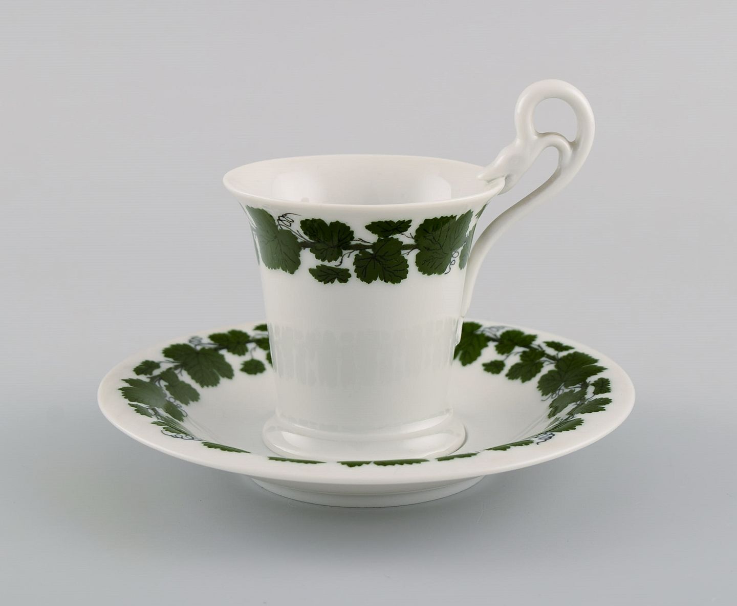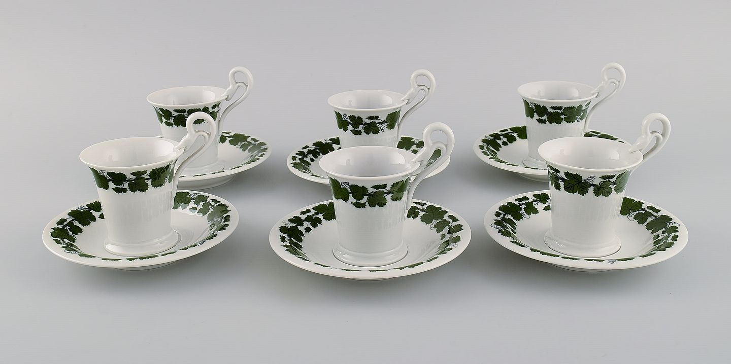 Seks Meissen Green Ivy Vine Leaf kaffekopper med underkopper i håndmalet porcelæn. 1900-tallet. Koppen måler: 6 x 6 cm (eks. hank) Underkop diameter: 12,5 cm. I flot stand. Stemplet. 1. Sortering.