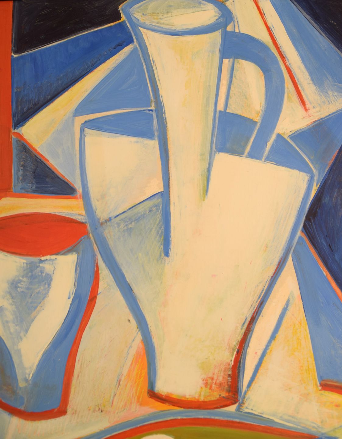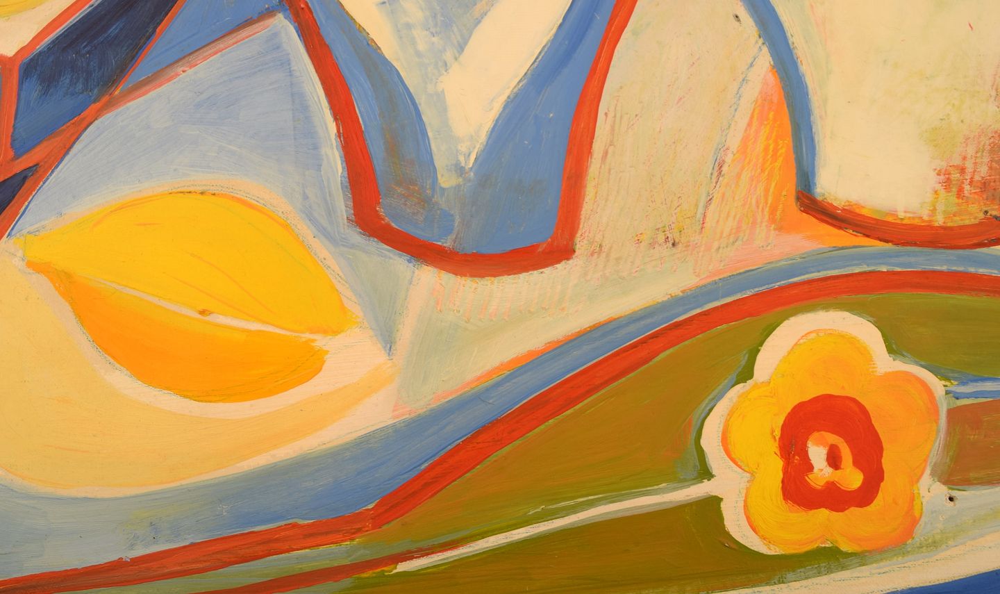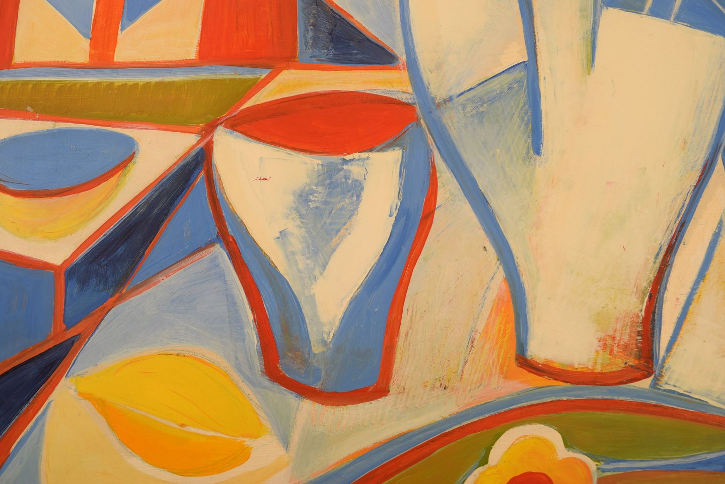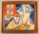 Skandinavisk modernist. Olie på lærred. Kubistisk opstilling. Dateret 1975. Lærredet måler: 59 x 51 cm. Rammen måler: 6 cm. I flot stand. Signeret og dateret.