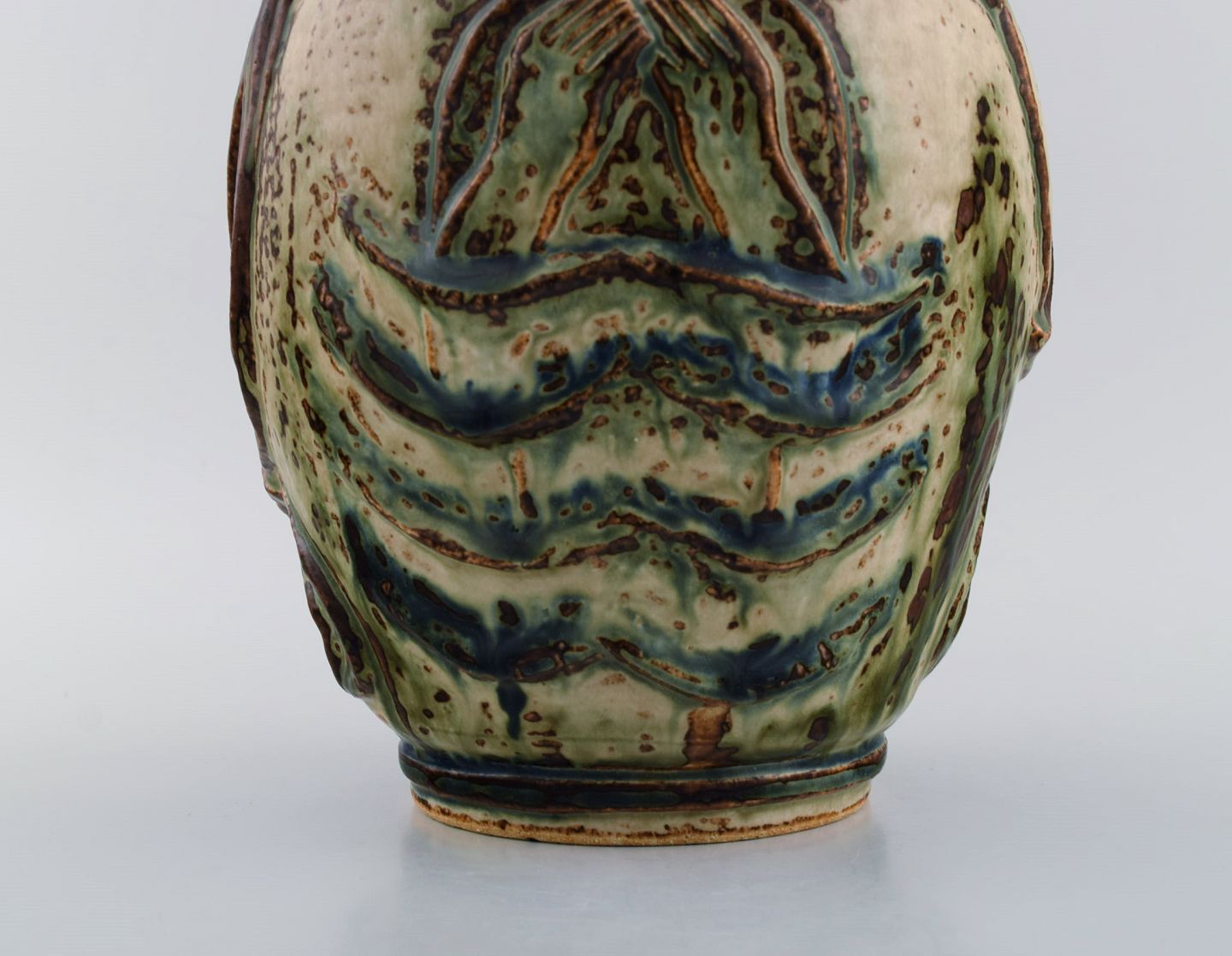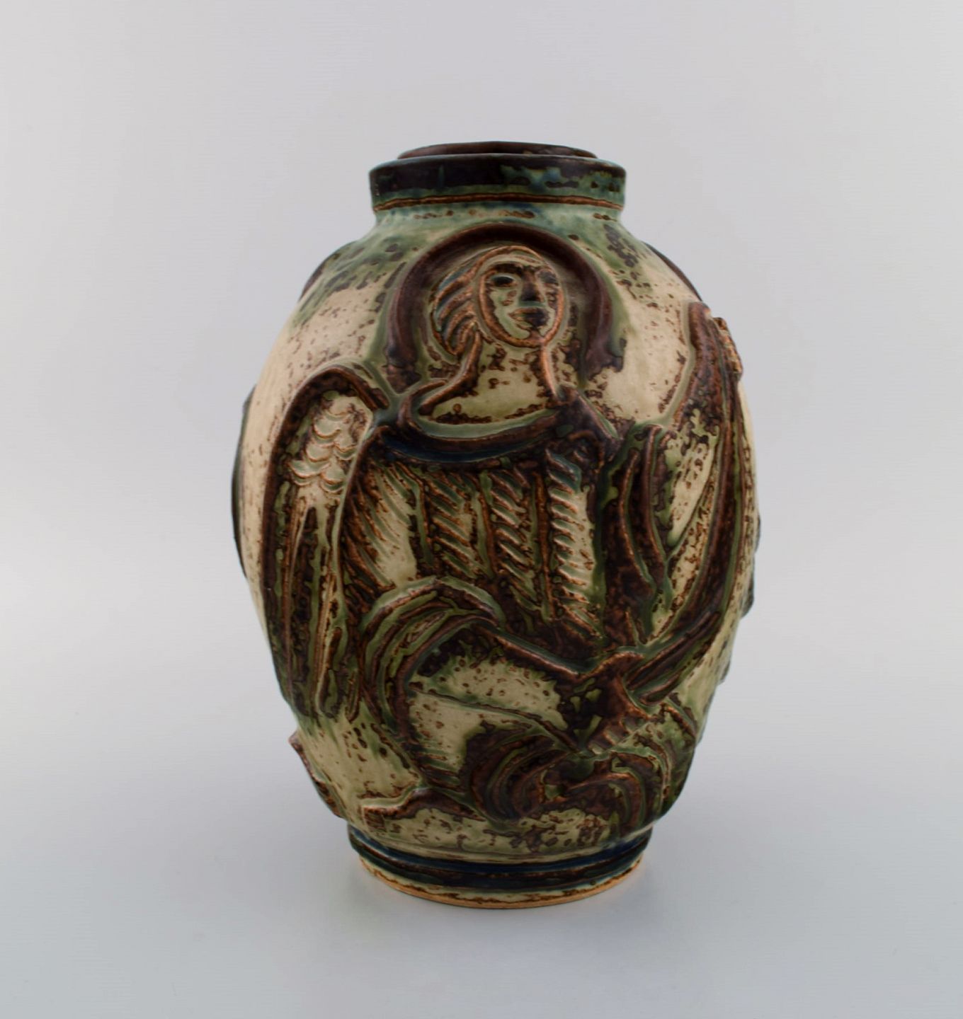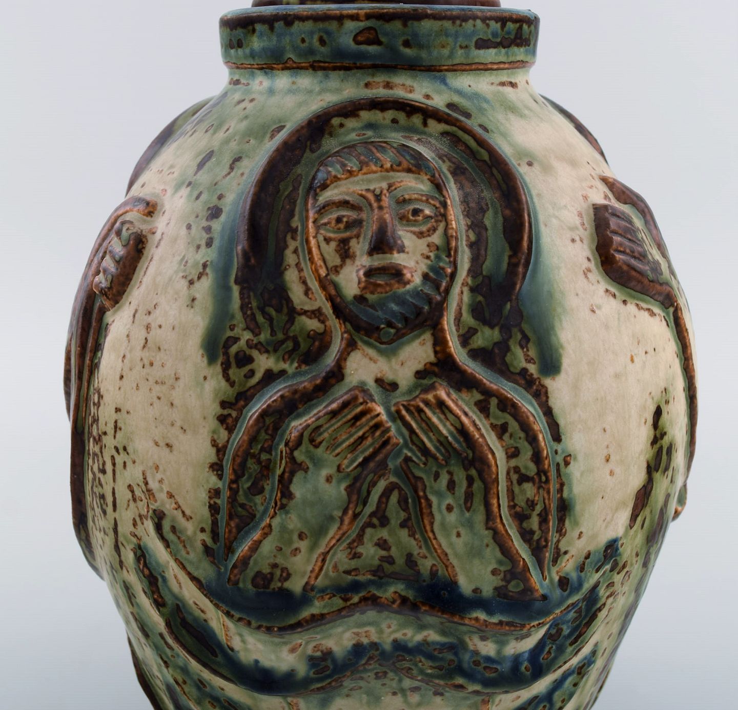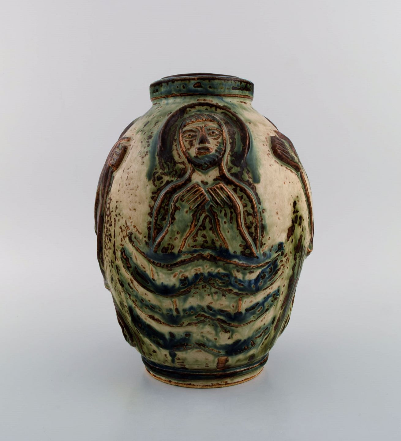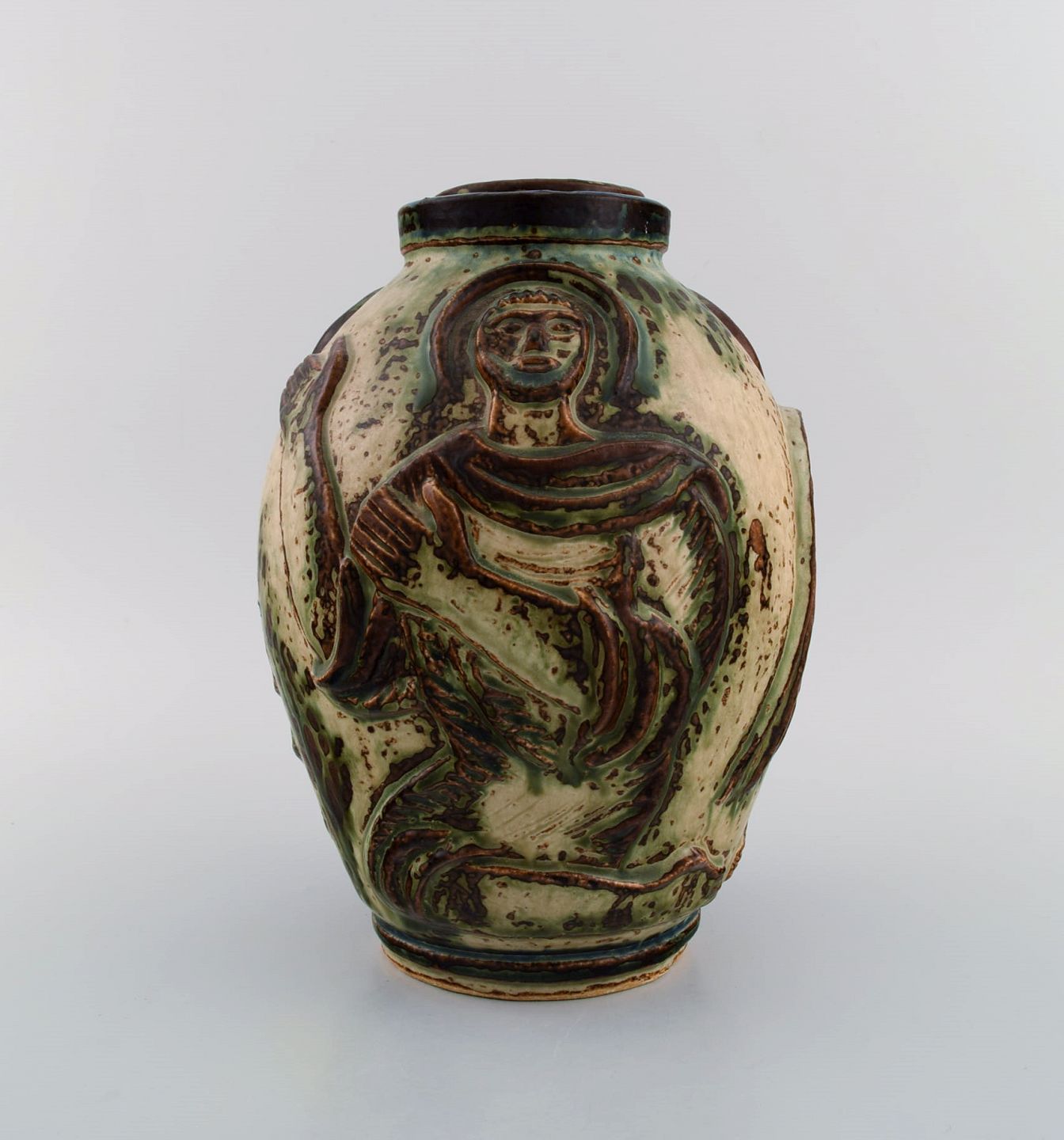 Jais Nielsen for Royal Copenhagen. Stor lågkrukke i glaseret keramik med bibelske motiver i relief. Modelnummer 3301. Smuk sung glasur. 1930/40'erne. Måler: 27 x 20 cm. I flot stand. Stemplet. 1. Sortering.