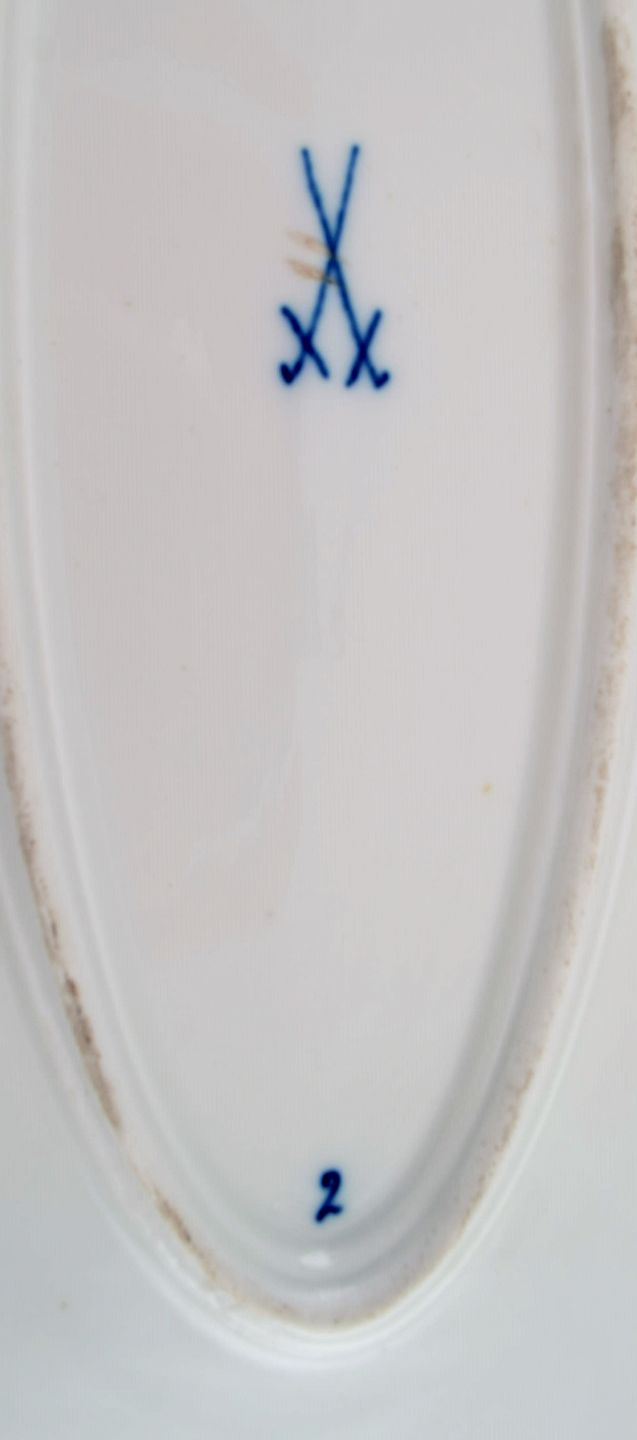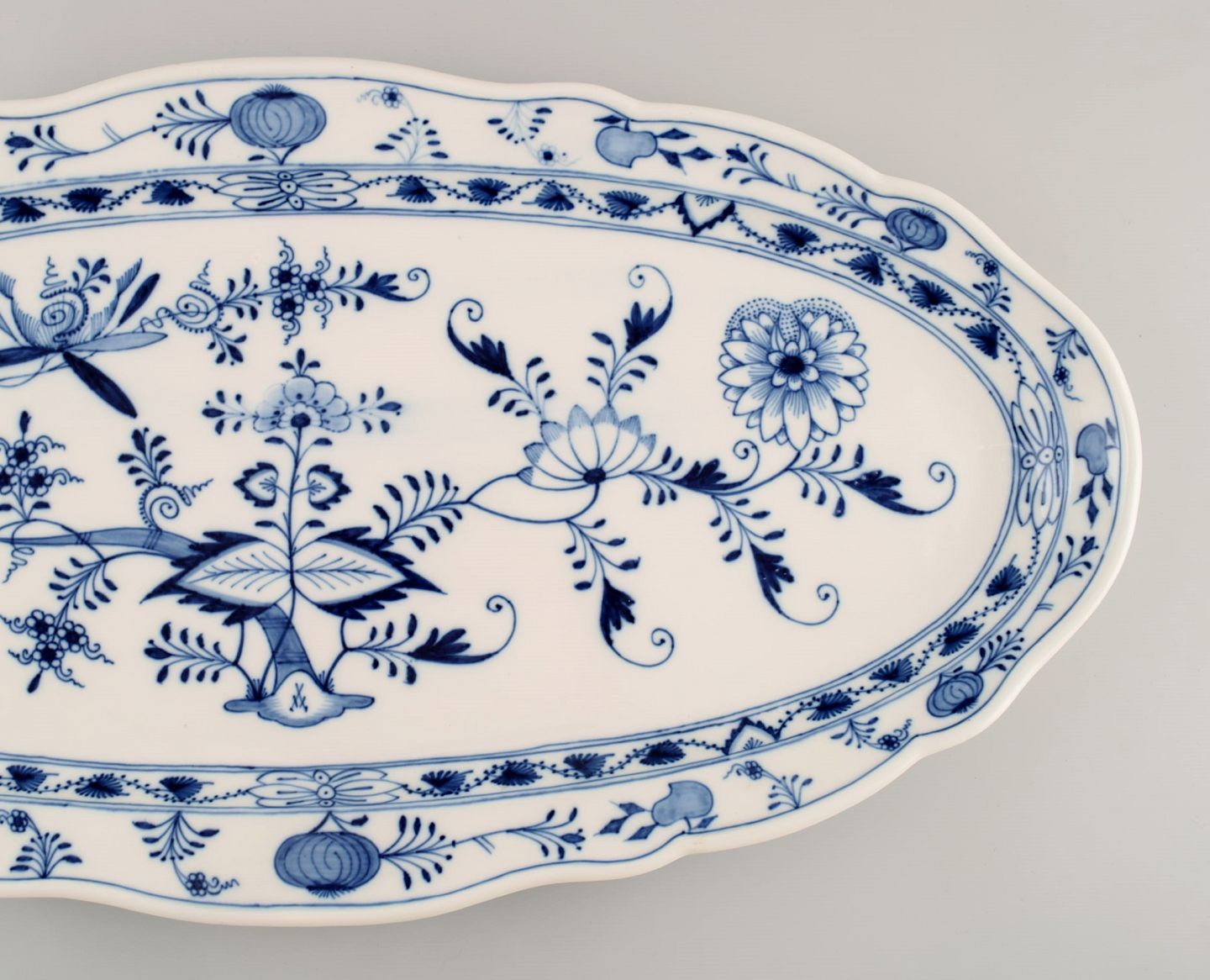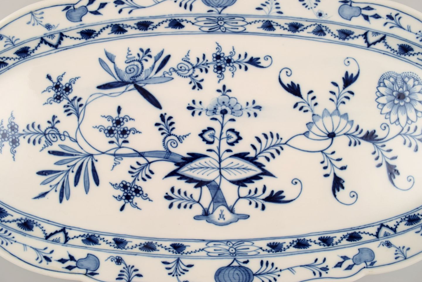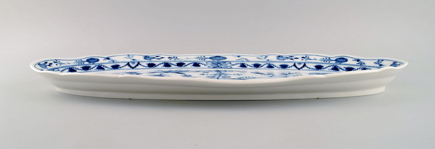 Kolossalt Meissen Løgmønstret fiskefad i håndmalet porcelæn. Tidligt 1900-tallet. Måler: 55 x 27,5 x 4,5 cm. I flot stand. Stemplet. 3. Sortering.