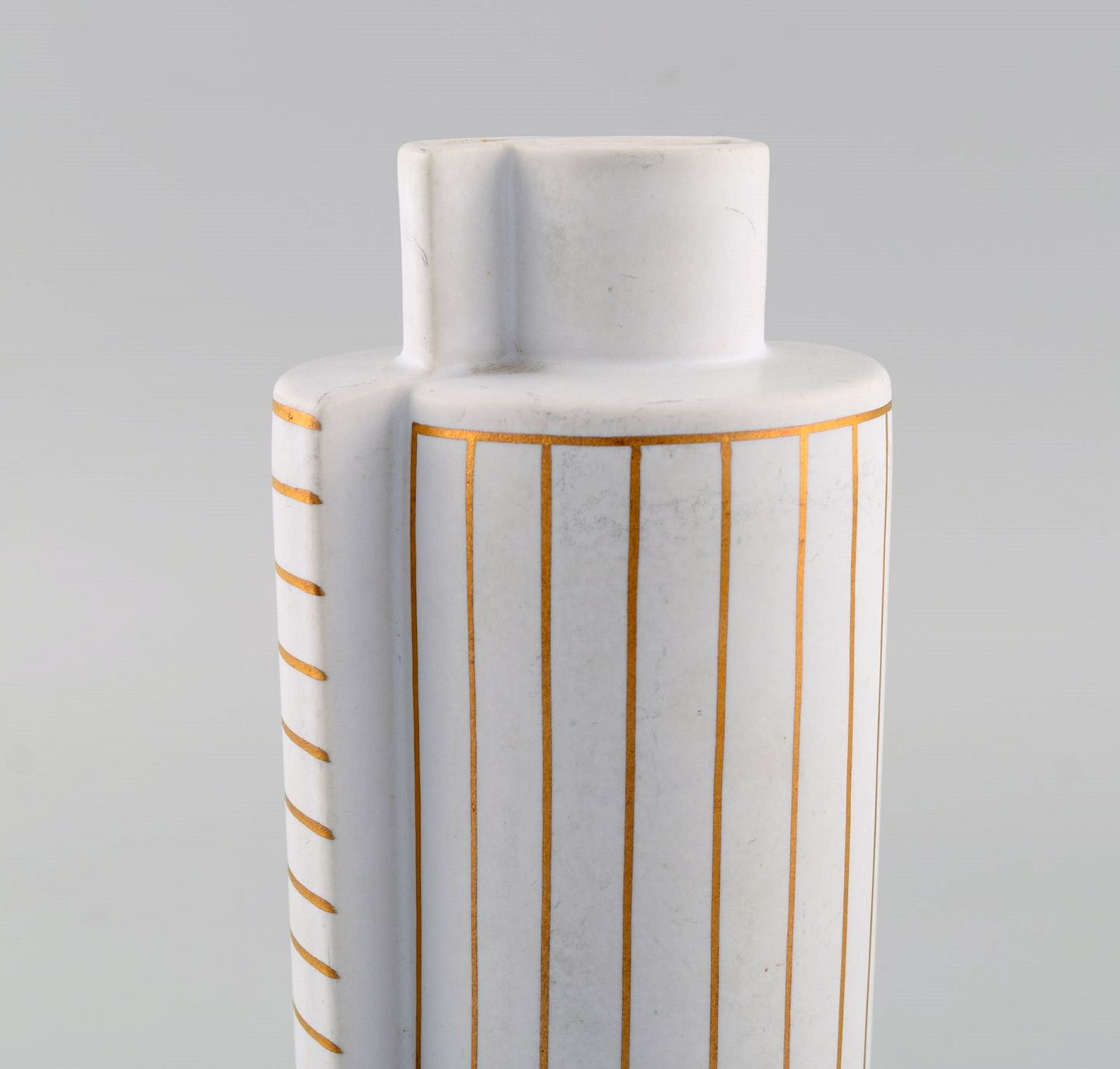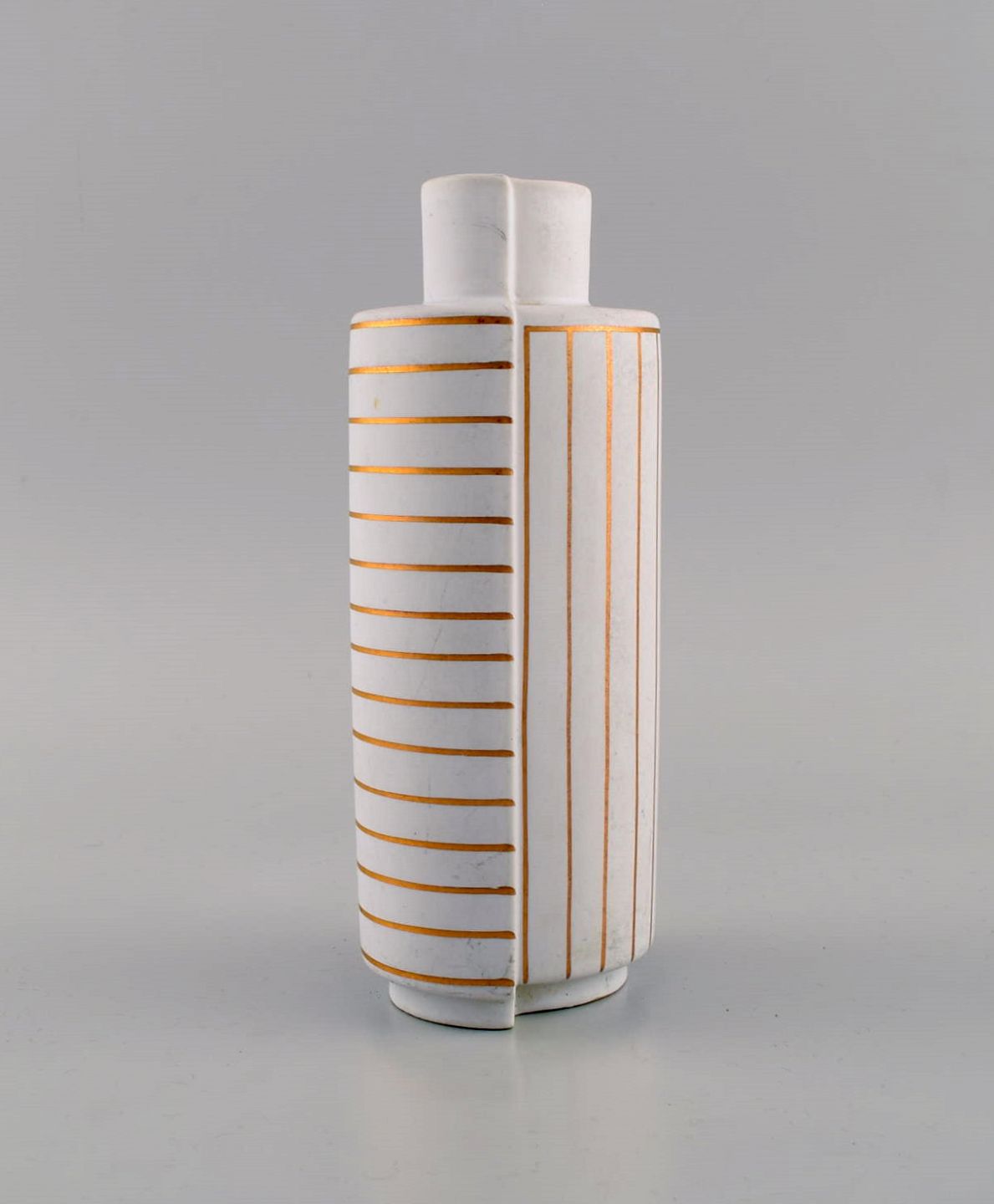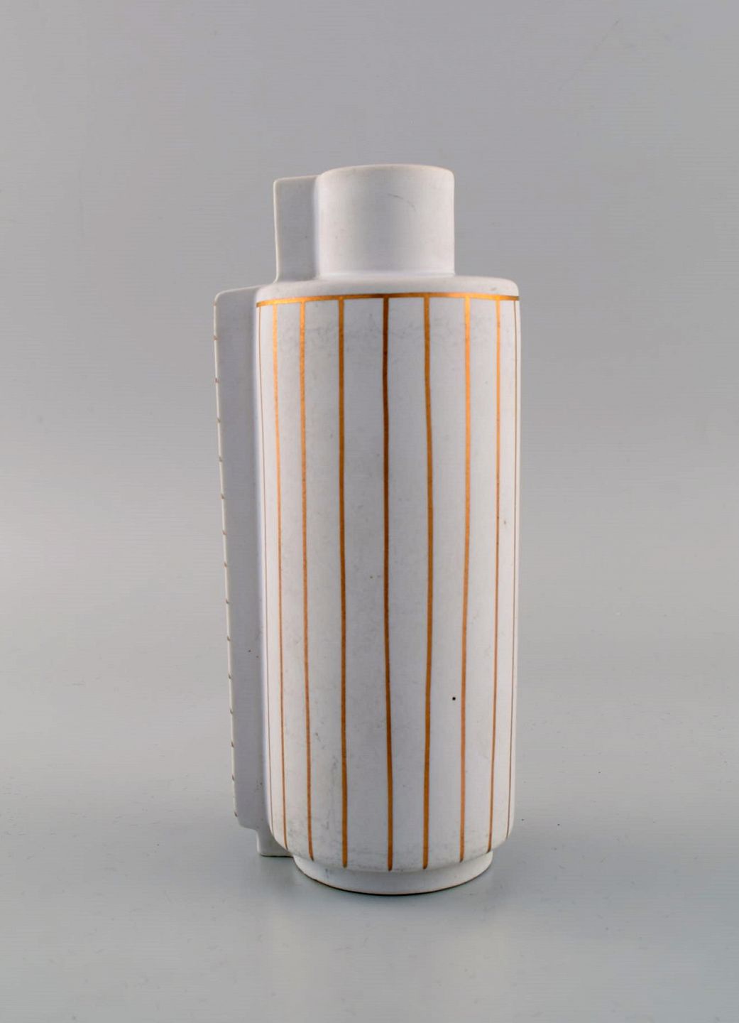 Wilhelm Kåge for Gustavsberg Studio Hand. Guldsurrea keramik dobbeltvase i mat hvid carrara-glasur med horisontale og vertikale guldstriber. Ikonisk og surrealistisk design. Surrea serien blev designet i 1936.